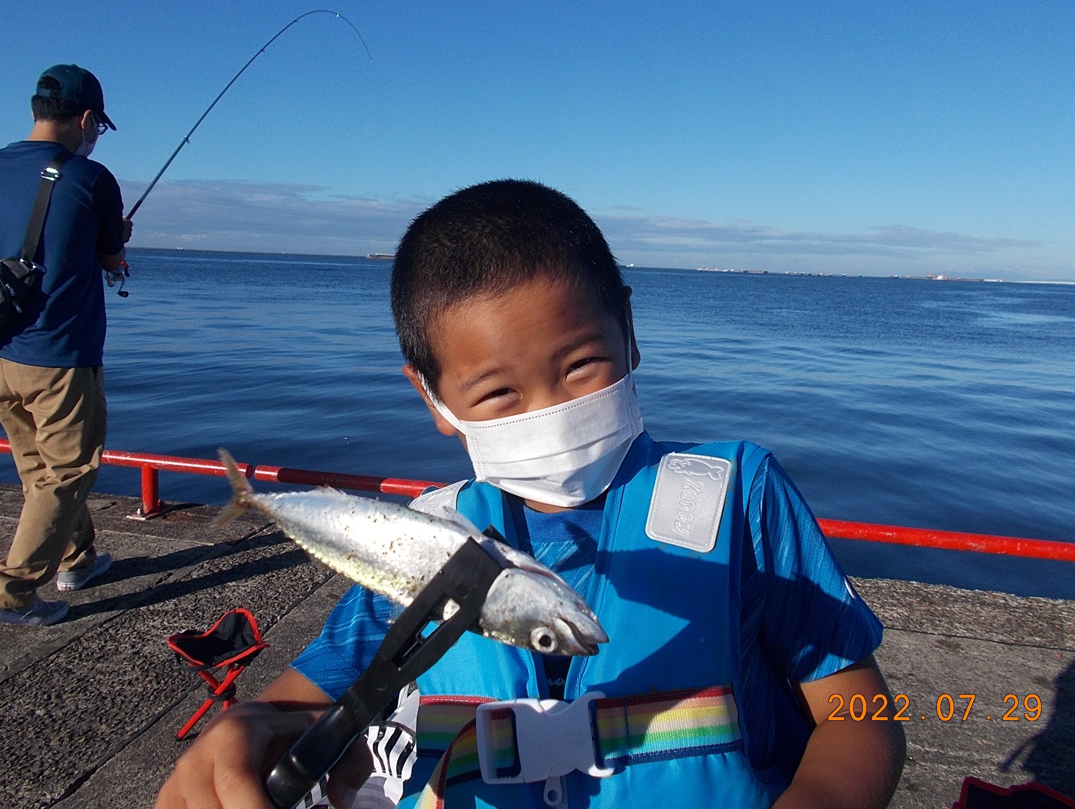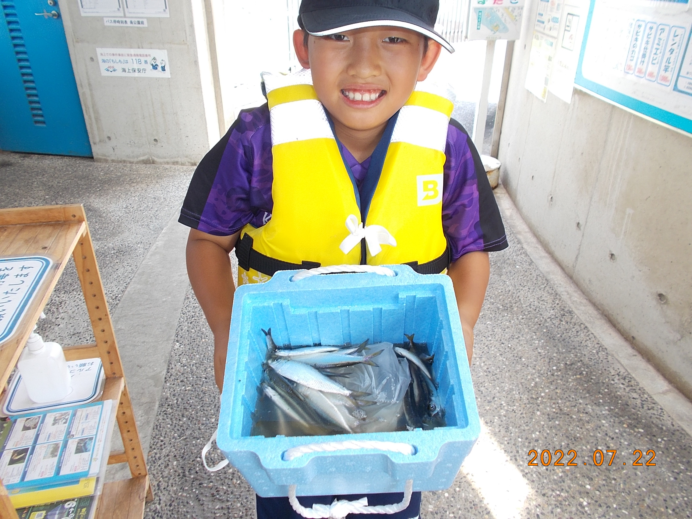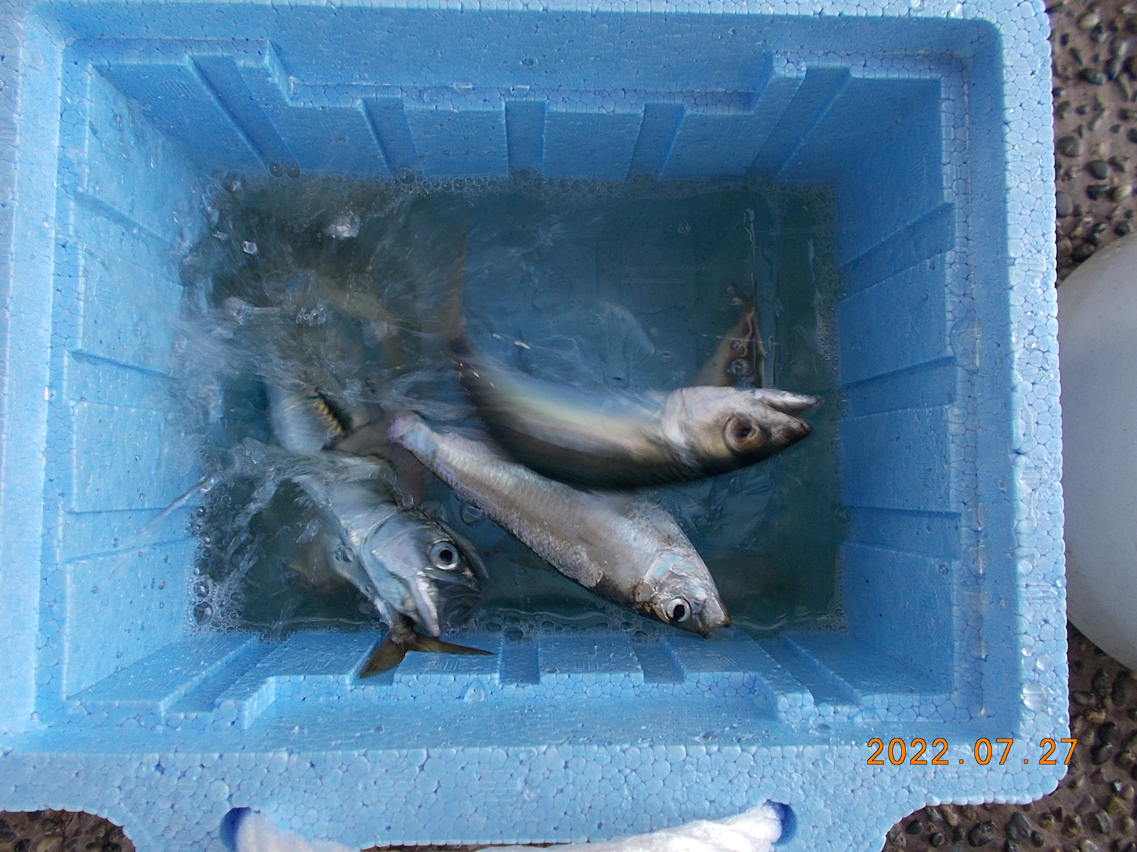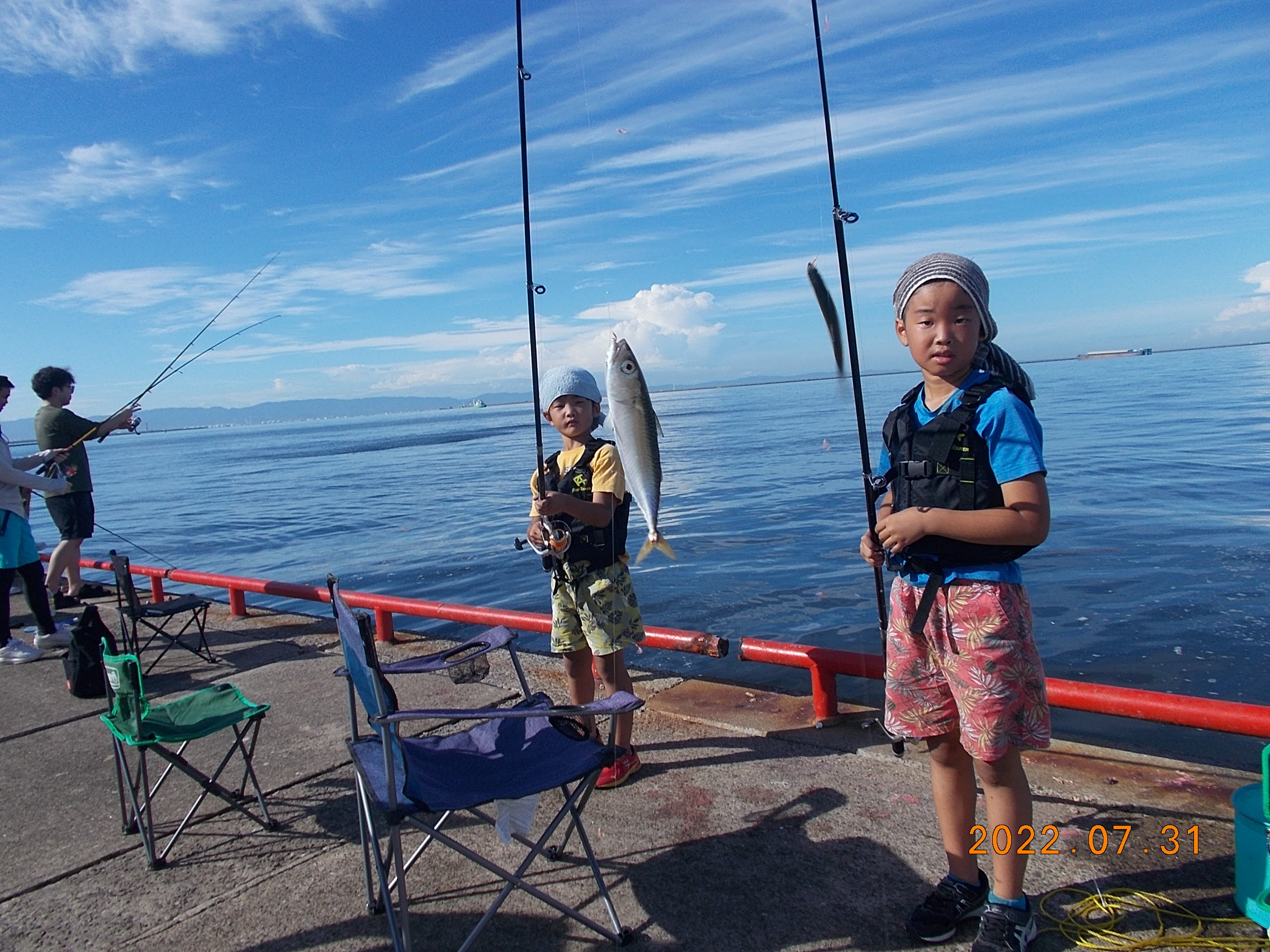 今日は朝から好天に恵まれ沢山のご家族の皆様が大会に参加されサバ、豆アジ、カタクチイワシ等たくさん釣果があり子供の歓声が響いていました。大会は無事9時に終了致しました。午後1時半現在、気温35℃厳しい暑さになっています、只今30名程のお客様が釣を楽しんでおられますがくれぐれも熱中症には気をつけてください。釣果の方は豆アジ、カタクチイワシは釣れなくなり今はサバ中心にポツリポツリと釣れています。
