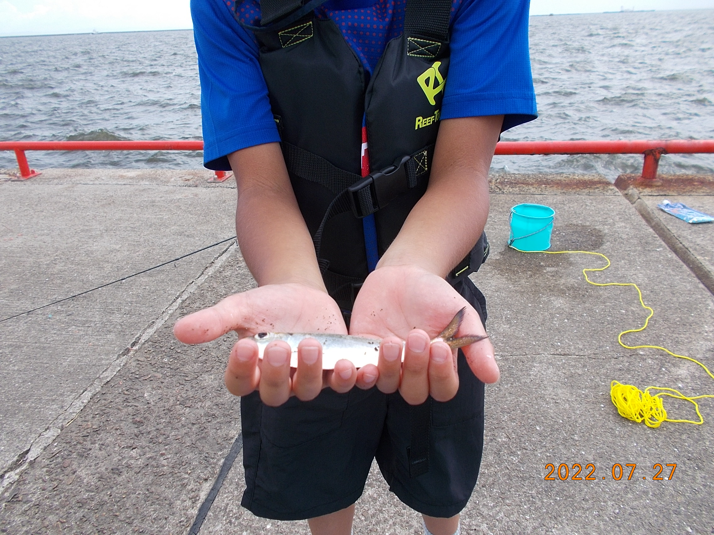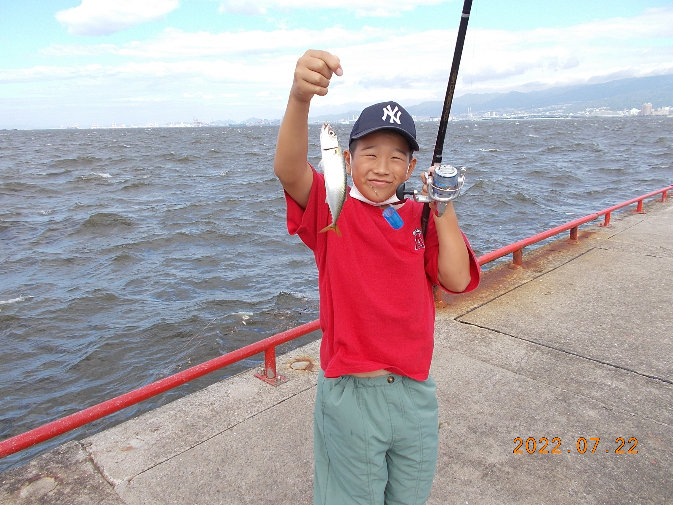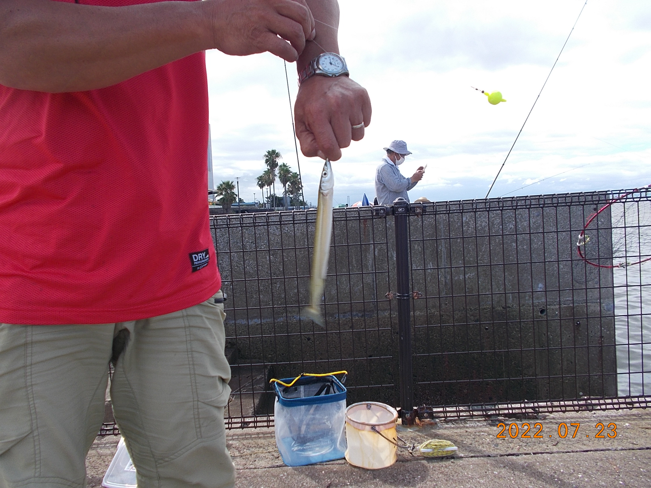 今日は朝から好天に恵まれ沢山のご家族の皆様が大会に参加されサバ、豆アジ、カタクチイワシ等たくさん釣果があり子供の歓声が響いていました。大会は無事9時に終了致しました。午後1時半現在、気温35℃厳しい暑さになっています、只今30名程のお客様が釣を楽しんでおられますがくれぐれも熱中症には気をつけてください。釣果の方は豆アジ、カタクチイワシは釣れなくなり今はサバ中心にポツリポツリと釣れています。