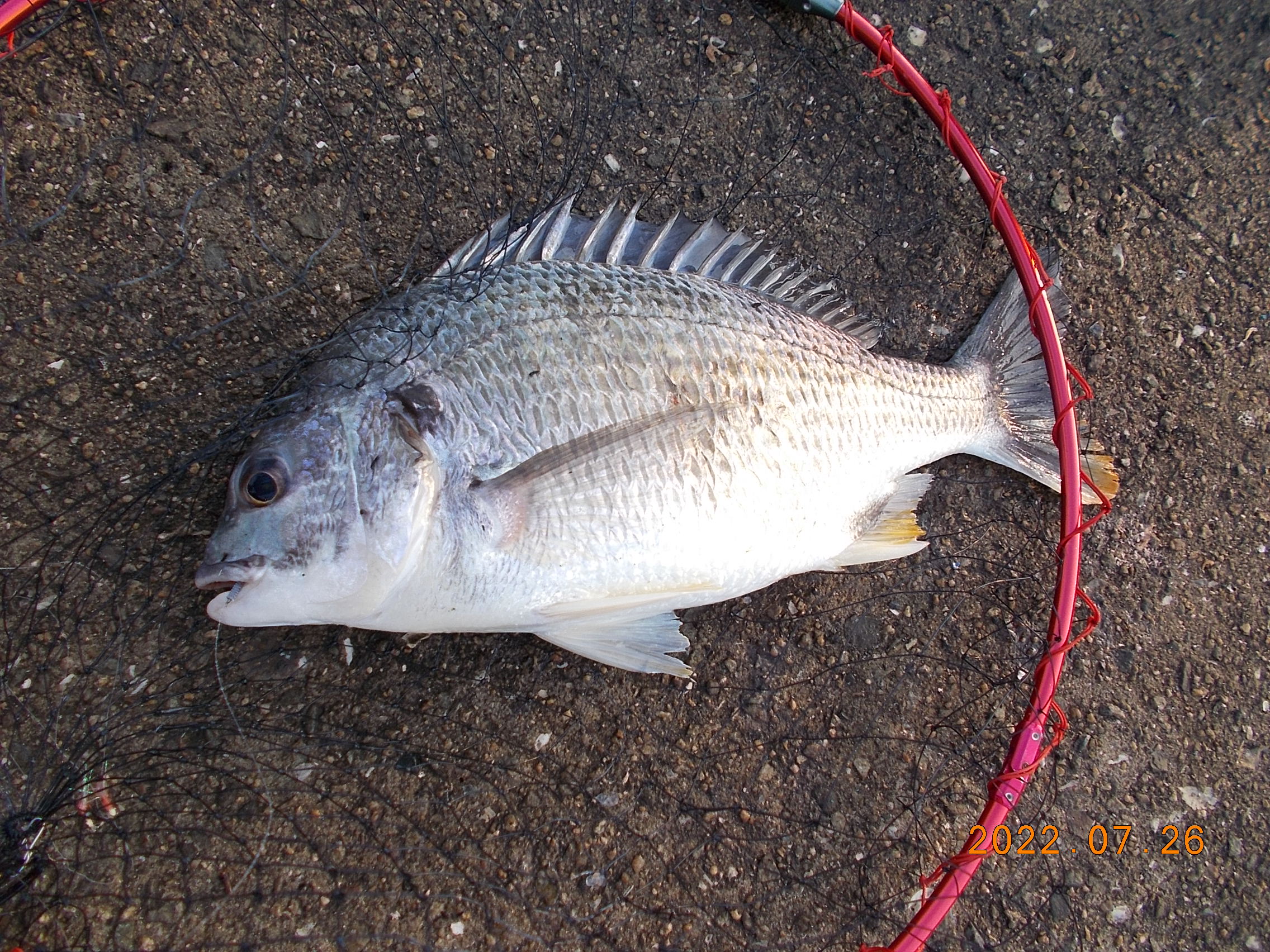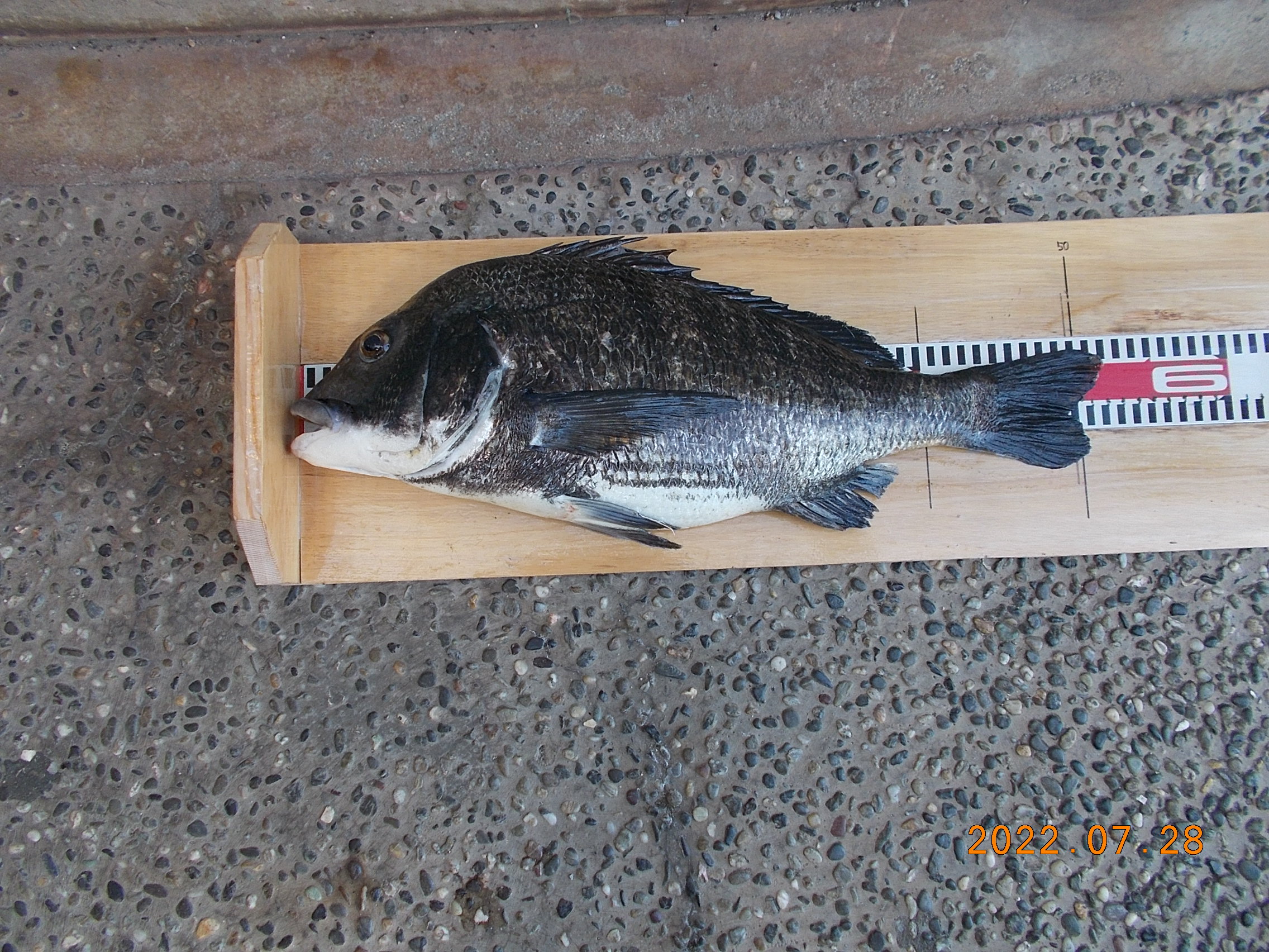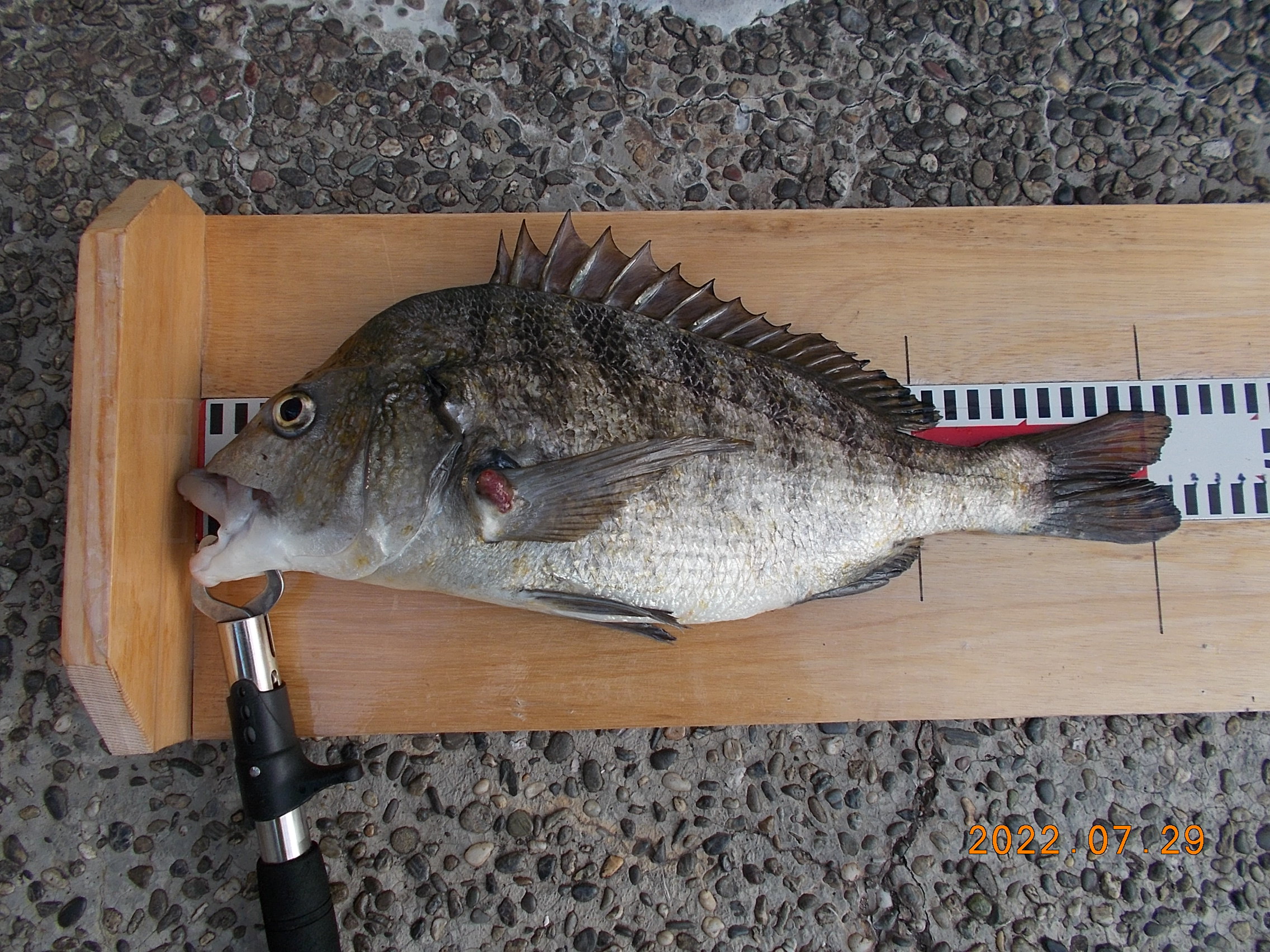 開場して7時現在、サビキ釣りでサバ・豆アジ・サッパ・カタクチイワシと釣れています。サバが20cm~25cmと大きくなっていますので走り回り、お隣と絡み合う事もあるので素早く引き上げるようにしましょう。8時頃からサビキ釣りの釣果が落ちて来ていますが、炎天下の中頑張って釣りをされています。11時ごろから南西の風に変わり波が出てきたので、ウキ釣りの方はアタリが取りにくくなってきました。後、落とし込みの方が48cmと50cmのチヌを釣っていらっしゃいます。