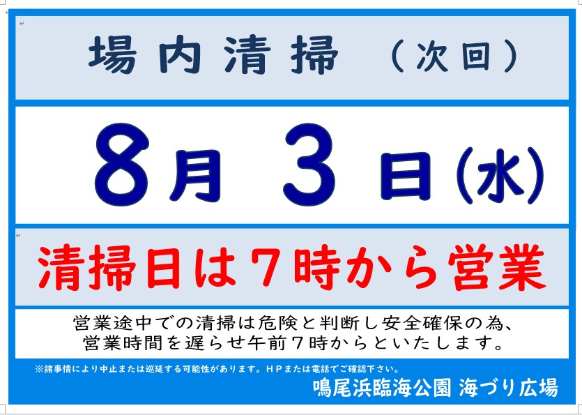 本日の清掃作業は終わりました。午前7時より開園します。次回の清掃日は8月3日(水)となります。