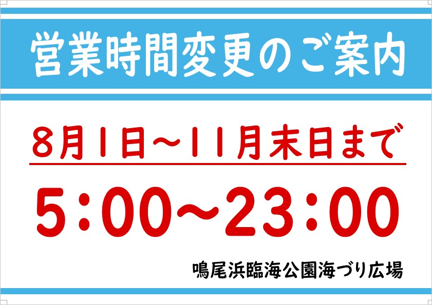 明日8月1日~11月末日までの営業時間は05:00~23:00 となります。ご来場の際は十分ご注意下さい。 -
