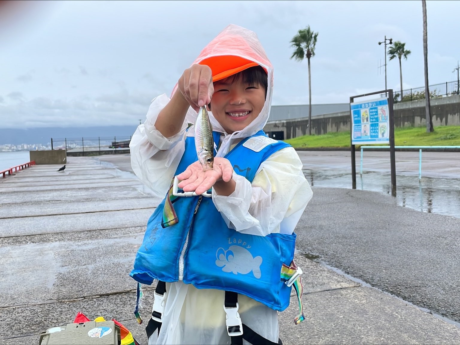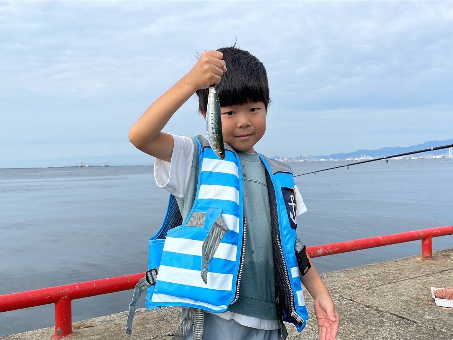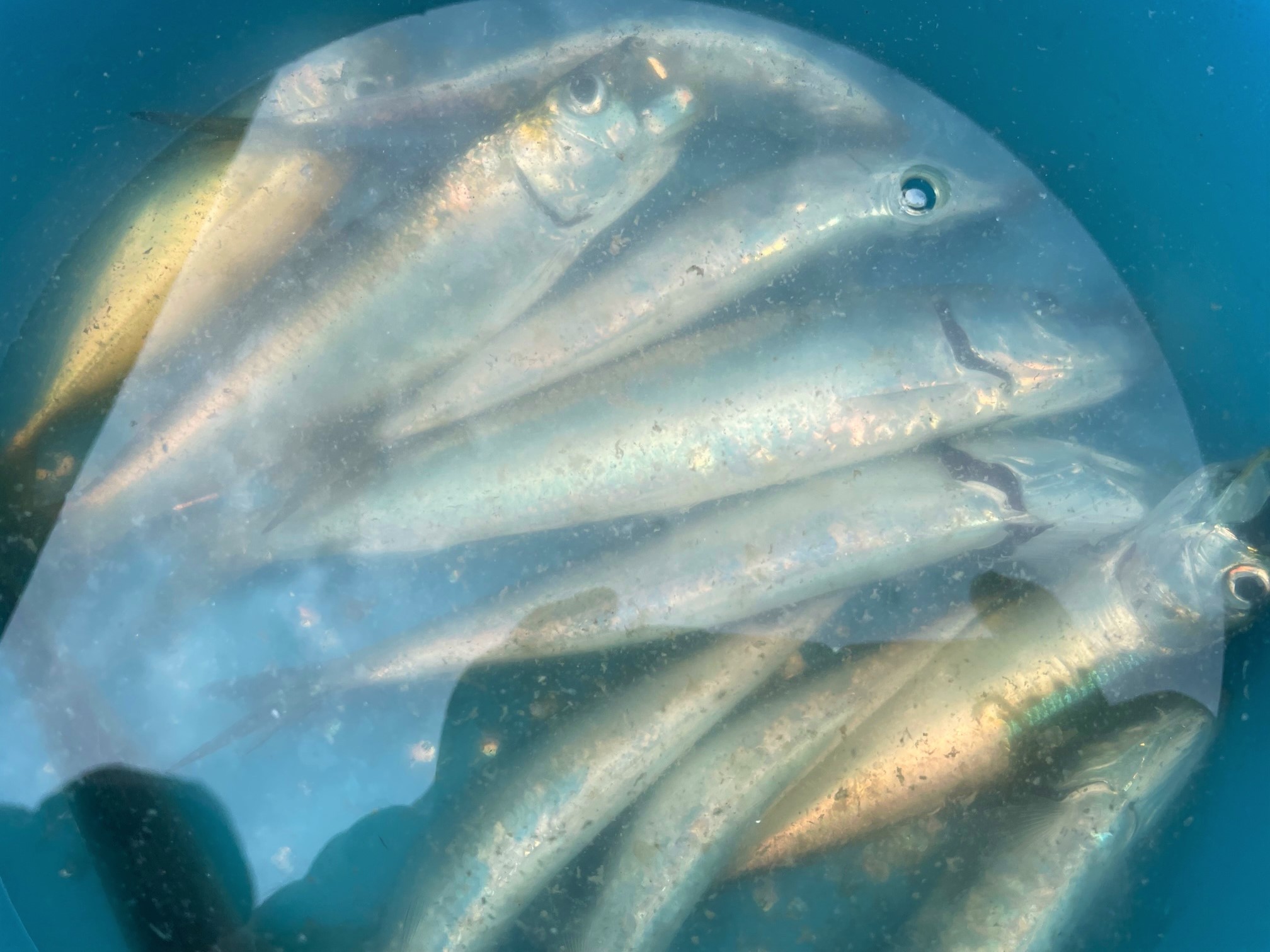 午後3時現在、北西の風1.0m、曇り、28℃。海上うねりなし。先ほどからカタクチイワシがよく釣れている。