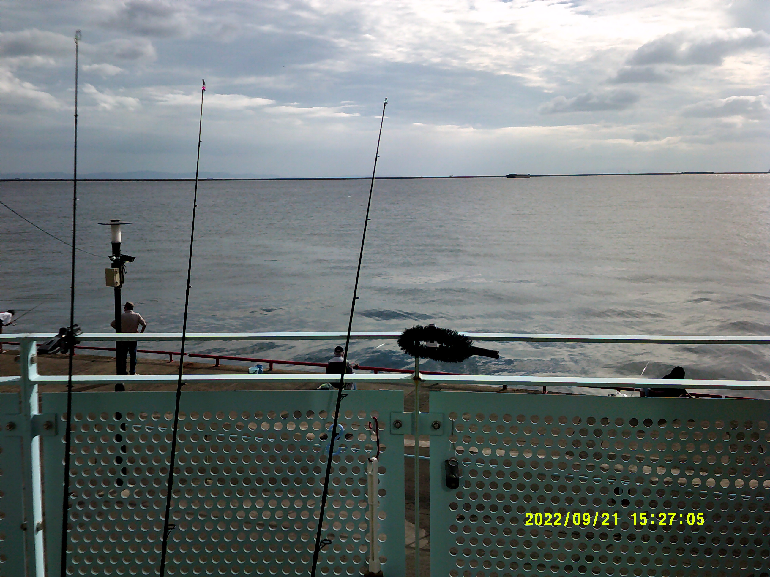 朝6時頃から、サバ・サッパ・マイワシがよく釣れていましたが2時間ほどで止まり、後はサヨリ仕掛けに替えて釣りをされています。今日は早い時間帯でサヨリが釣れていましたが、魚自体が小さくハリ掛けが難しいようで、多い人で20~30匹程でした。東側で紀州釣りの方が、チヌの22~28cm4匹(小さいのはリリース)キープされていました。
