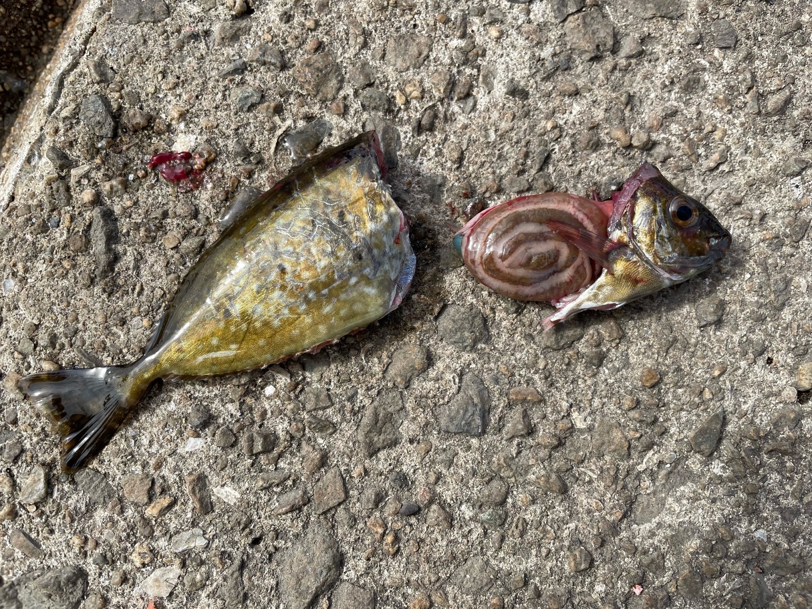 アイゴは大変美味しい魚です、少しずつ大きくなり持って帰って調理できるサイズになってきました。持って帰る場合は背ビレ腹ビレをキッチンバサミで切り落とし、頭の後ろから背骨まで切って、頭を下へ折り曲げながら渦を巻いたような内臓を傷つけずに引き抜いて下さい。内臓が大変臭いので早く内臓を取り除かなくてはいけません。添付写真③