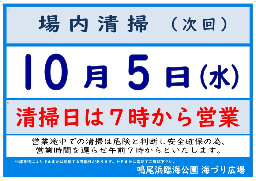 本日は清掃日となり、営業開始が7時からとなりました。次回の清掃日は10月5日となります。