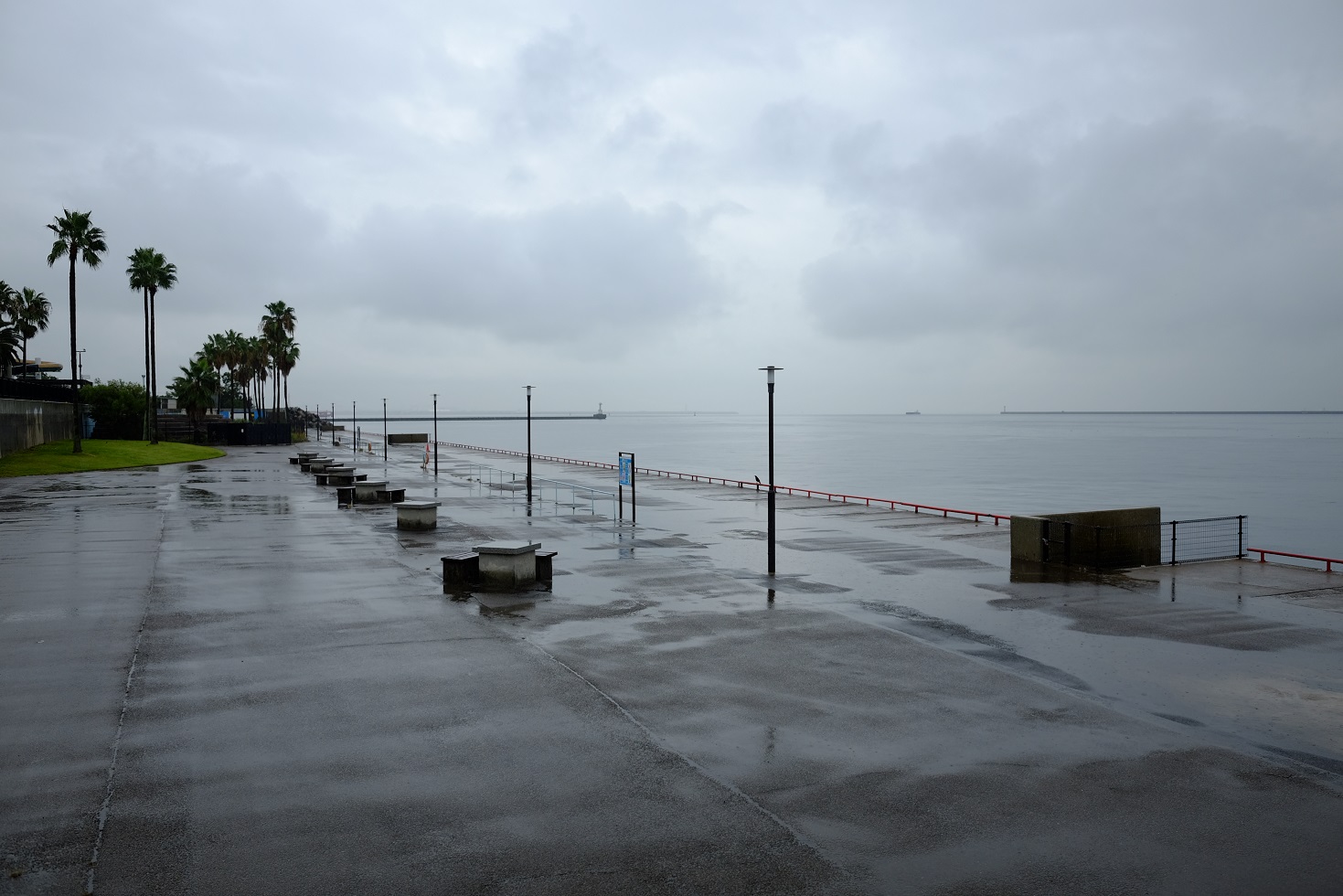 午後2時半現在、東の風0.5m、小雨、海面穏やか、気温19℃。
