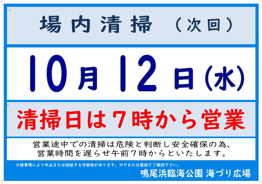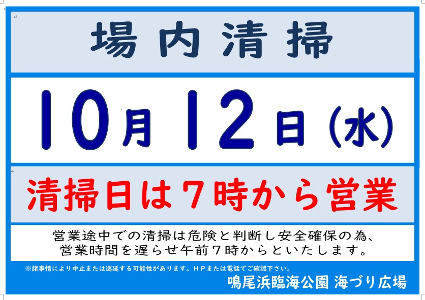 【 注意 】明日、10月12日は清掃日となっています。開園時間が午前7時となりますので、お間違えの無いようお願いします。また、並び位置も普段とは異なりますので、係員の指示に従って下さい。 -