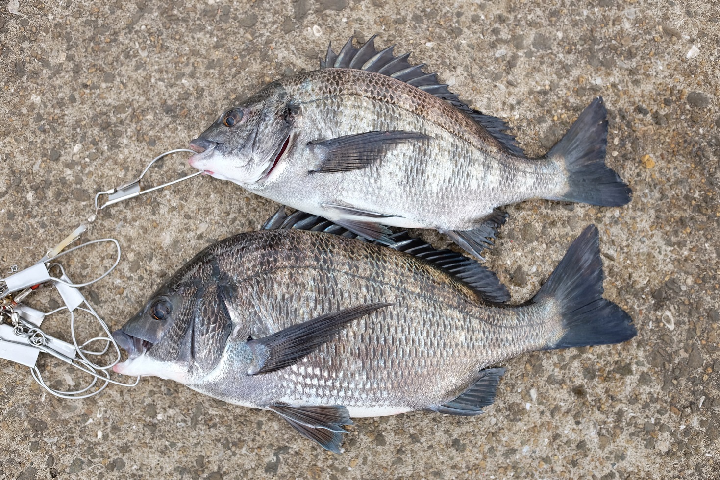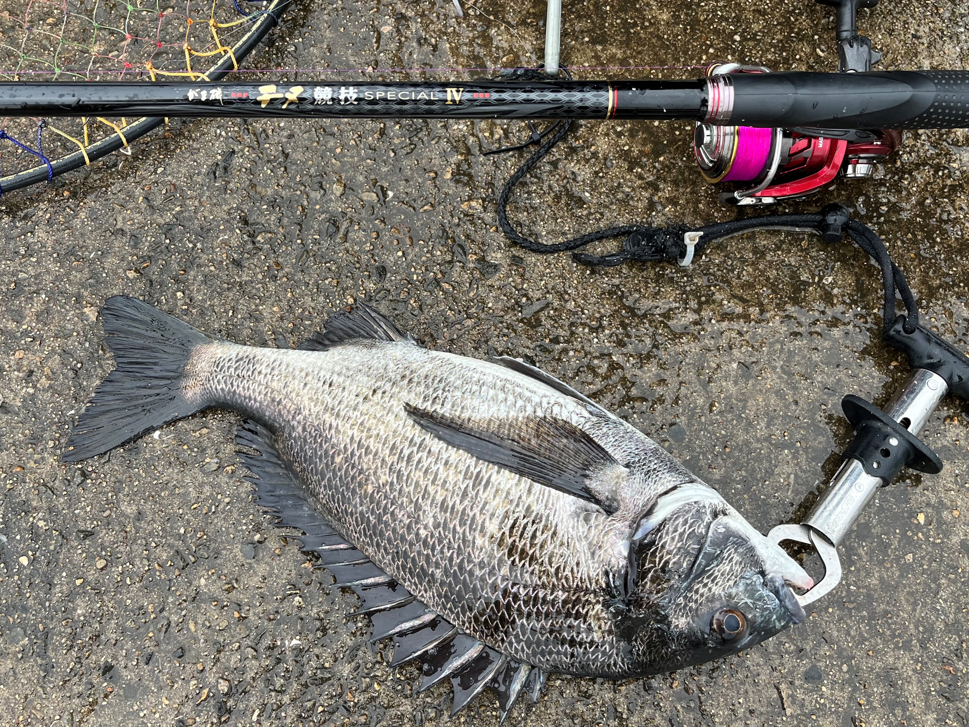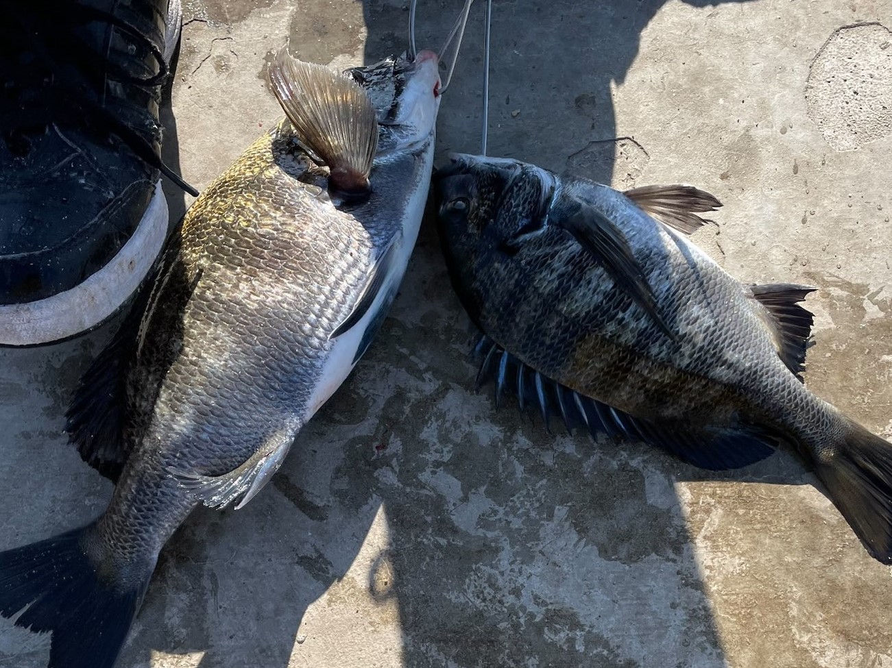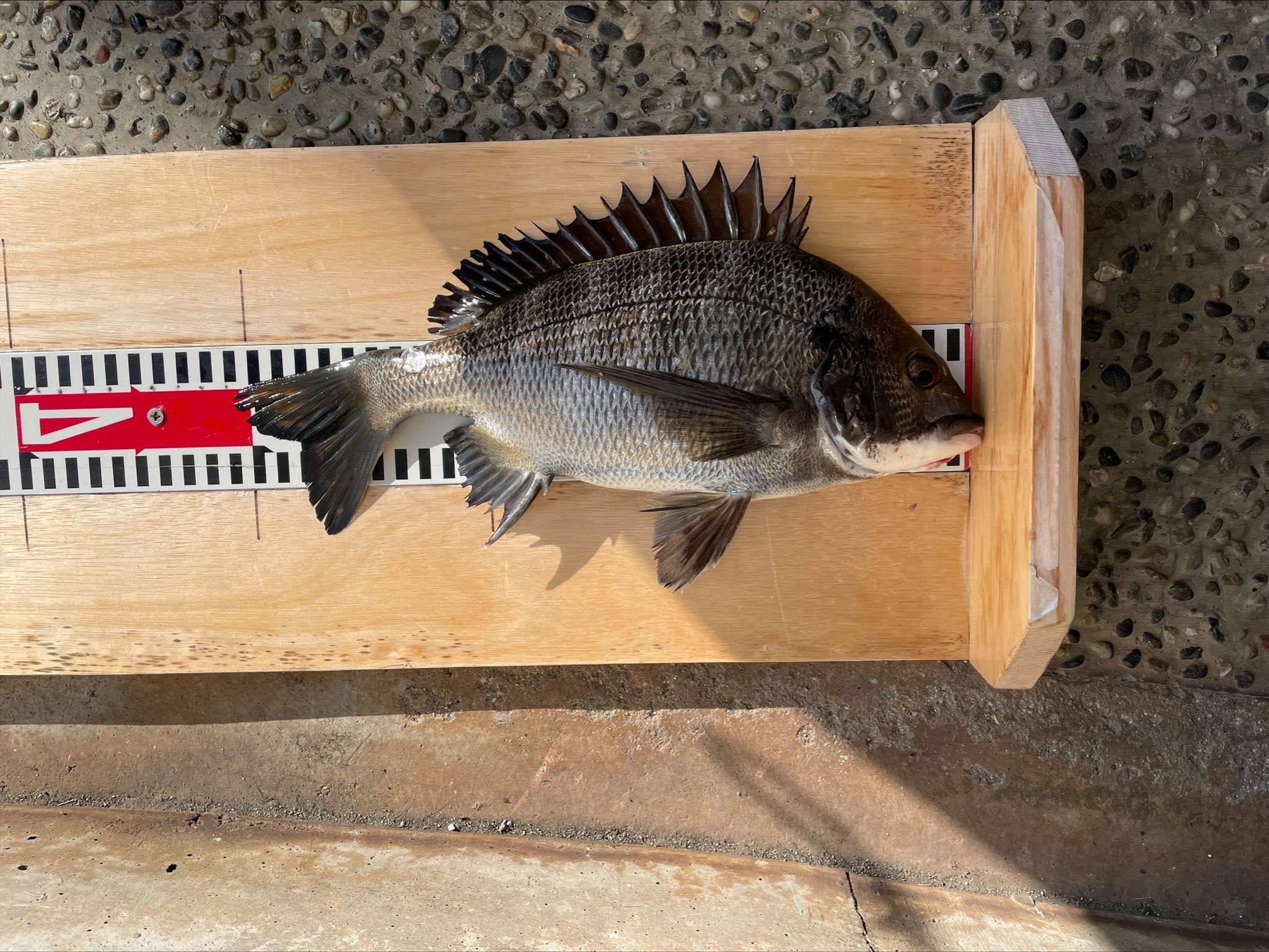 フカセ釣りには反応があり、餌を突く感触があるとの事、その中からキビレ40㎝の釣果。その後、13時半までにチヌ3匹の釣果も加えていらっしゃいました。棚底、餌はオキアミ。