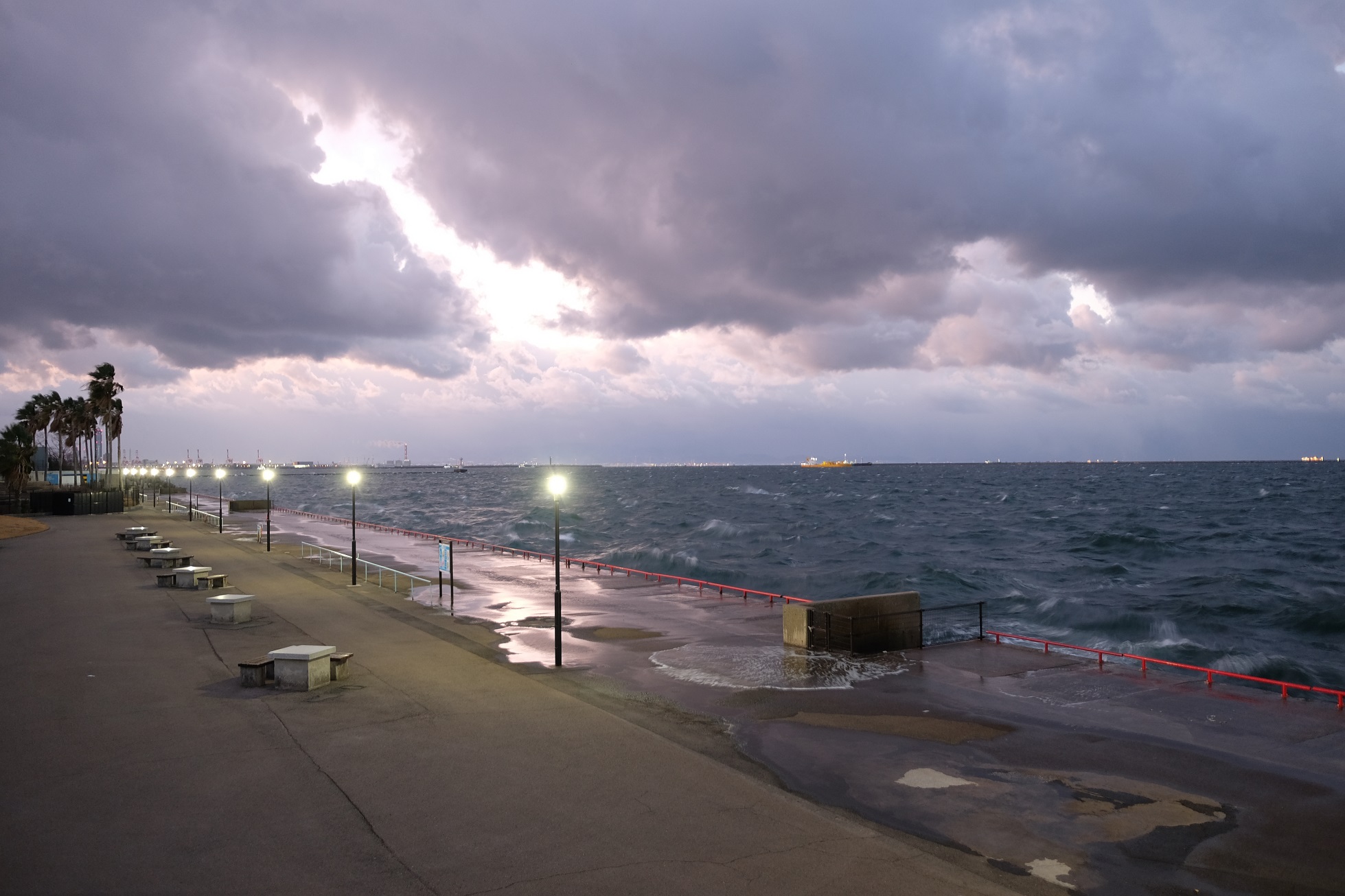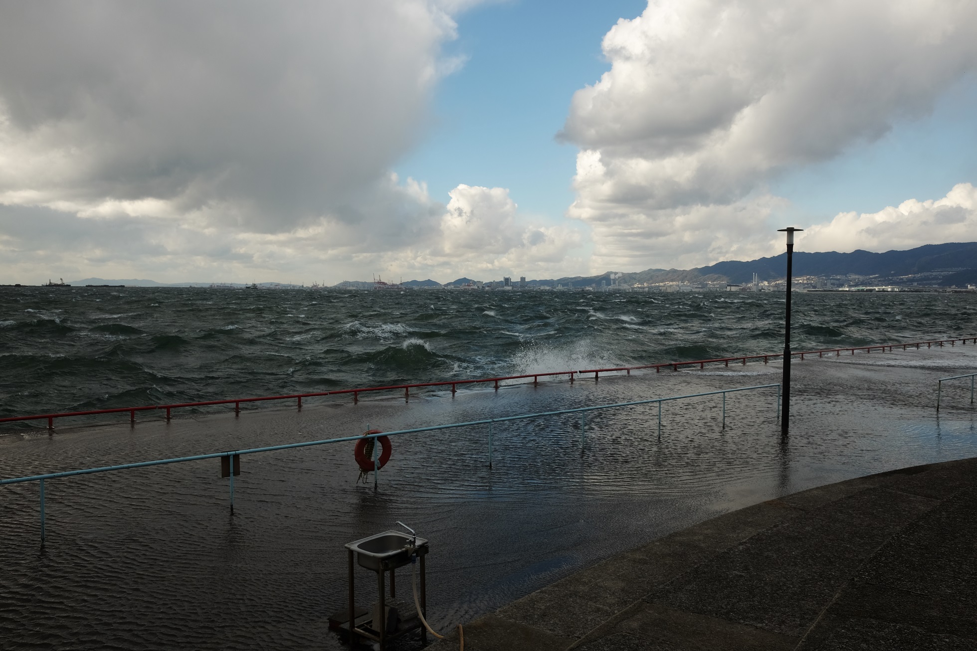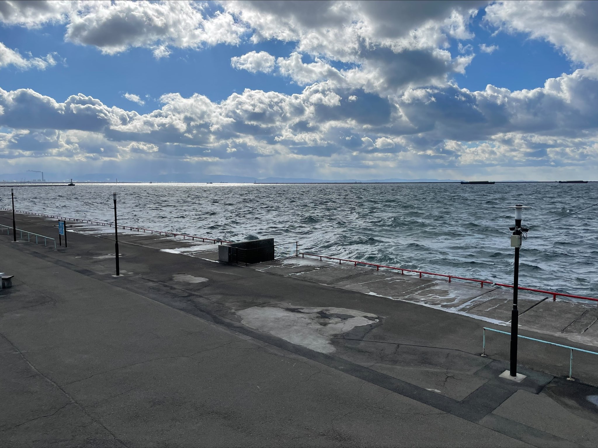 PM13時、鳴尾浜海づり広場は15m/s前後の強い風が吹き続いています。