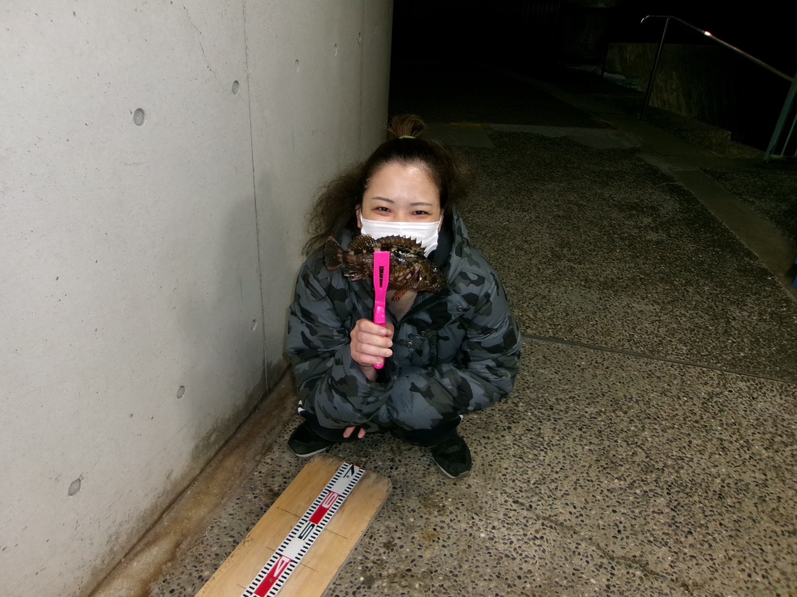 20時半、ガシラが釣れました。22㎝で餌はイソメです。月間大物賞エントリーされました。今日は昼から釣果はなかったので嬉しい結果になりました。釣り方はブラクリだそうです。