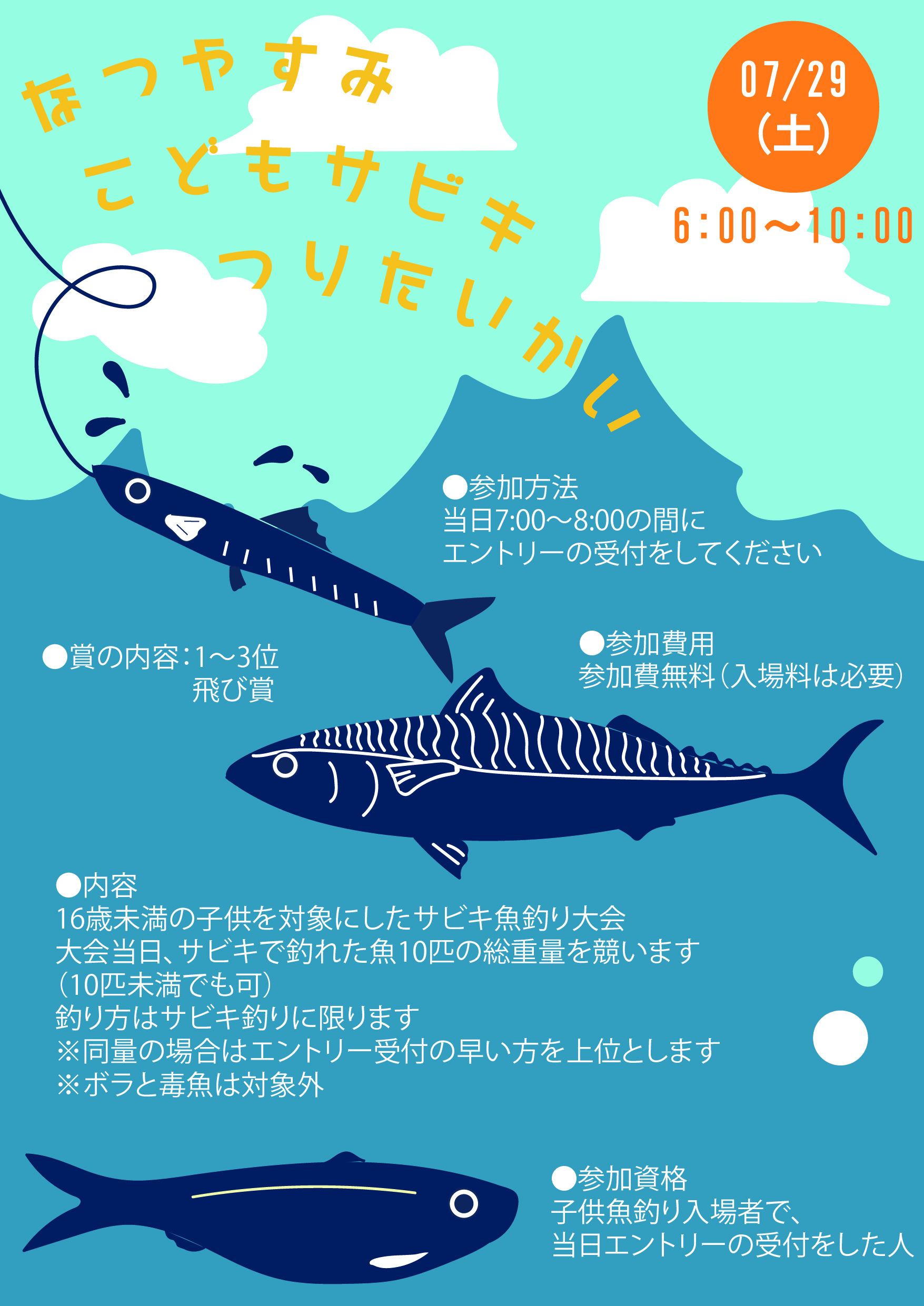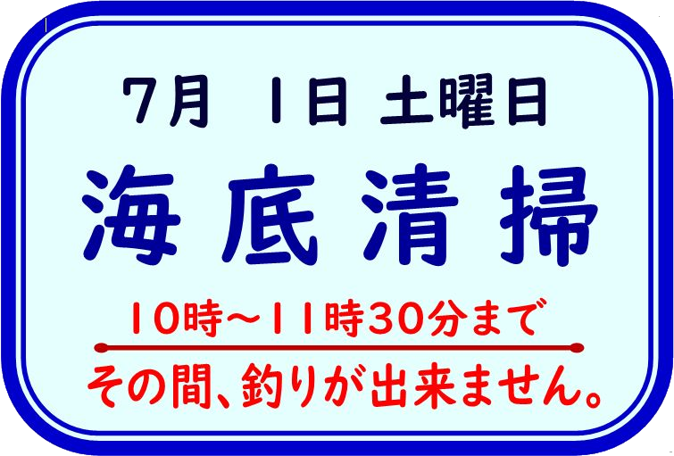7月1日(土)はダイバーによる海底清掃を行ないます。午前10時~11時半までの間は釣りを行うことが出来ません。