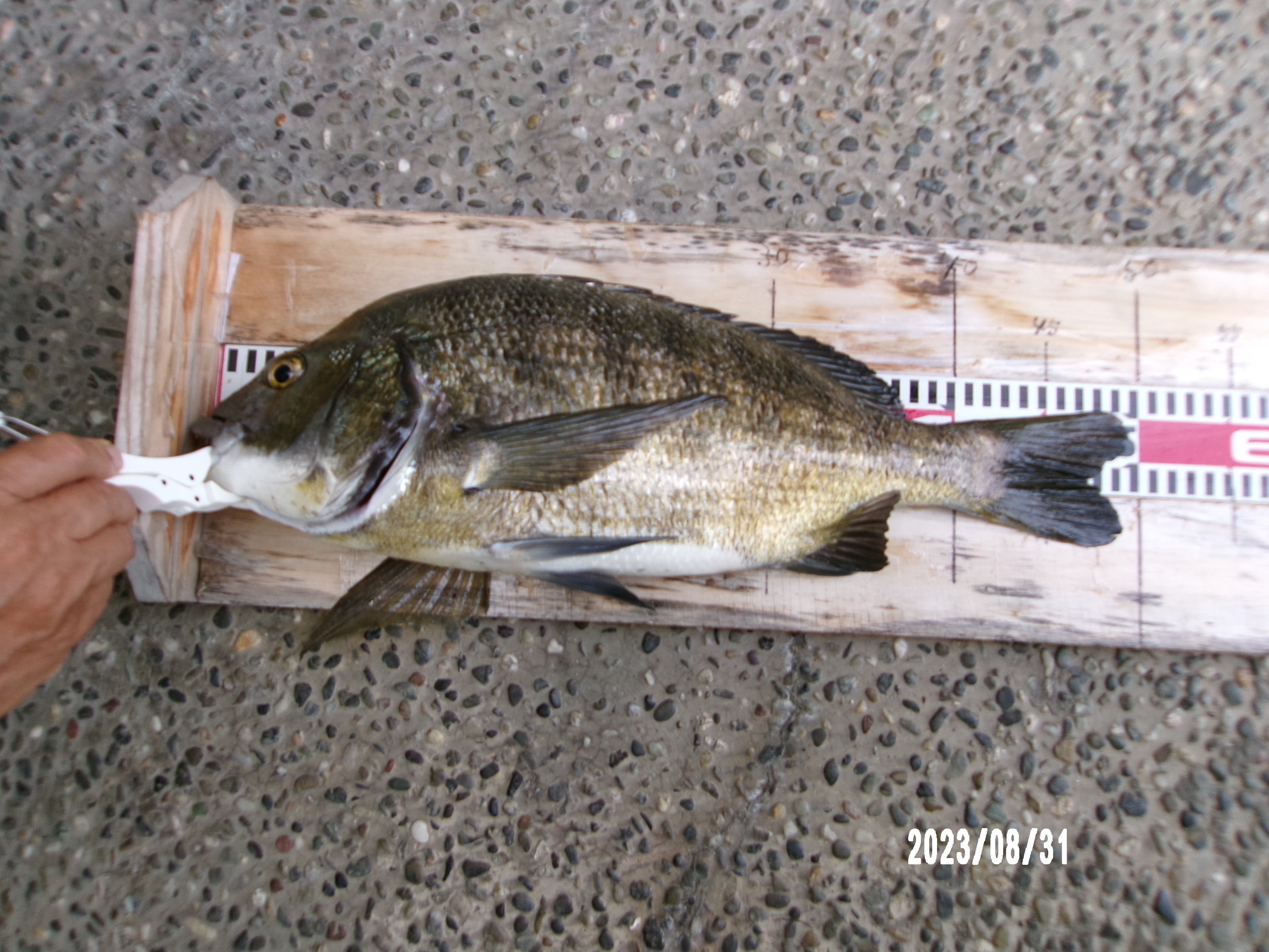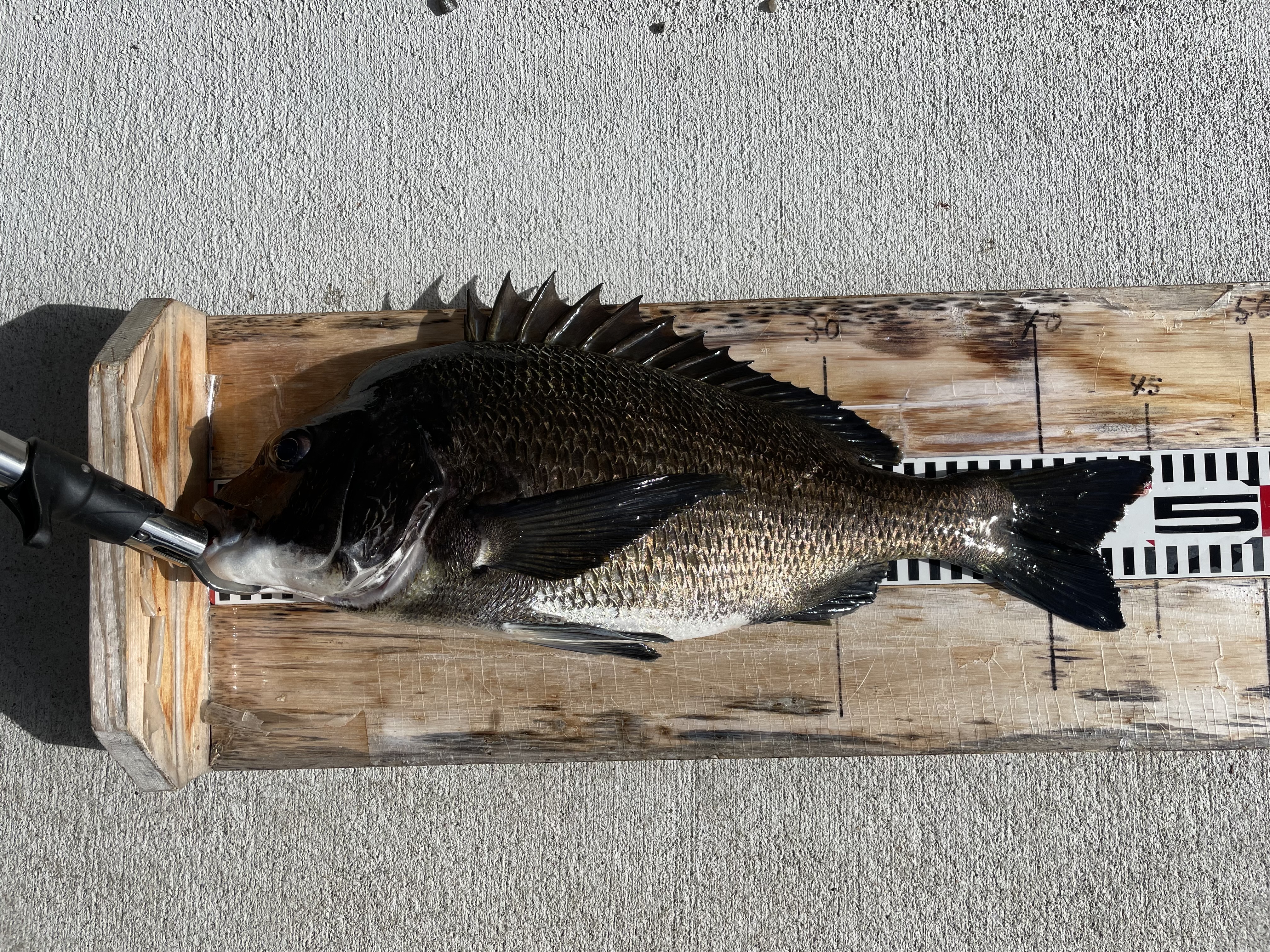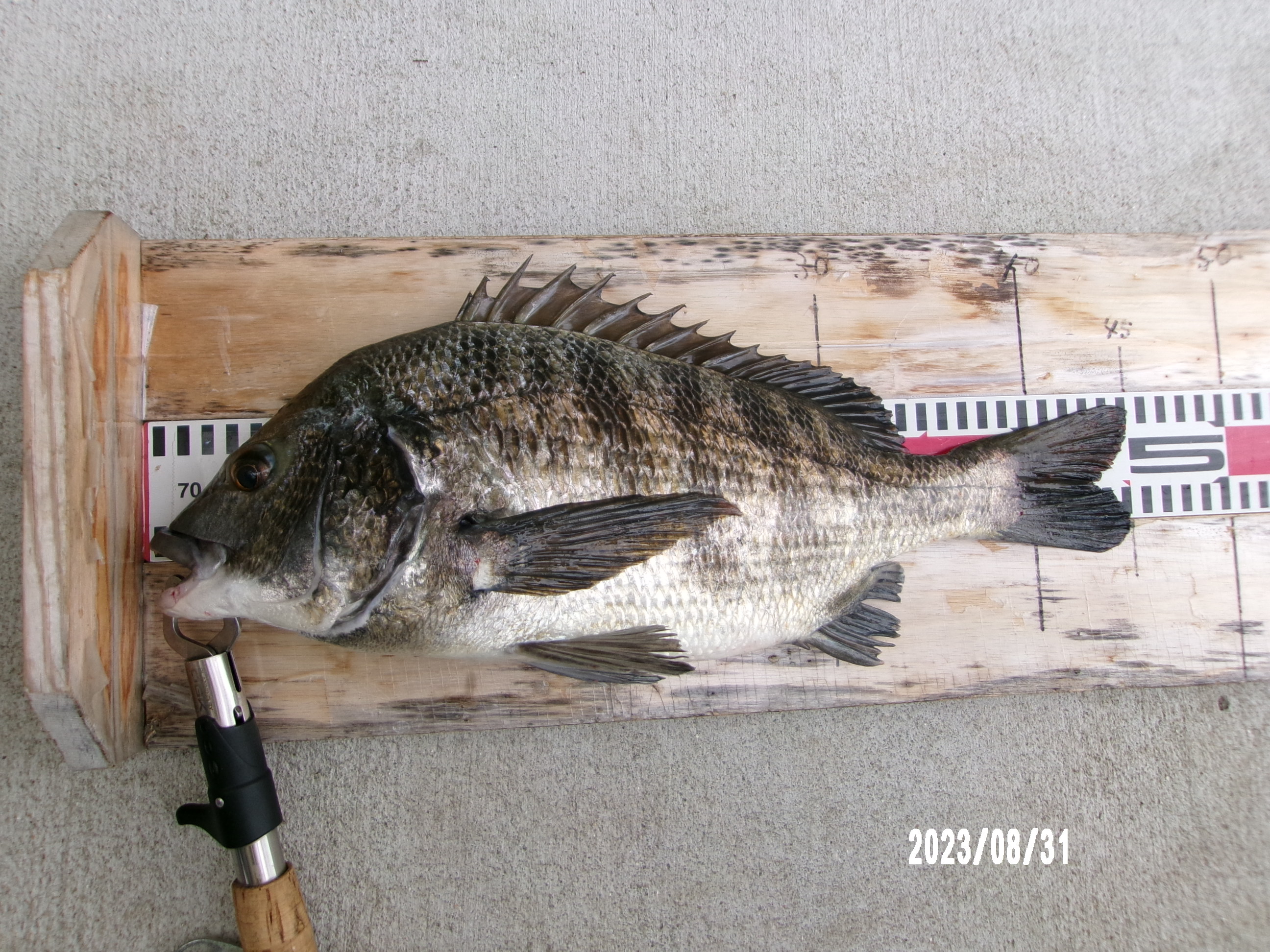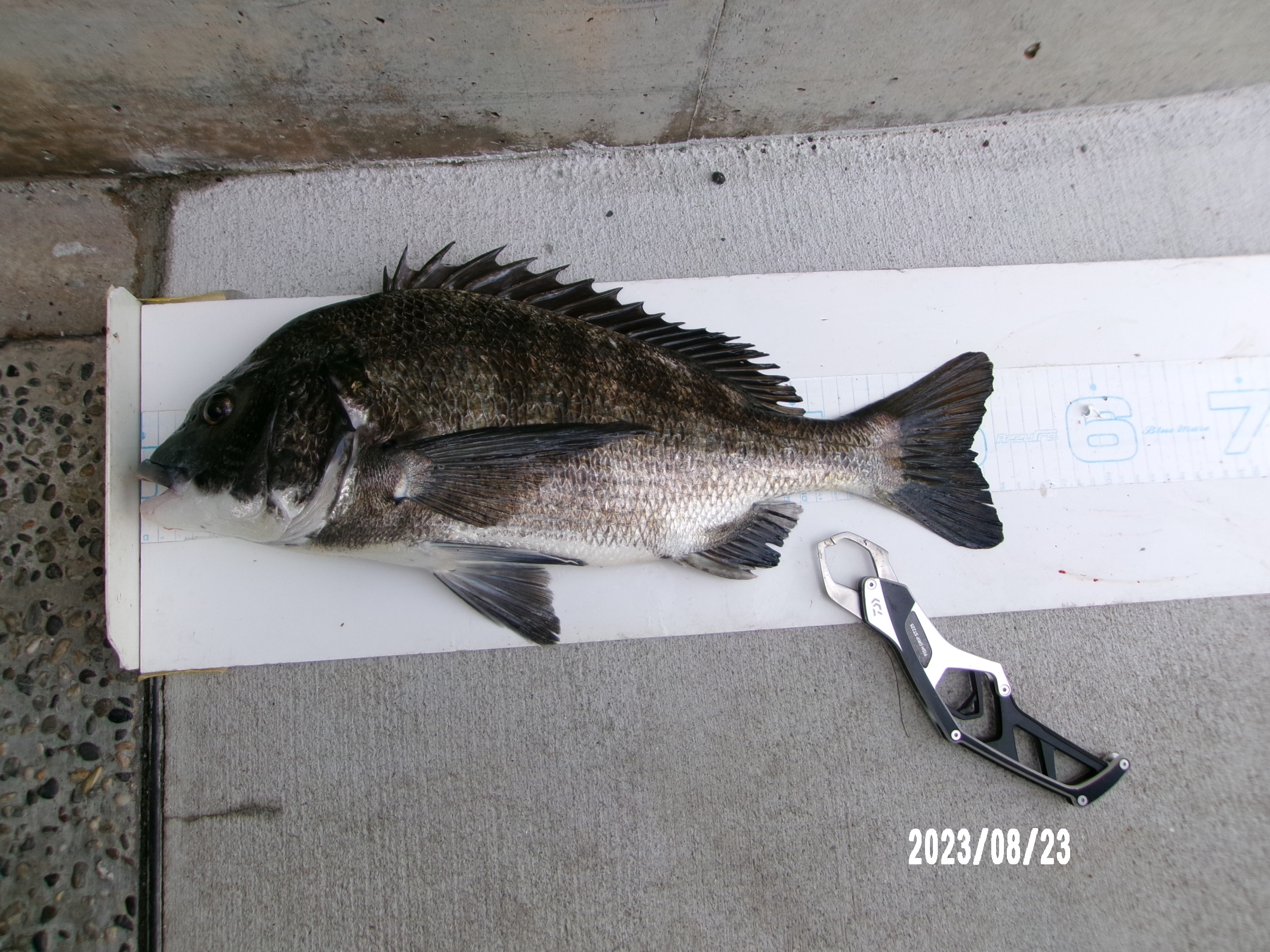 17時、チヌが上がりました。50㎝で、ウキ釣りで、餌は、青イソメだそうです。 -