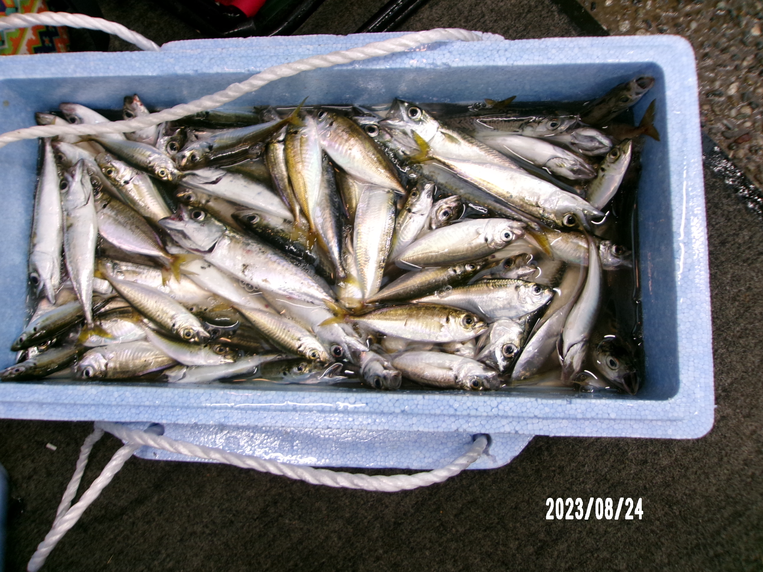 夏休み最後の週末とあり、多くのお客様で賑わっています。サビキ釣りも好調を維持しており、アジ、サバ、カタクチイワシが良く釣れています。