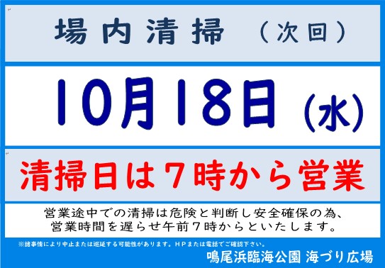 本日の清掃作業は終了しました。午前7時より営業しております。次回の清掃日は11月8日です。