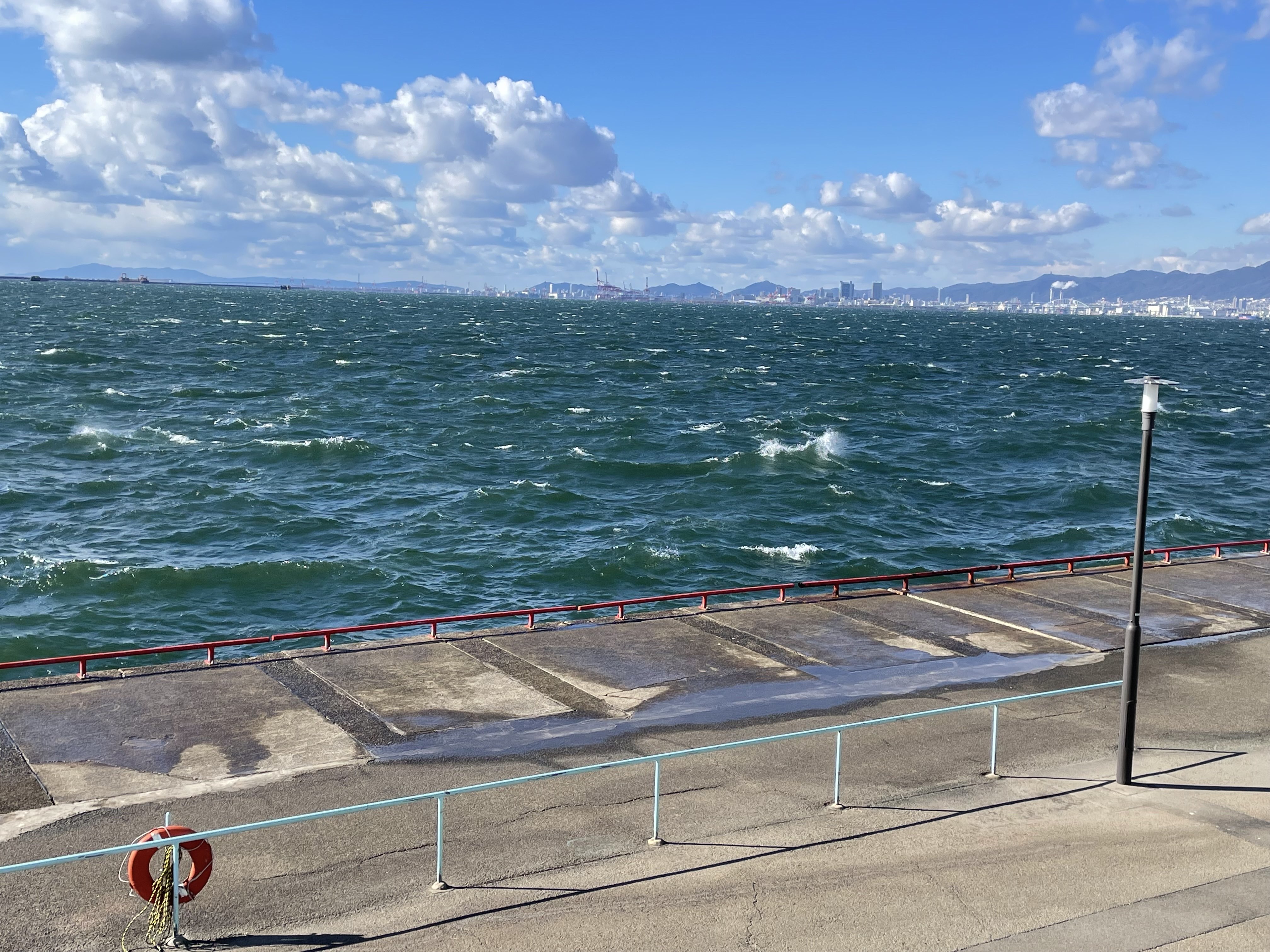 7時30分、鳴尾浜海づり広場は強い風が吹き波が高いため、安全を考慮し一時閉場といたします。