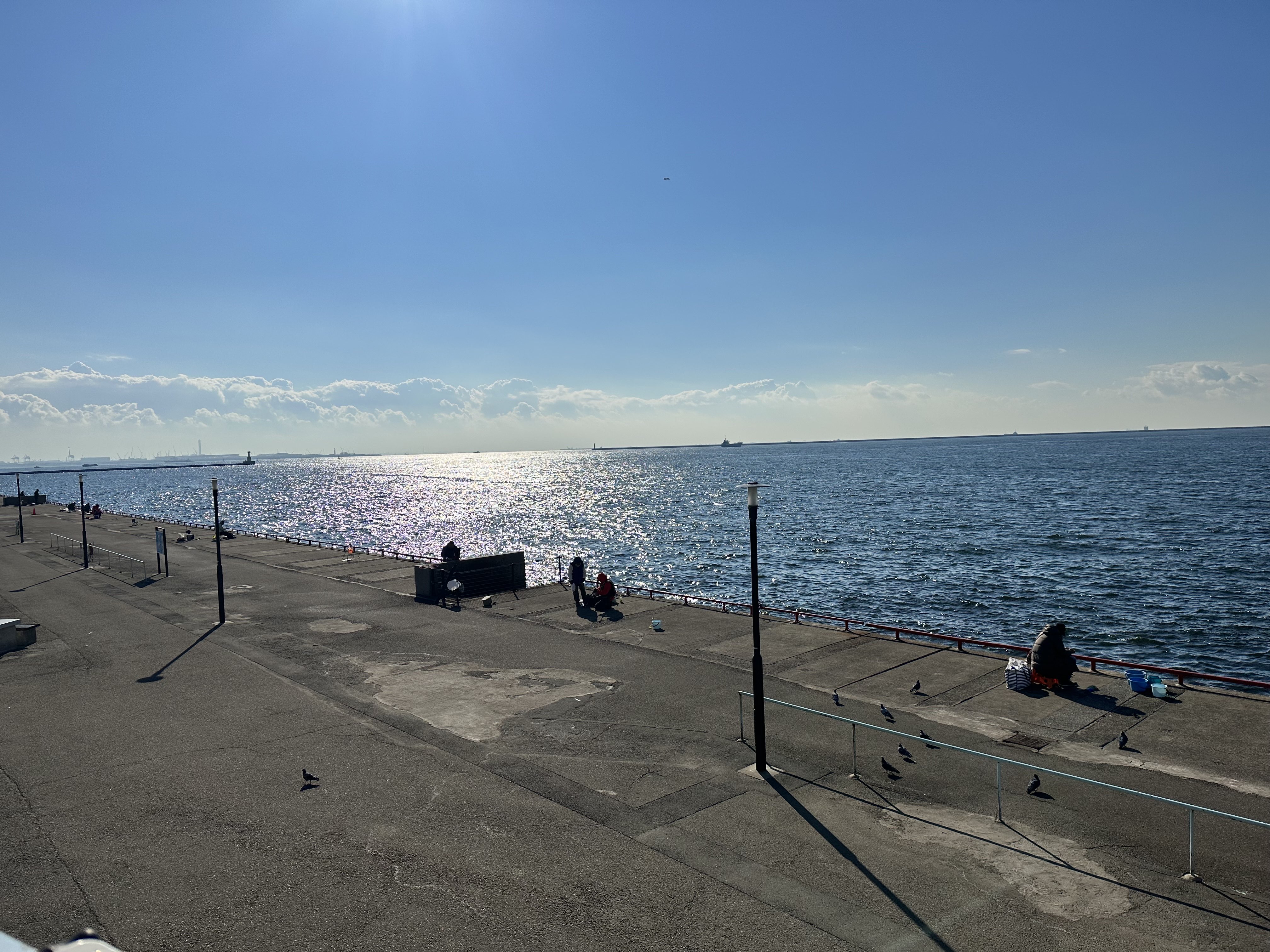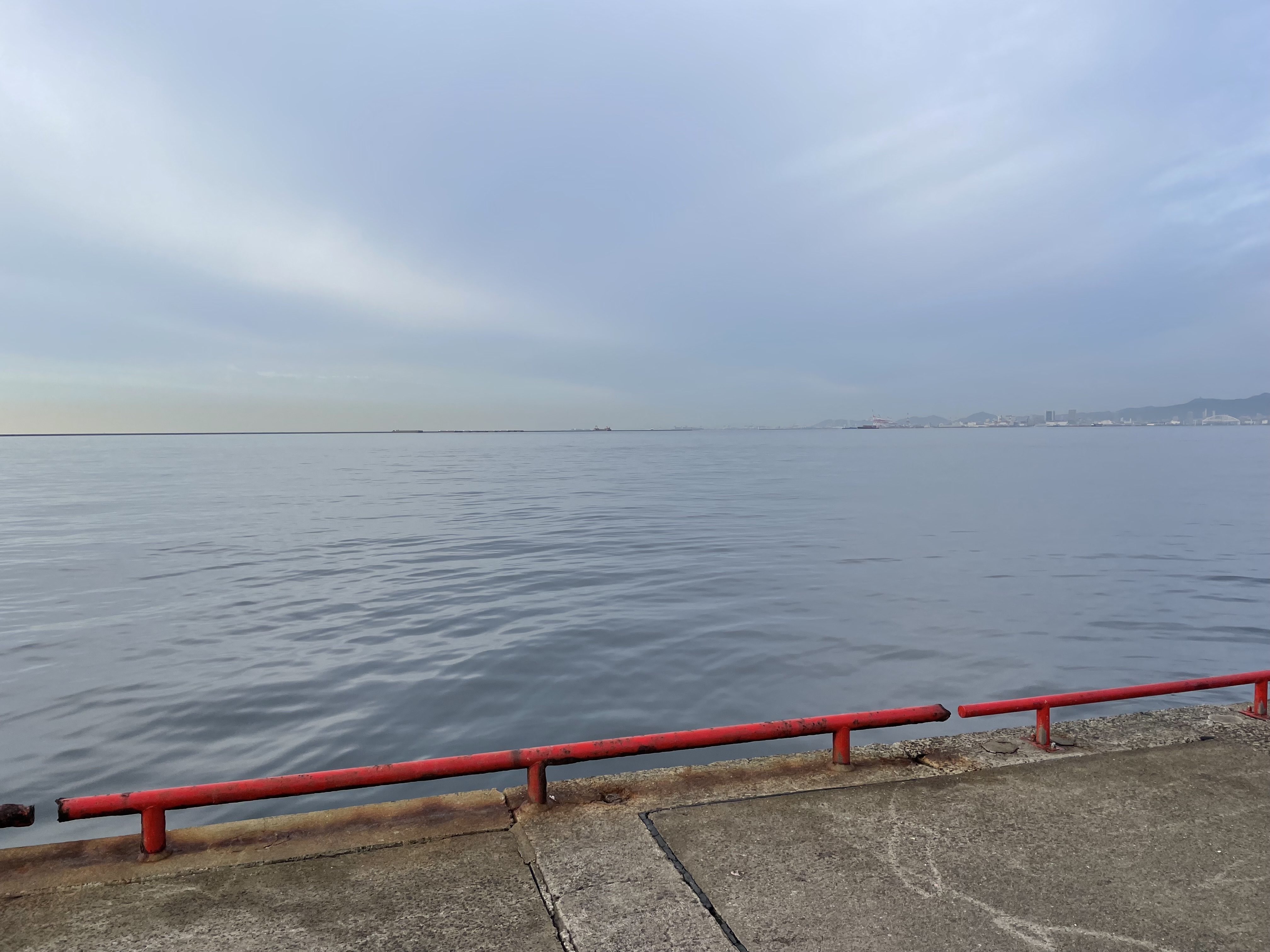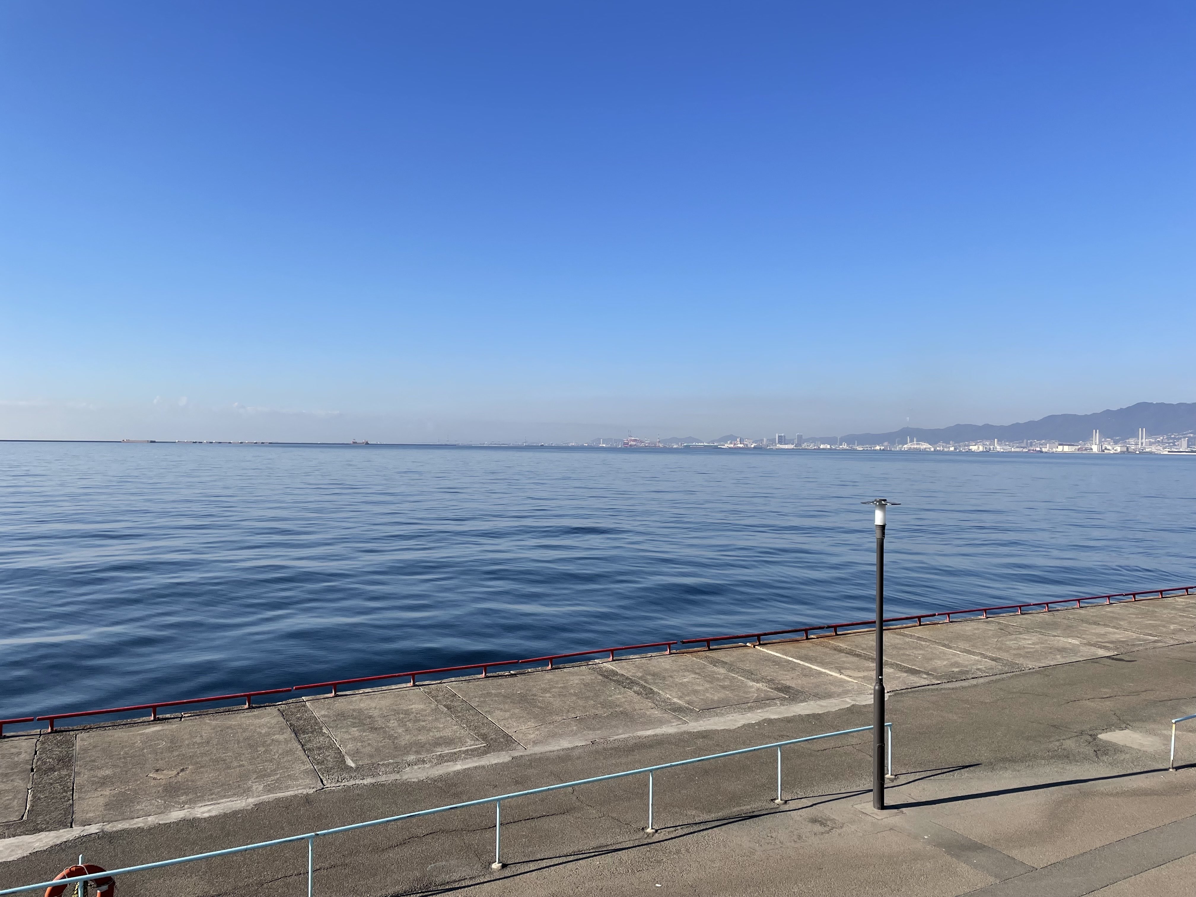 鳴尾浜臨海公園海づり広場開園時、波風共に穏やかです。良く晴れた気持ちのよい朝です。