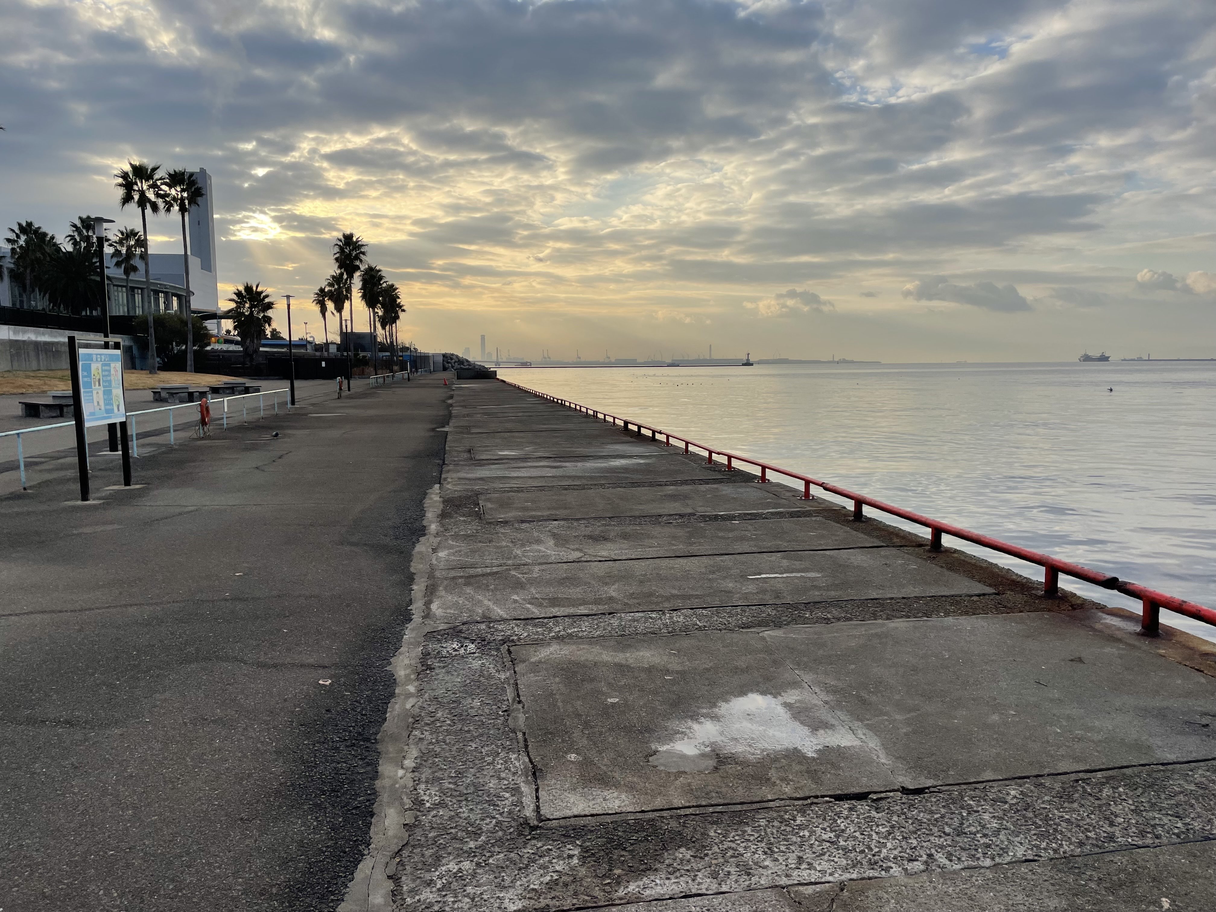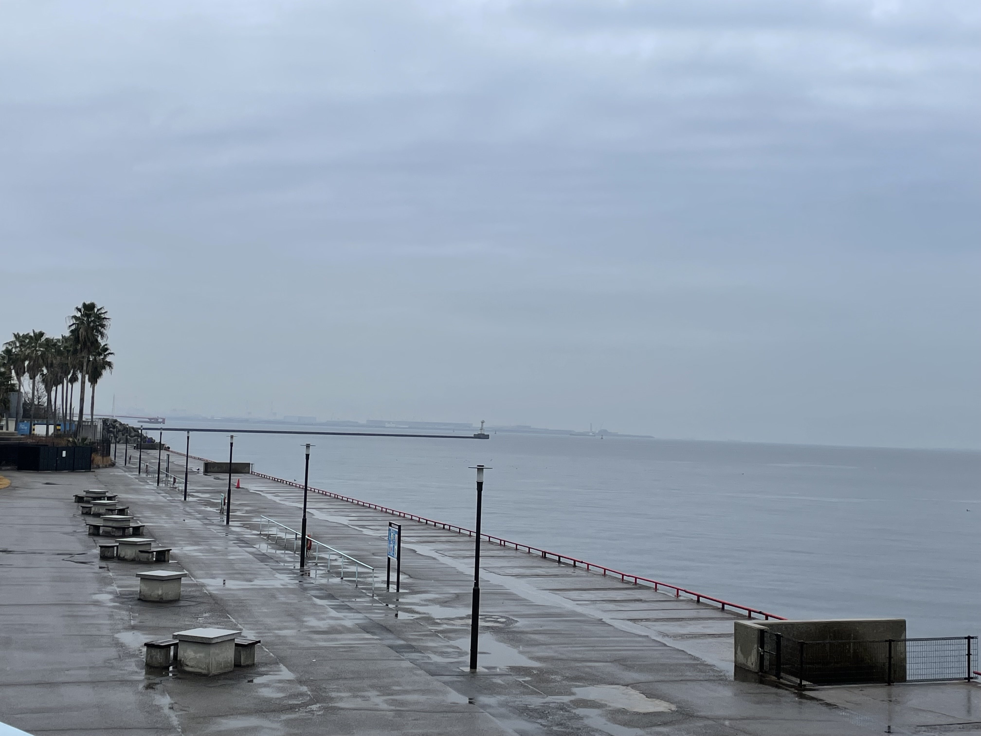 開園時、波風ともに穏やかな鳴尾浜です。雨の朝です。