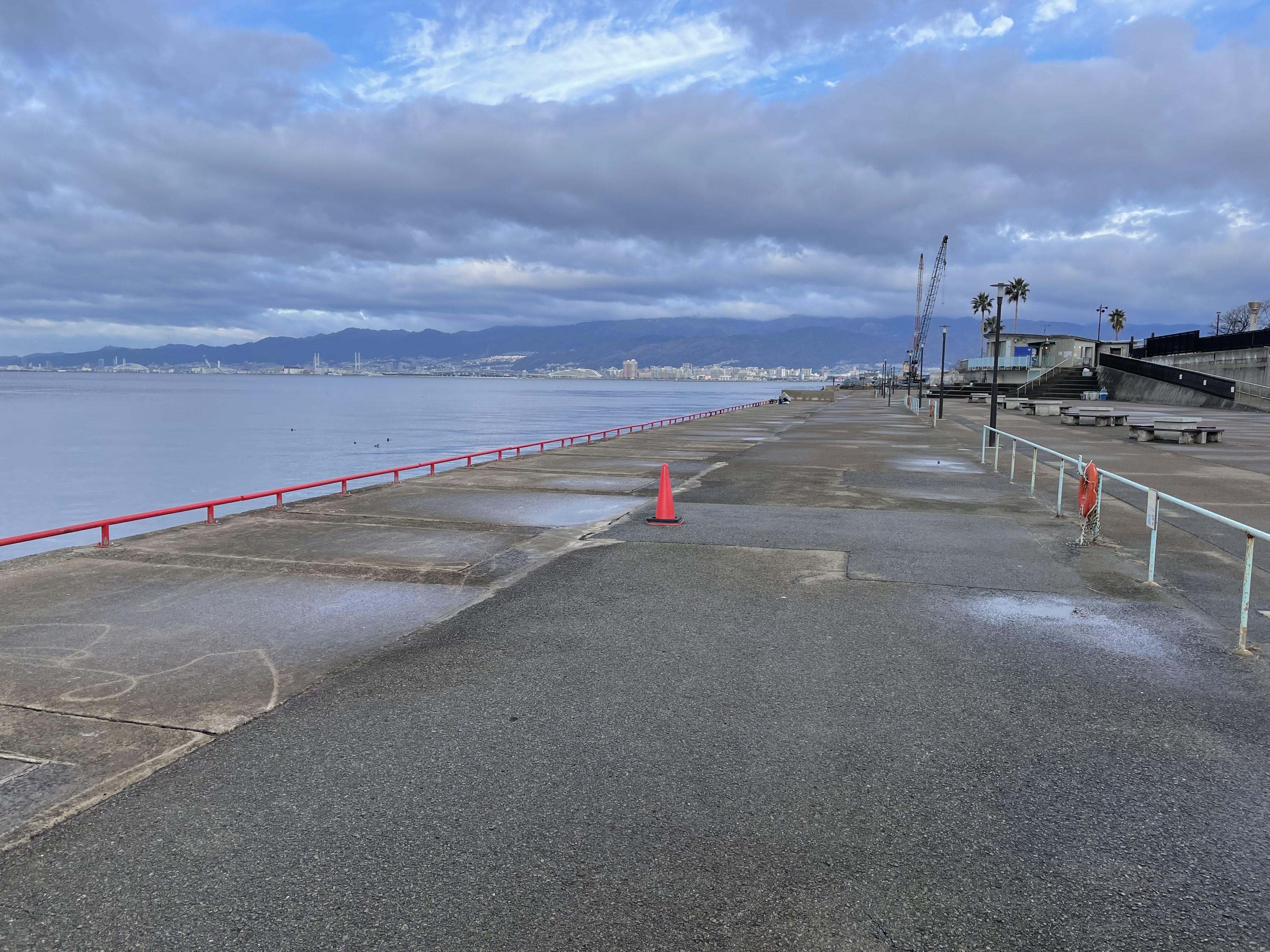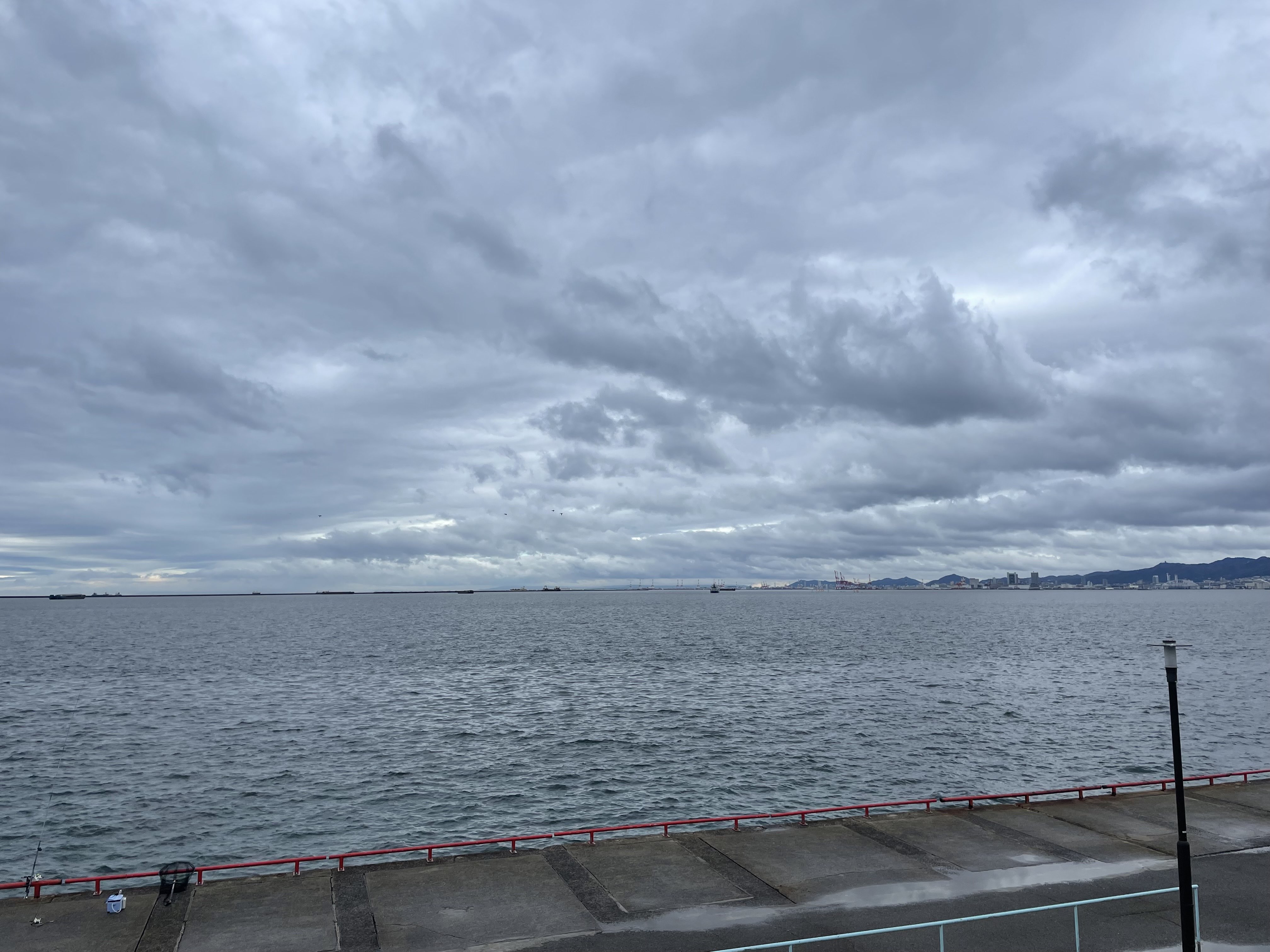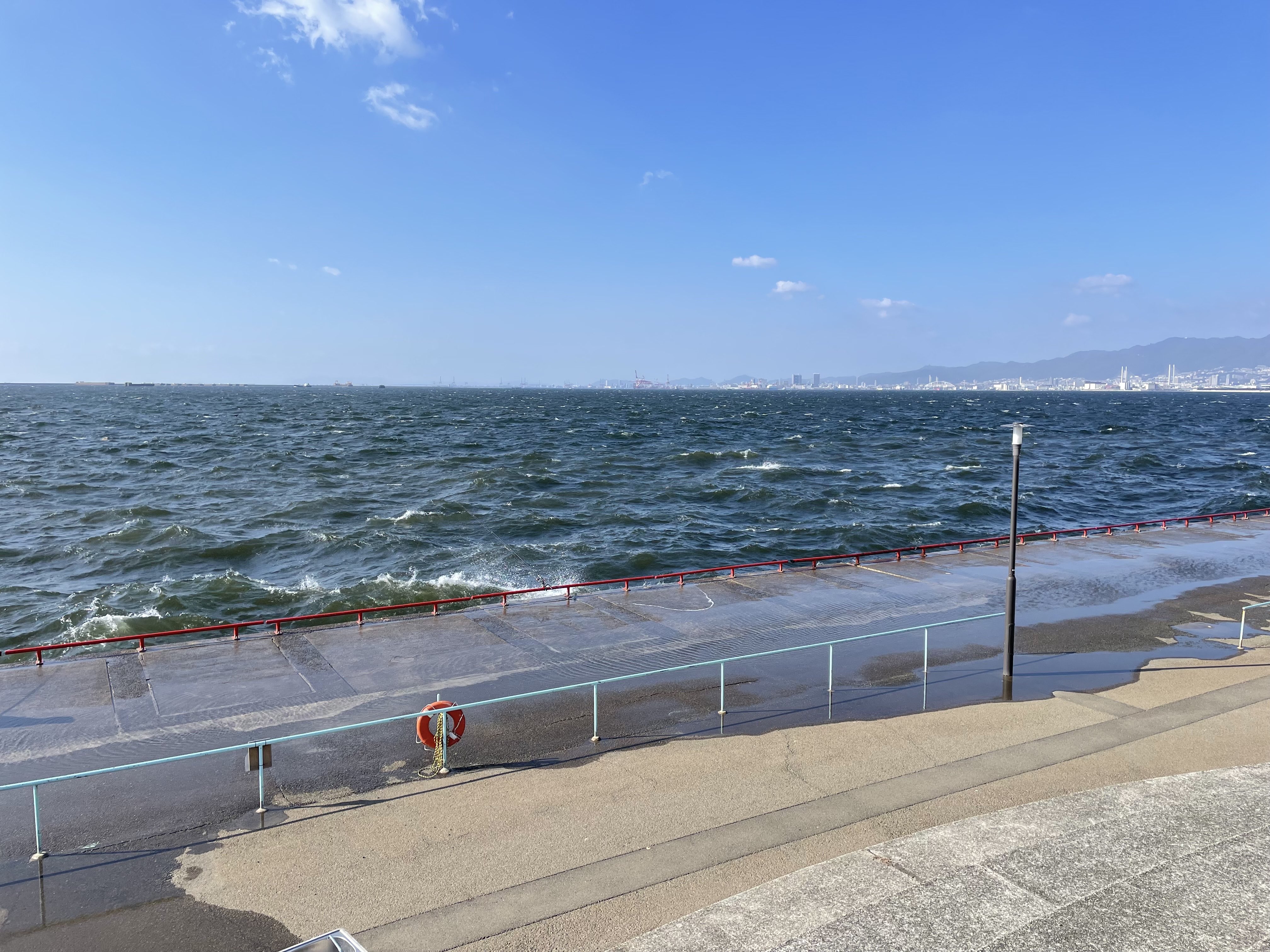 10時40分現在、鳴尾浜は大変強い風にともない、波が一部釣り台に打ち上がっています。