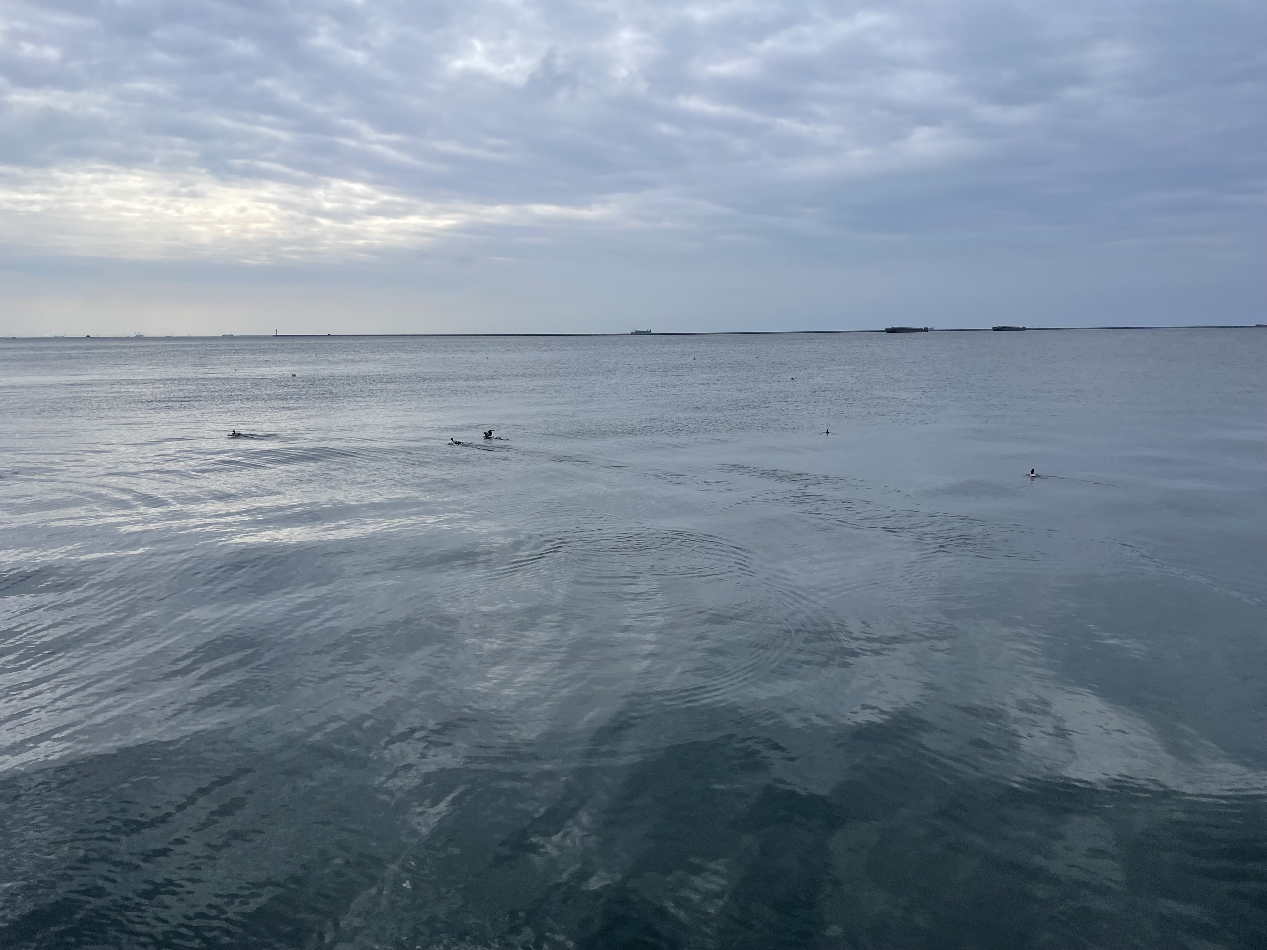 水面にカモがたくさん泳いでいます。アジが2匹釣れました。