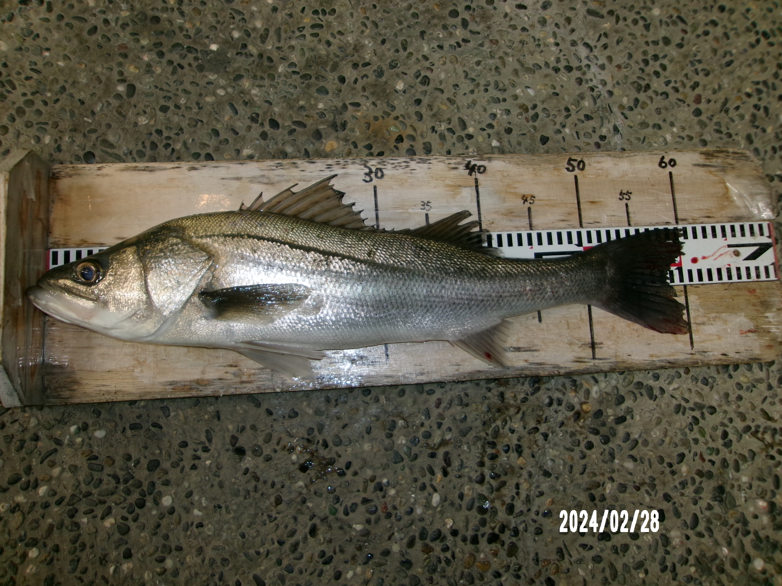 18時半、スズキが釣れました。2月の大物賞、スズキ部門は誰も釣れていなく、今日で終わりの為、残念ながら、スズキ部門はナシか?と思っていましたが、最後の最後に61㎝のスズキを釣れ上げられました。餌は、イソメ、ブッコミ、で釣り上げられました。お見事!