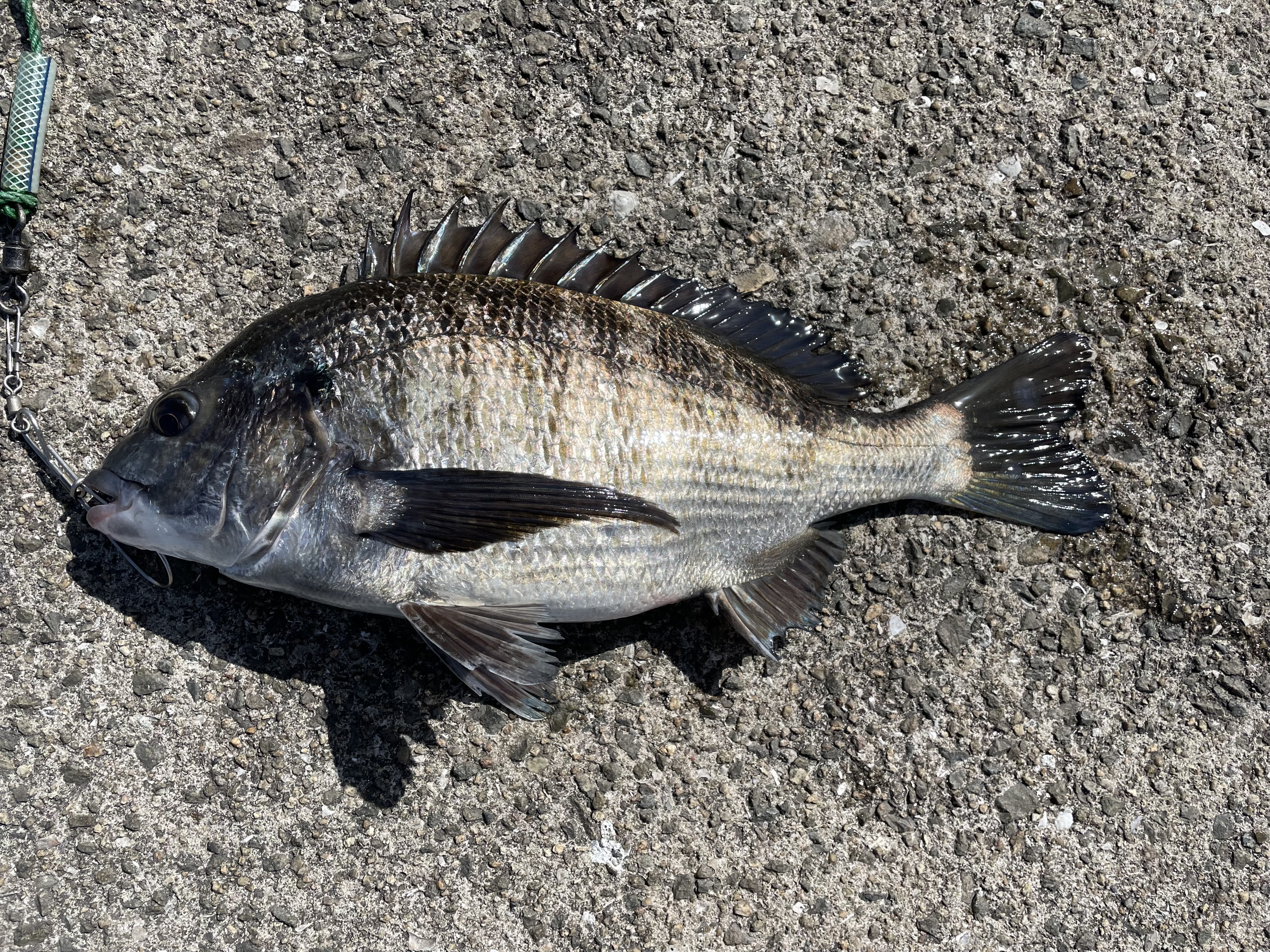 フカセ釣りでチヌが釣れています。エサはオキアミ。とても渋い状況の中での貴重な1枚ですね。