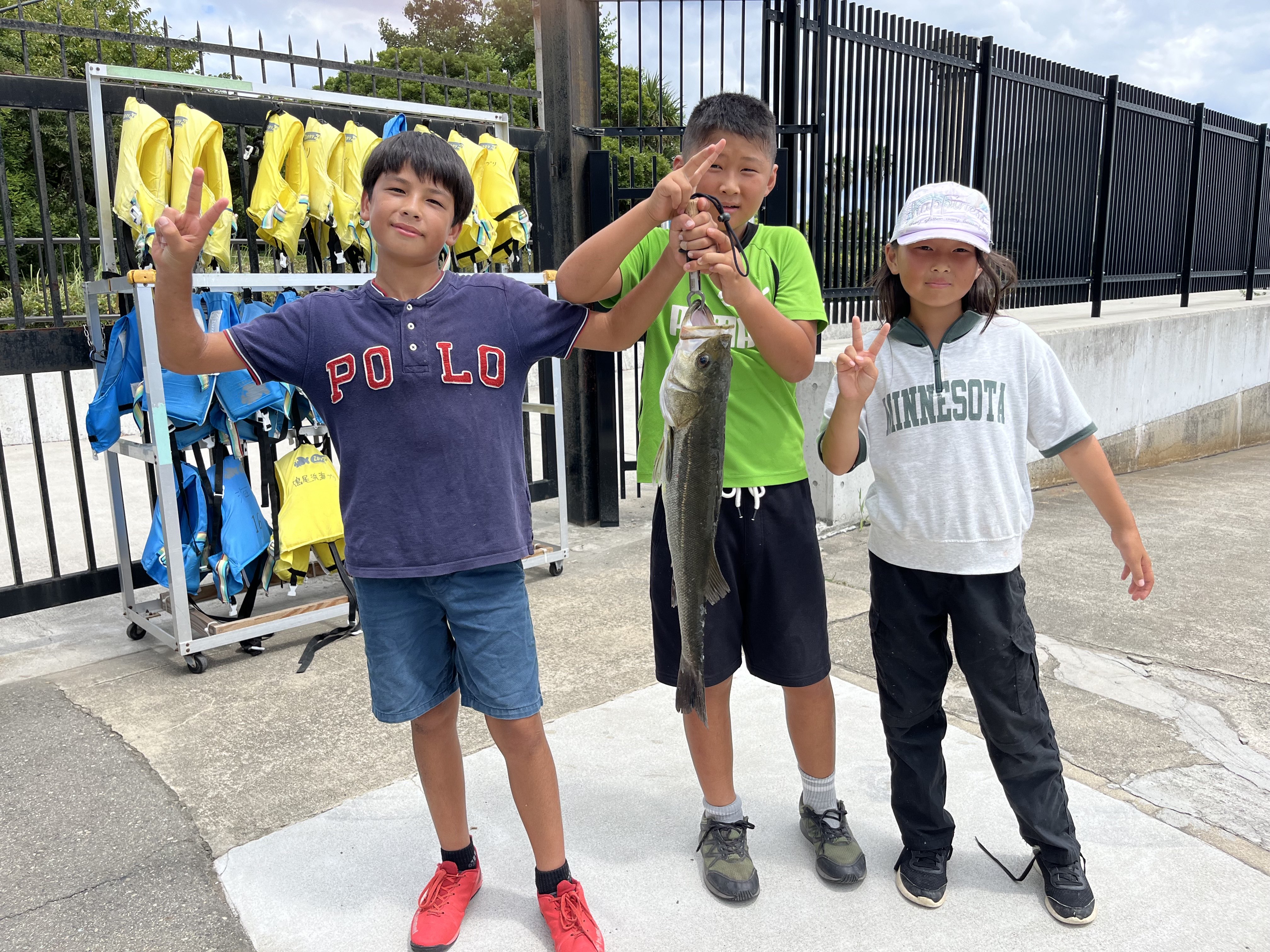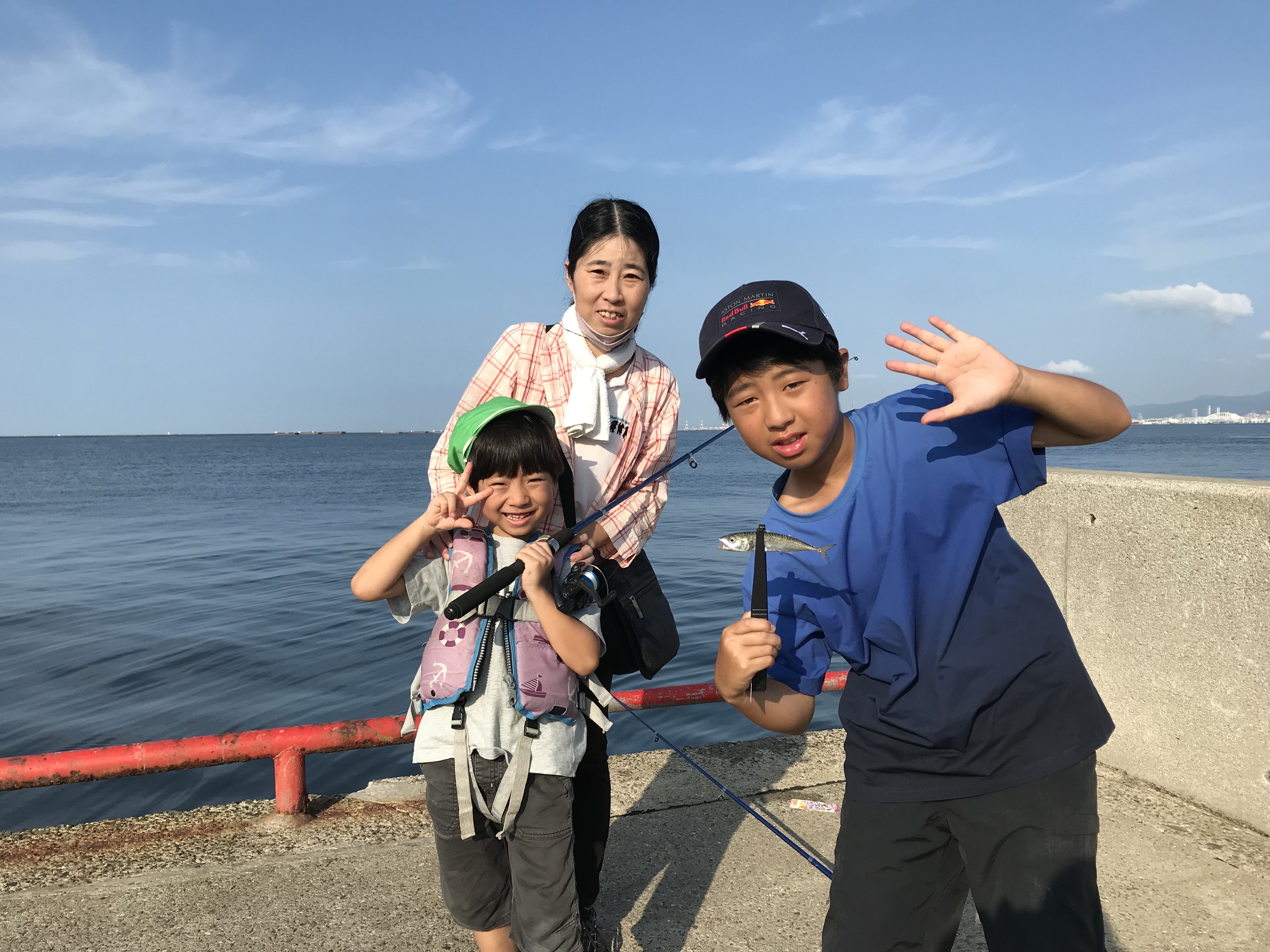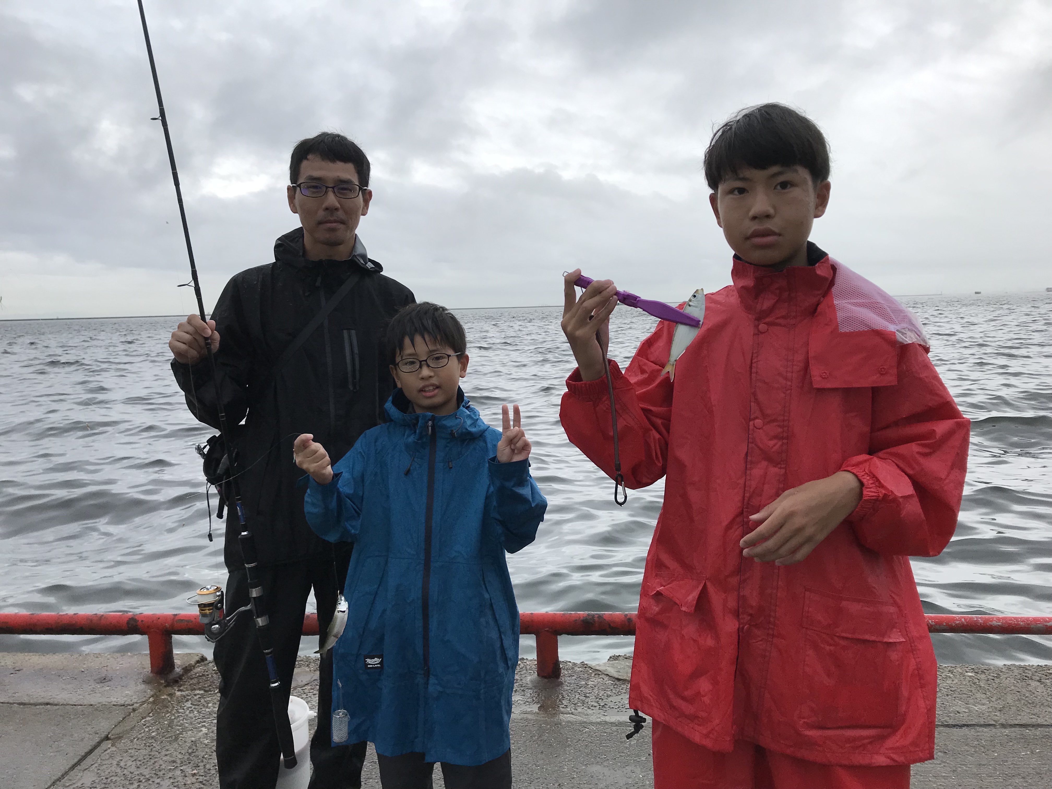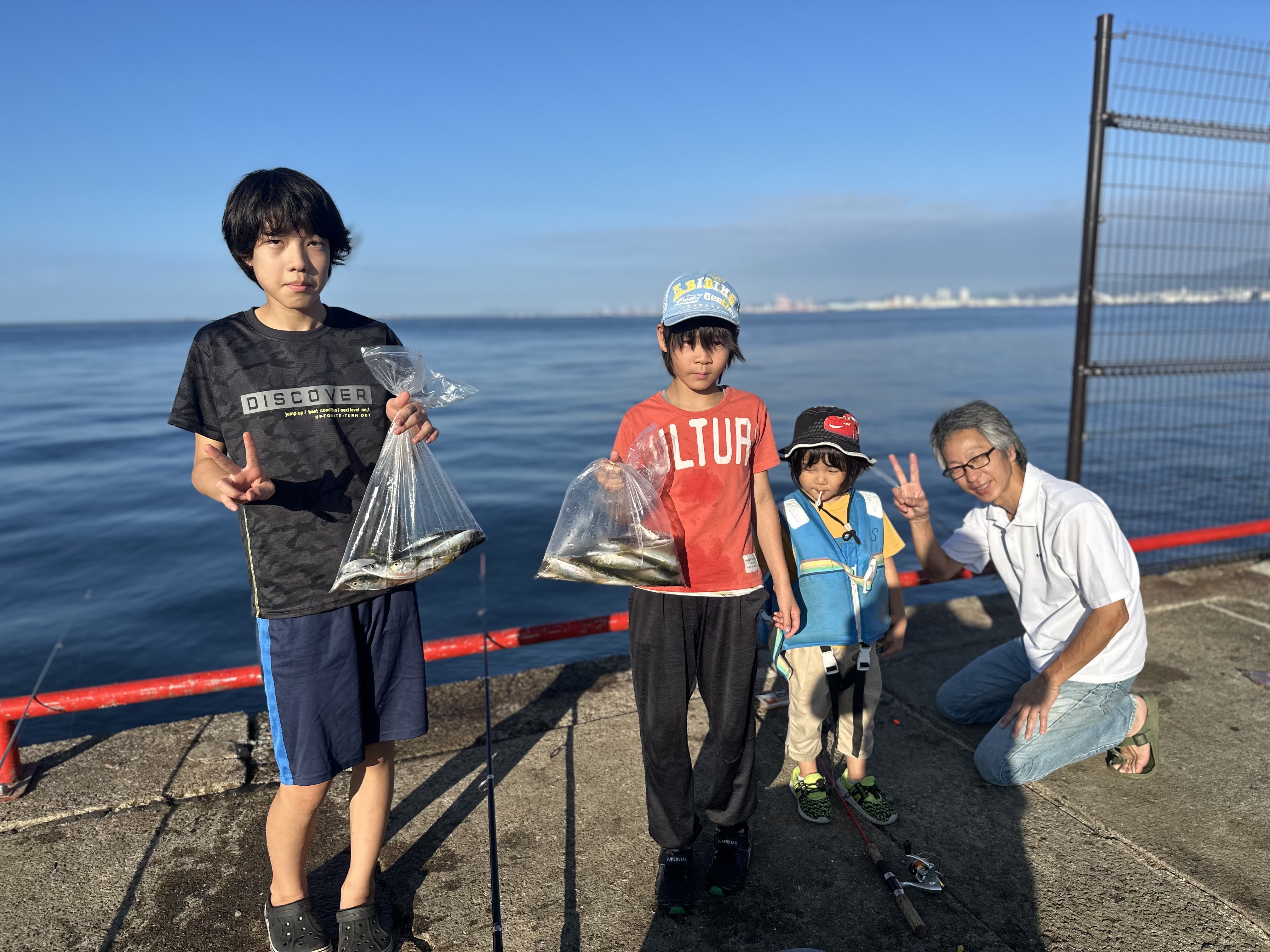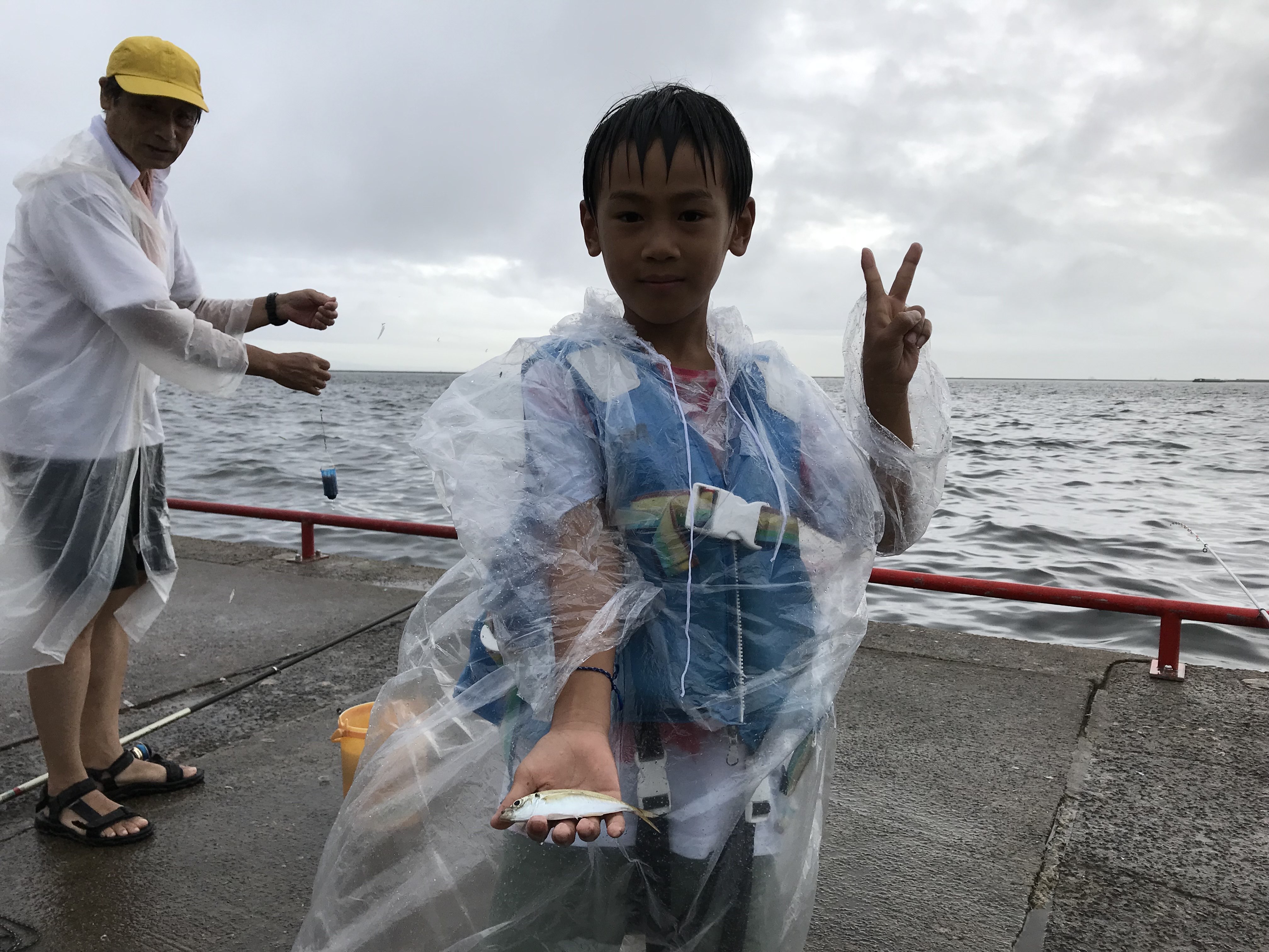 まだ夏休み中なので、子供たちがカッパを着て頑張っています。釣果はサッパ、サバ、アジ、イワシと、続々とビンゴを揃えています。雨が止んだら今日もたくさんの子供達が来てくれると嬉しいですね。