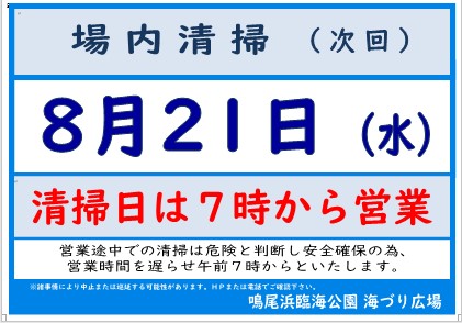 本日の清掃作業は終了しました。午前7時より通常通り開園しております。