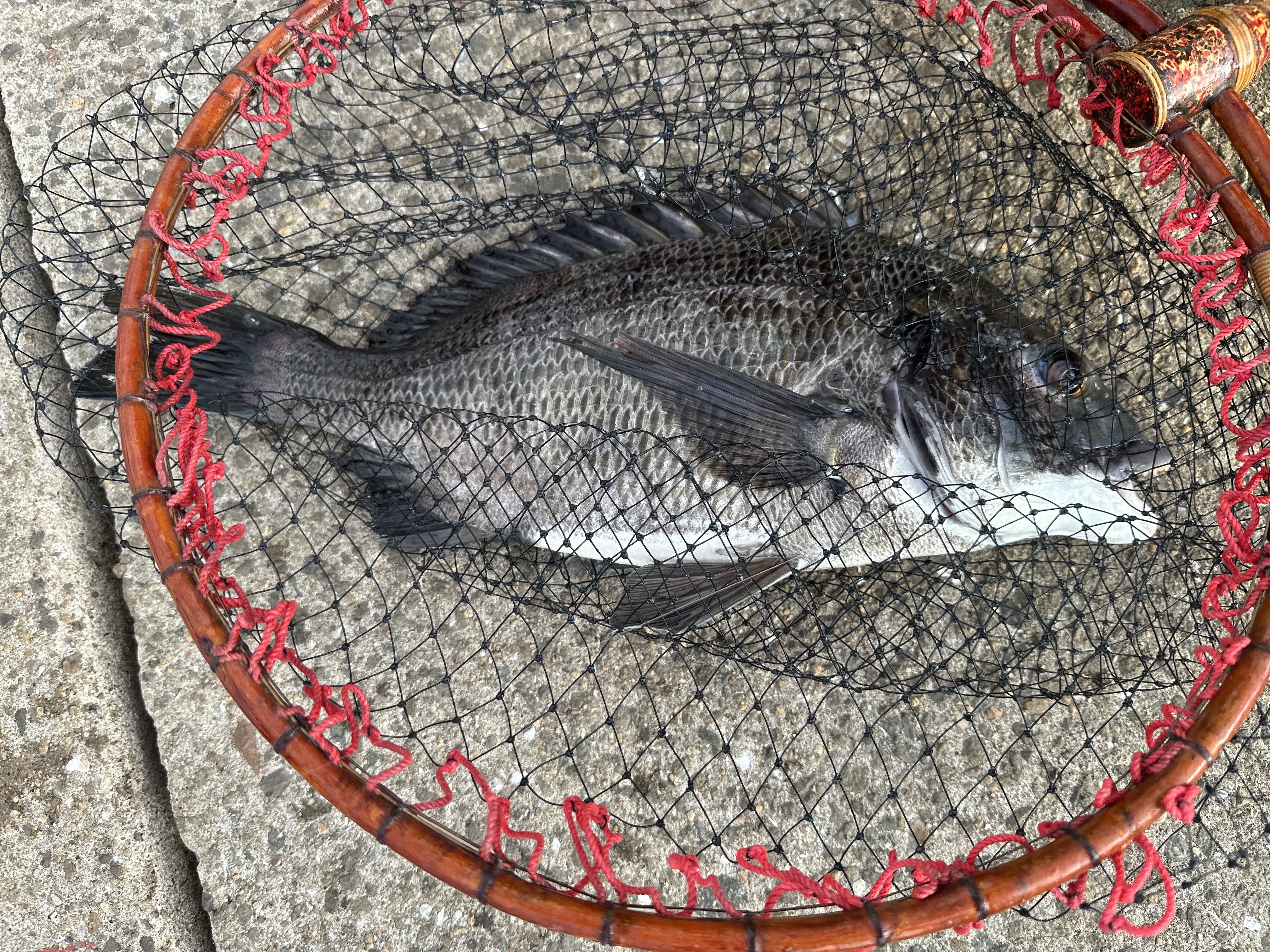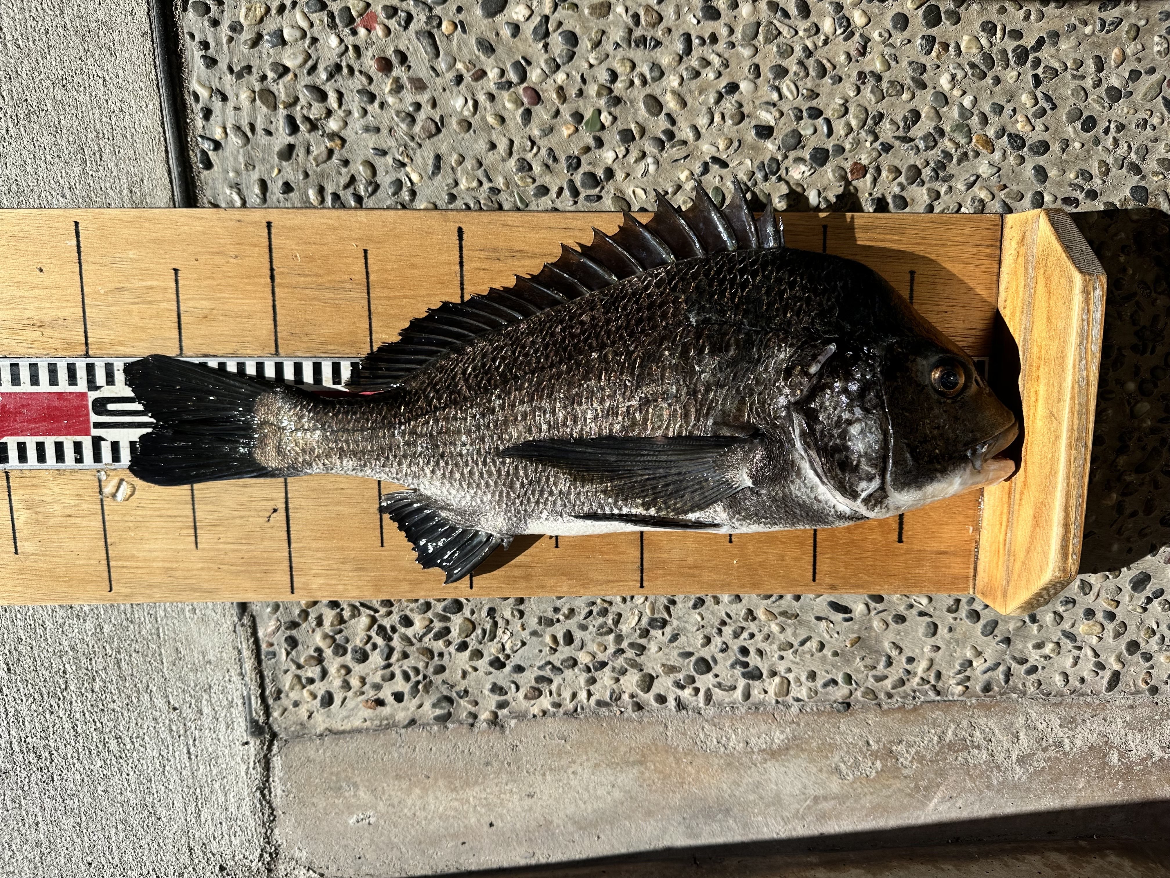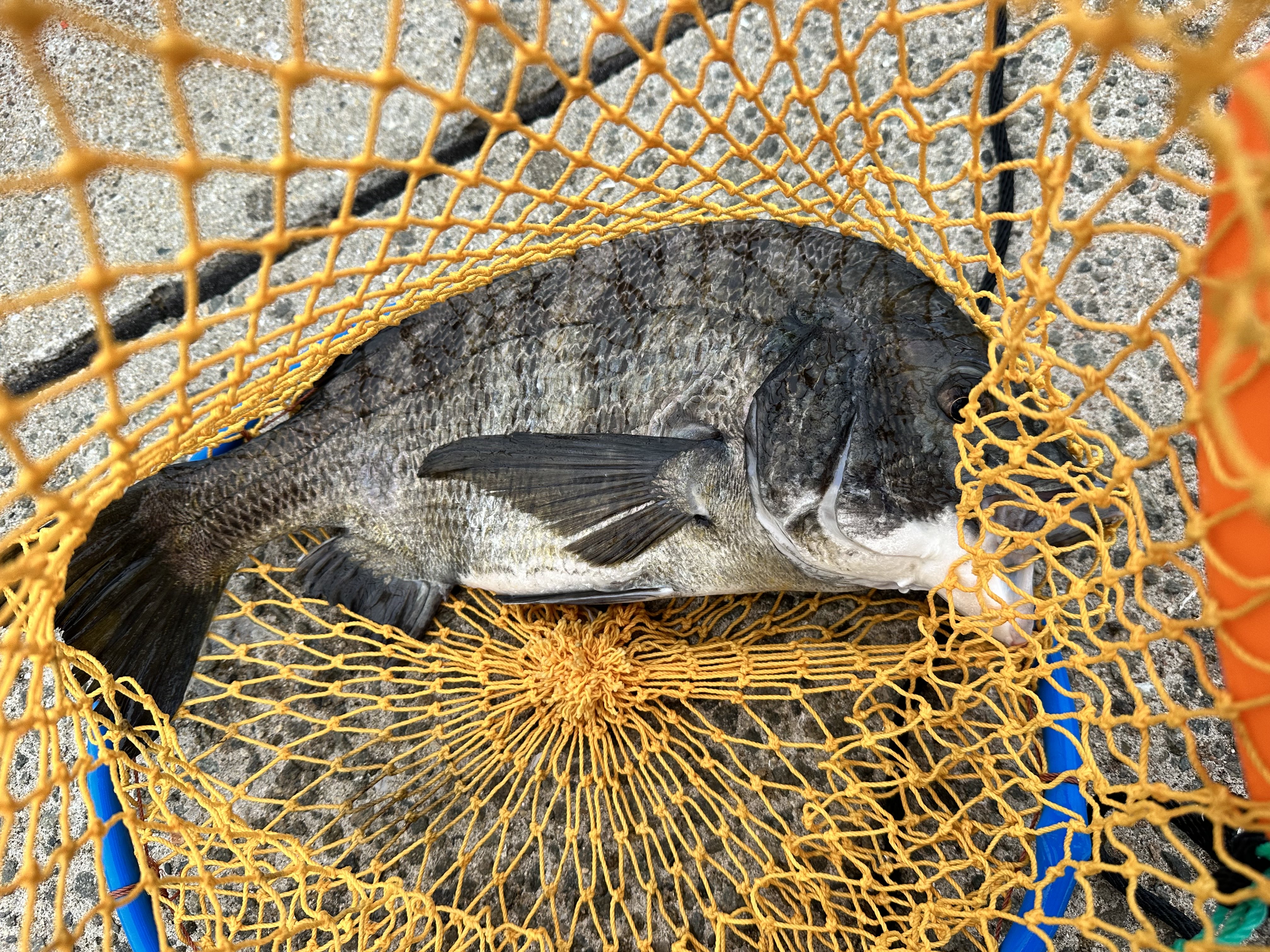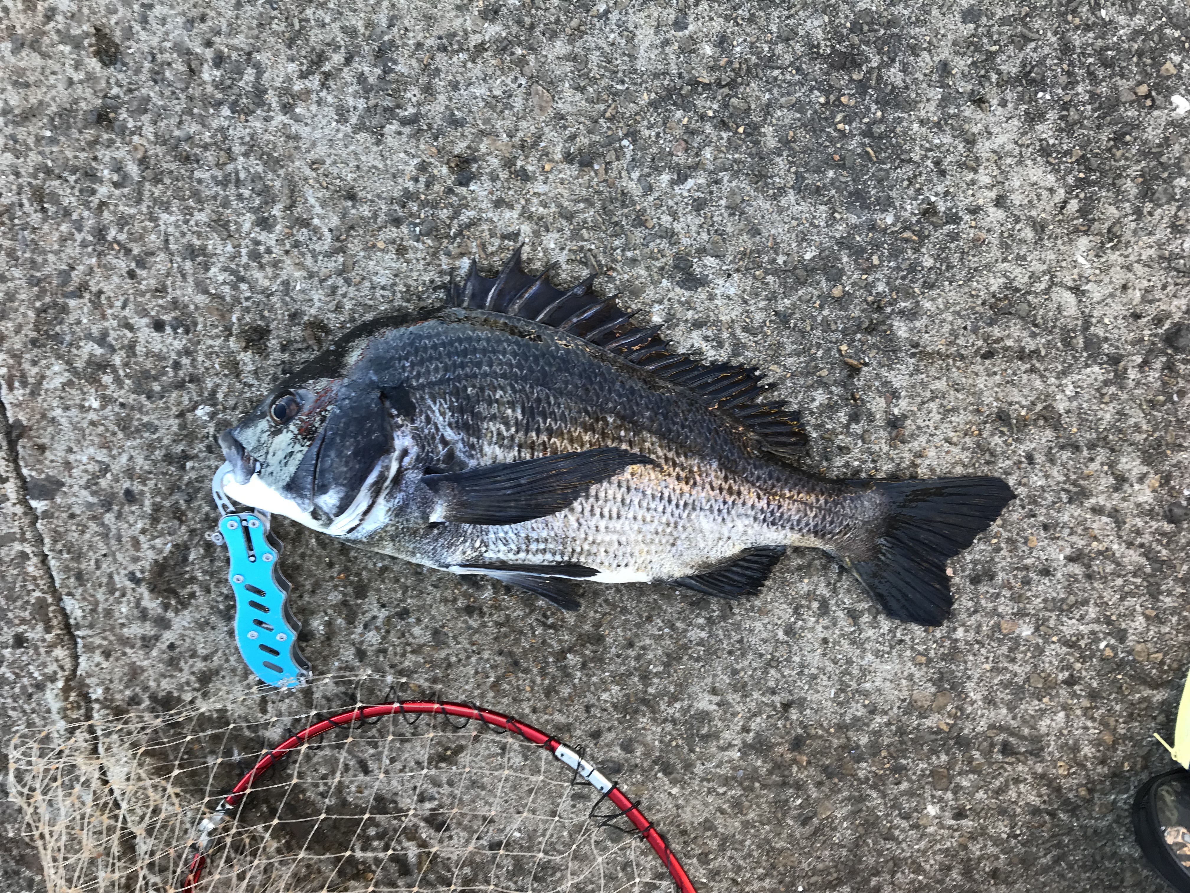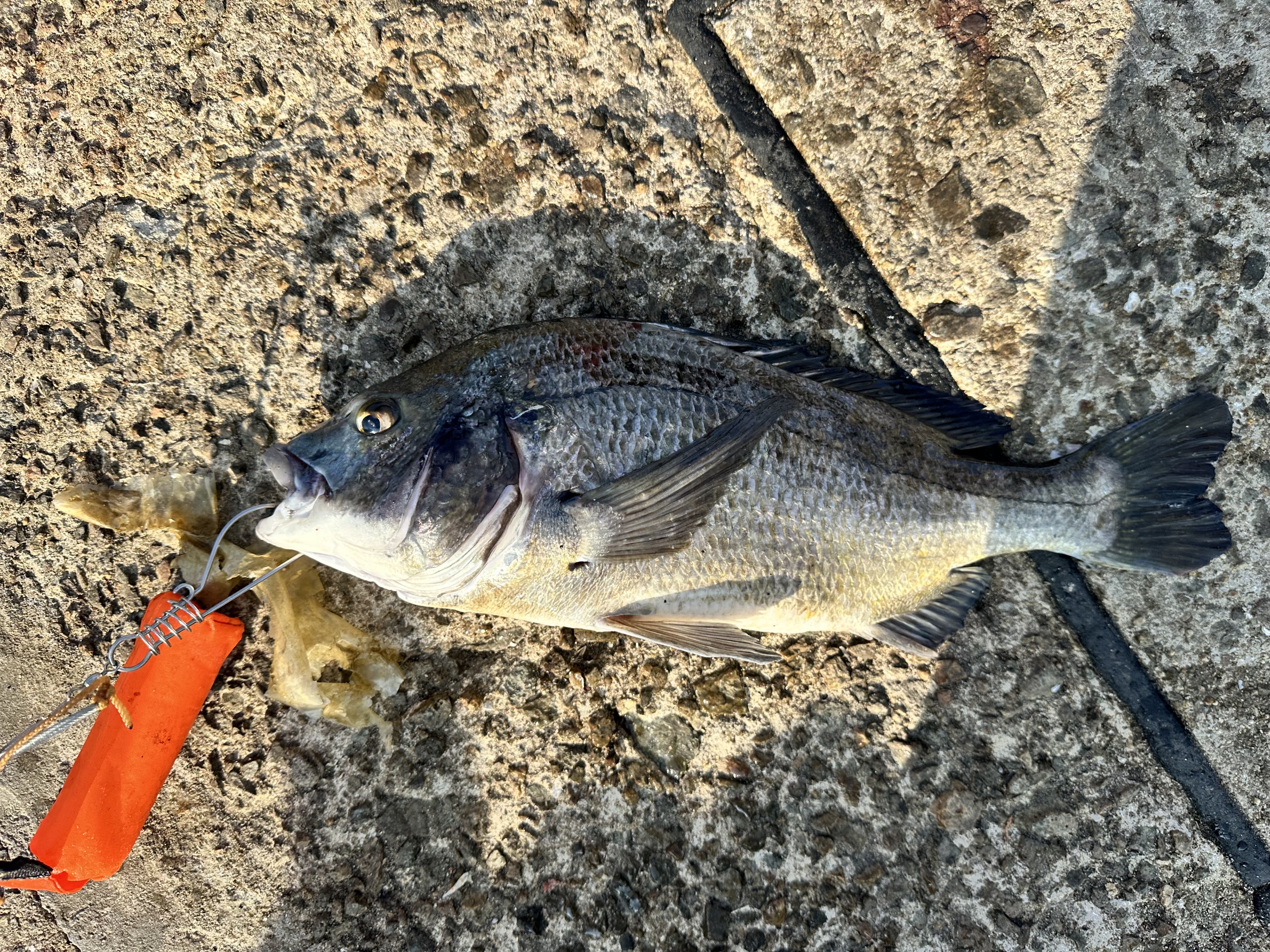7時頃にチヌ46㎝が釣れました。餌はオキアミです。