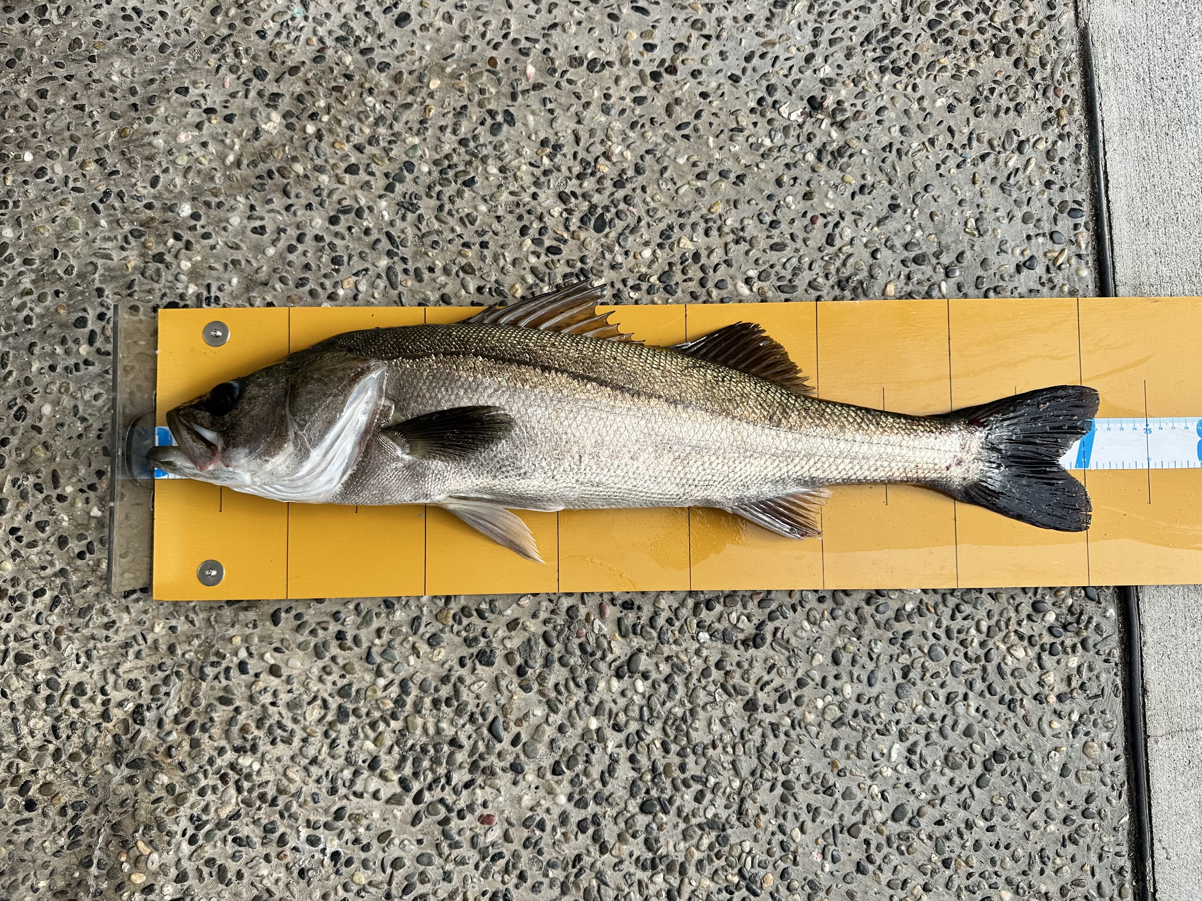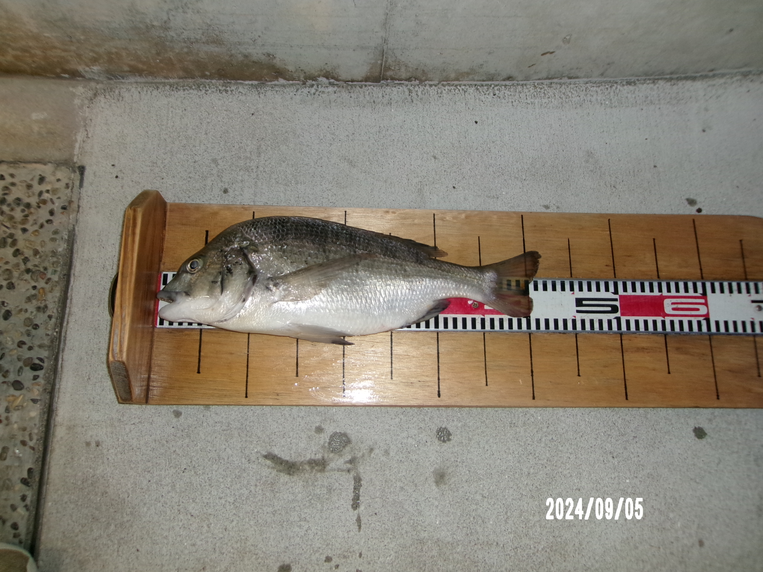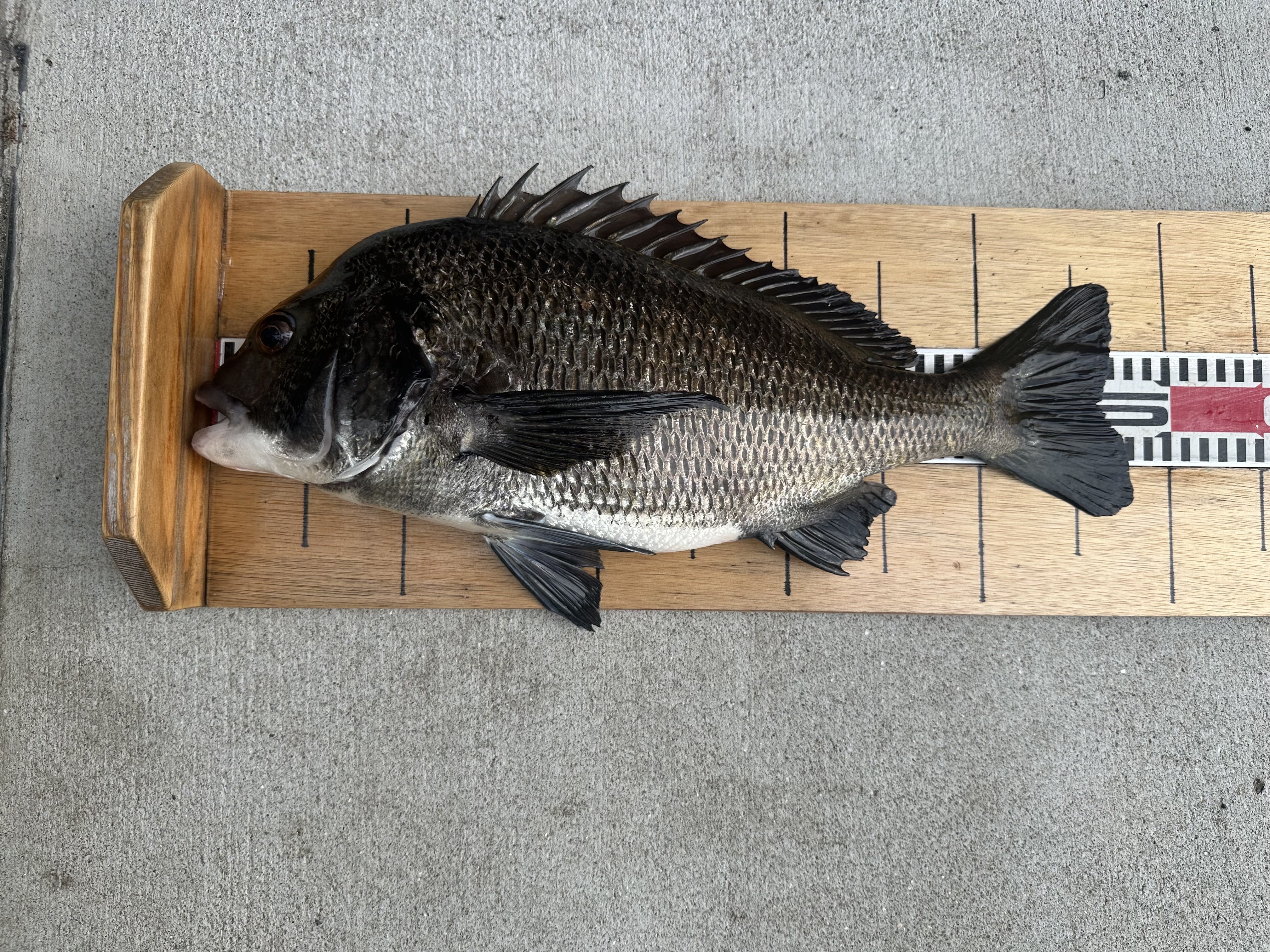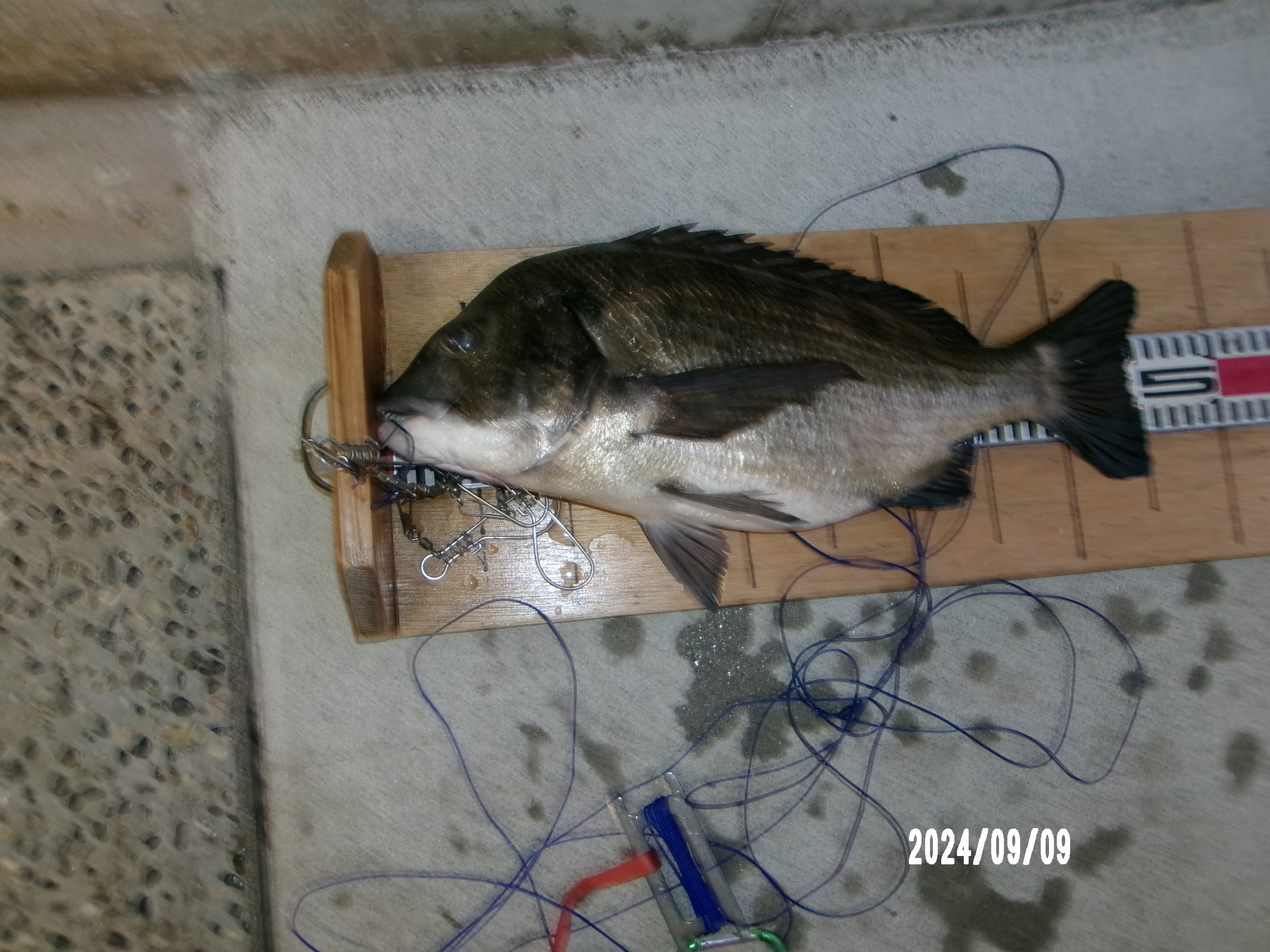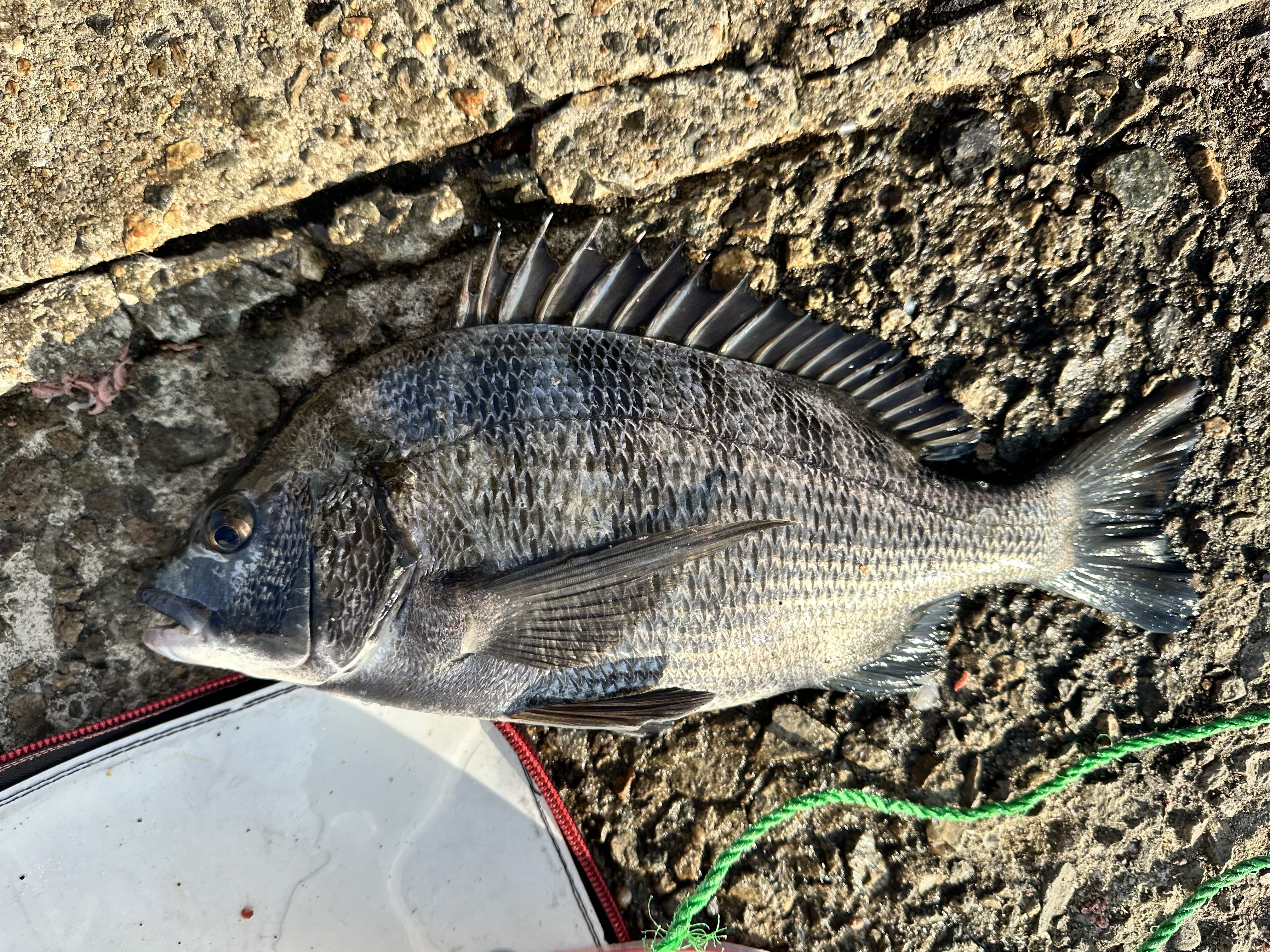 7時頃にチヌ46㎝が釣れました。餌はオキアミです。
