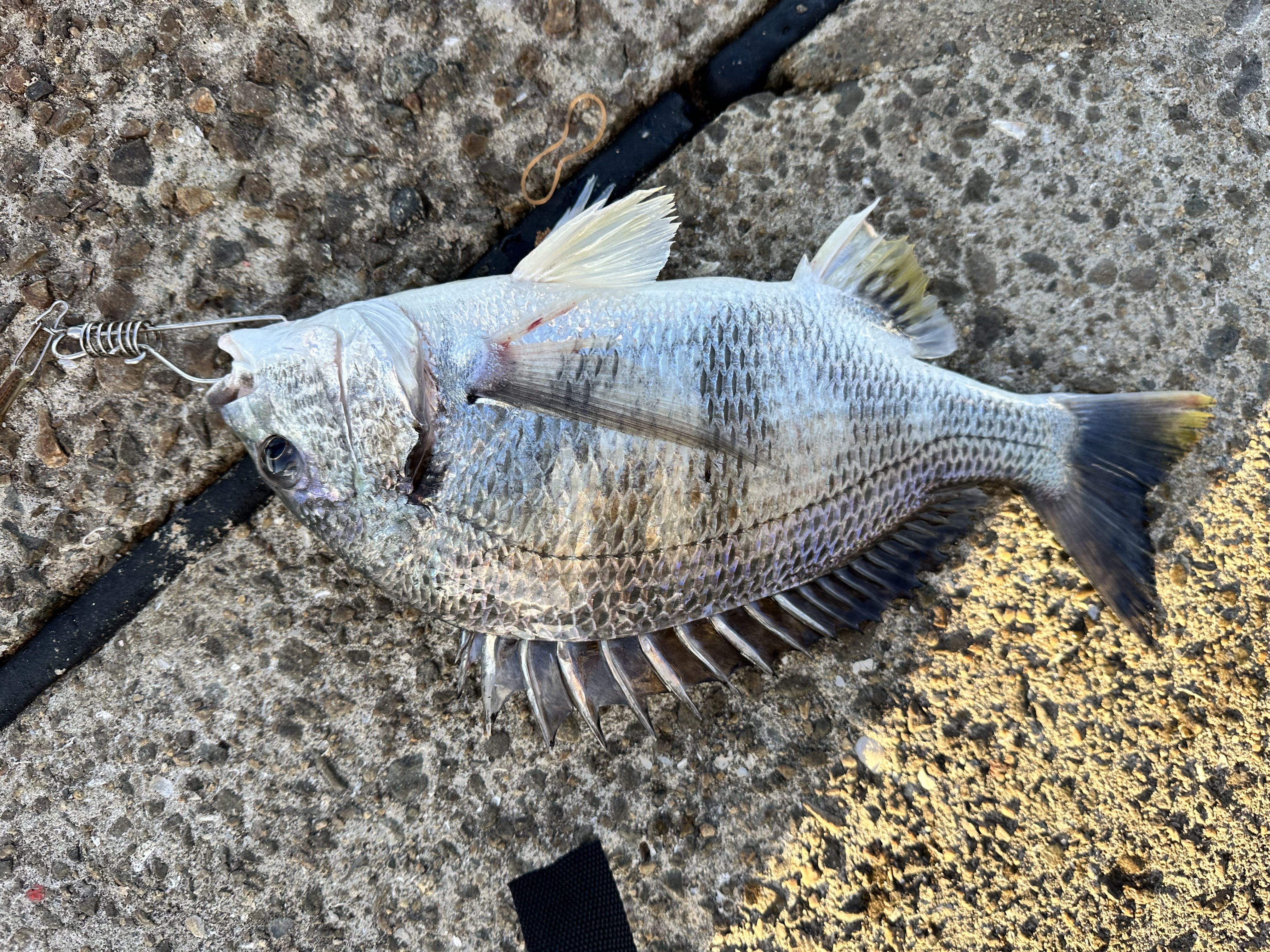 エビ撒き釣で20mほどのキビレ、イソメのズボ釣りでグレ20cm程が上がりました