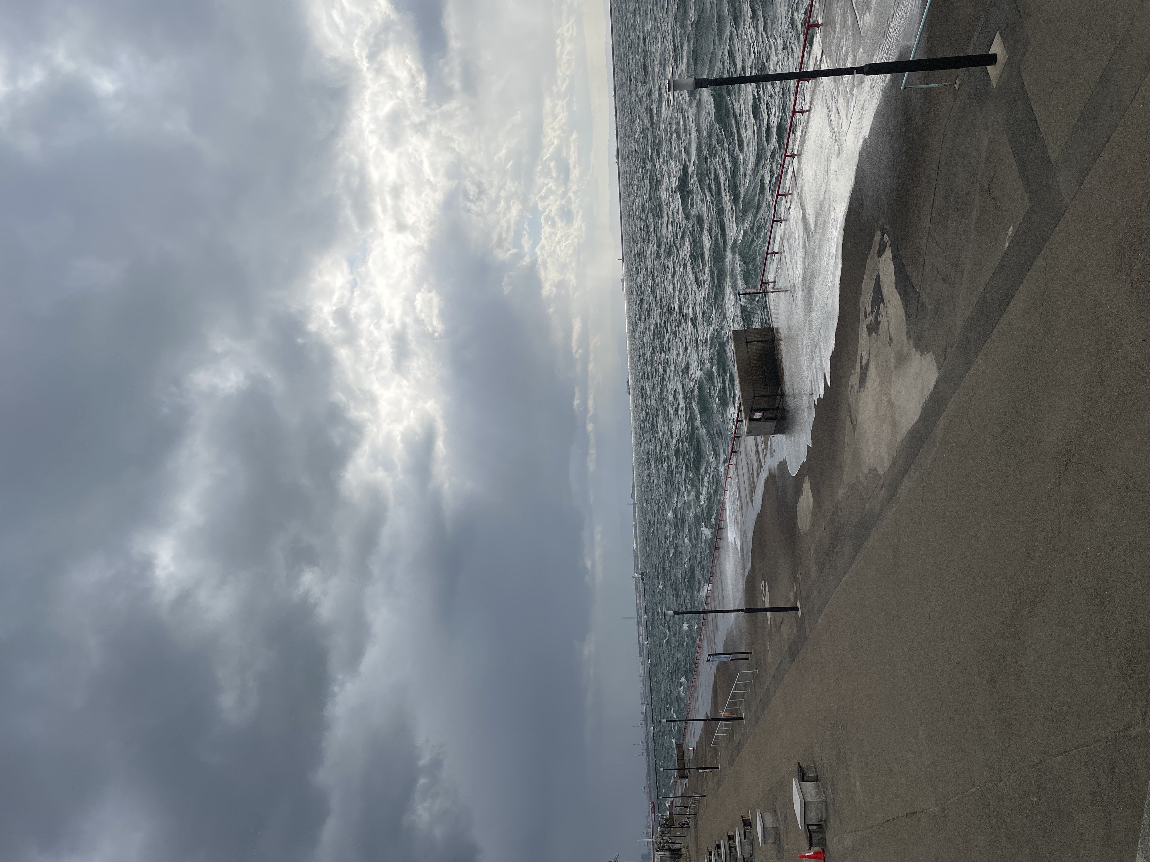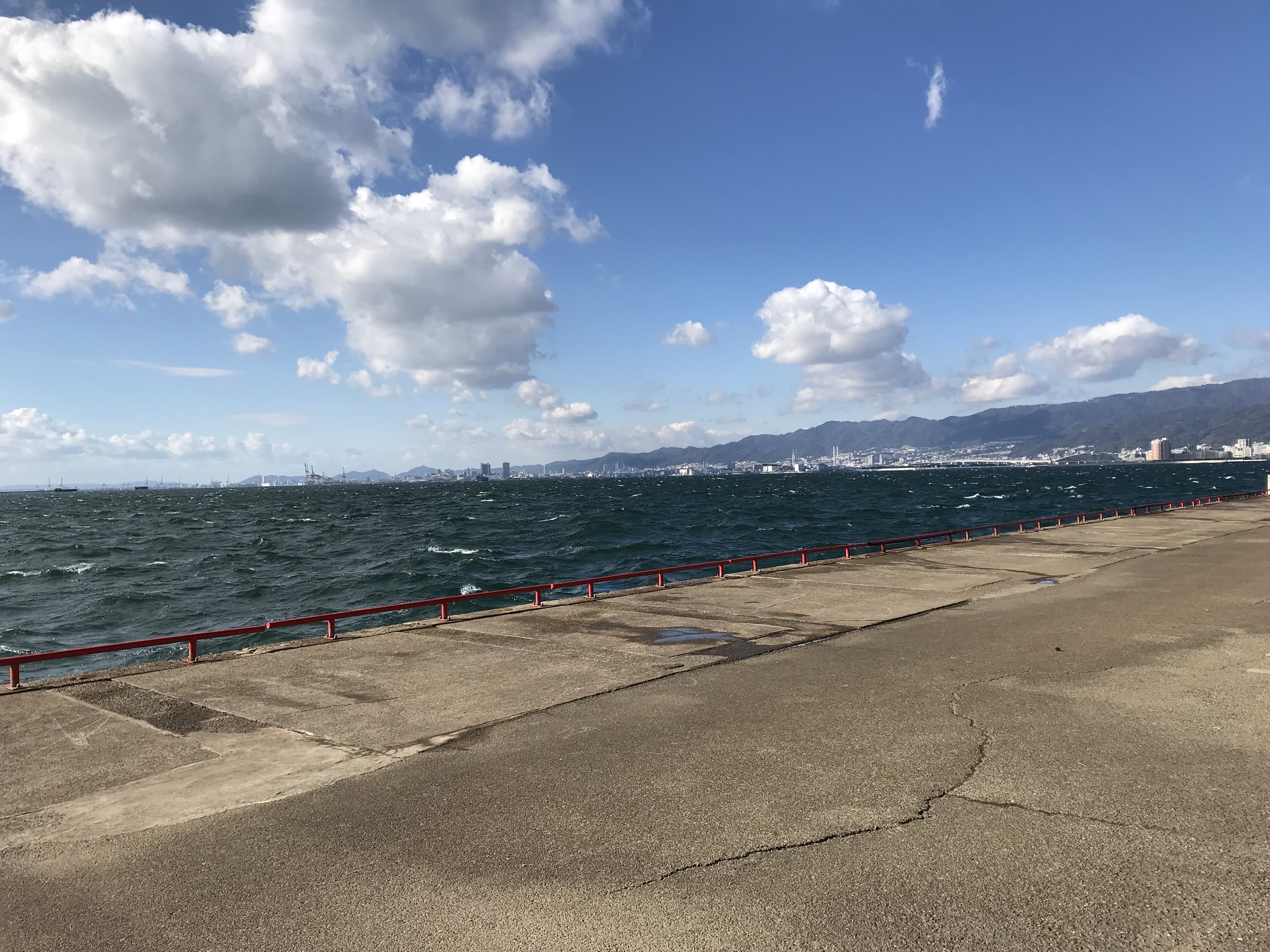 12時10分、鳴尾浜海づり広場は強い風が吹き波が高いため、安全を考慮し一時閉場といたします。