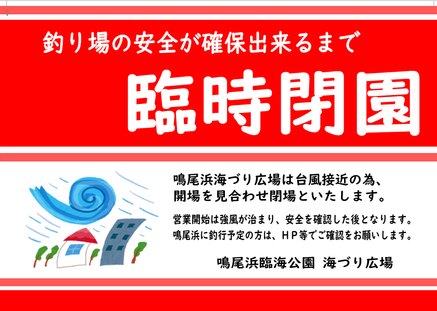 午後からも風波が強いため臨時閉園を持続しております、ご迷惑をおかけしておりますが、ご理解とご協力をお願いします。
