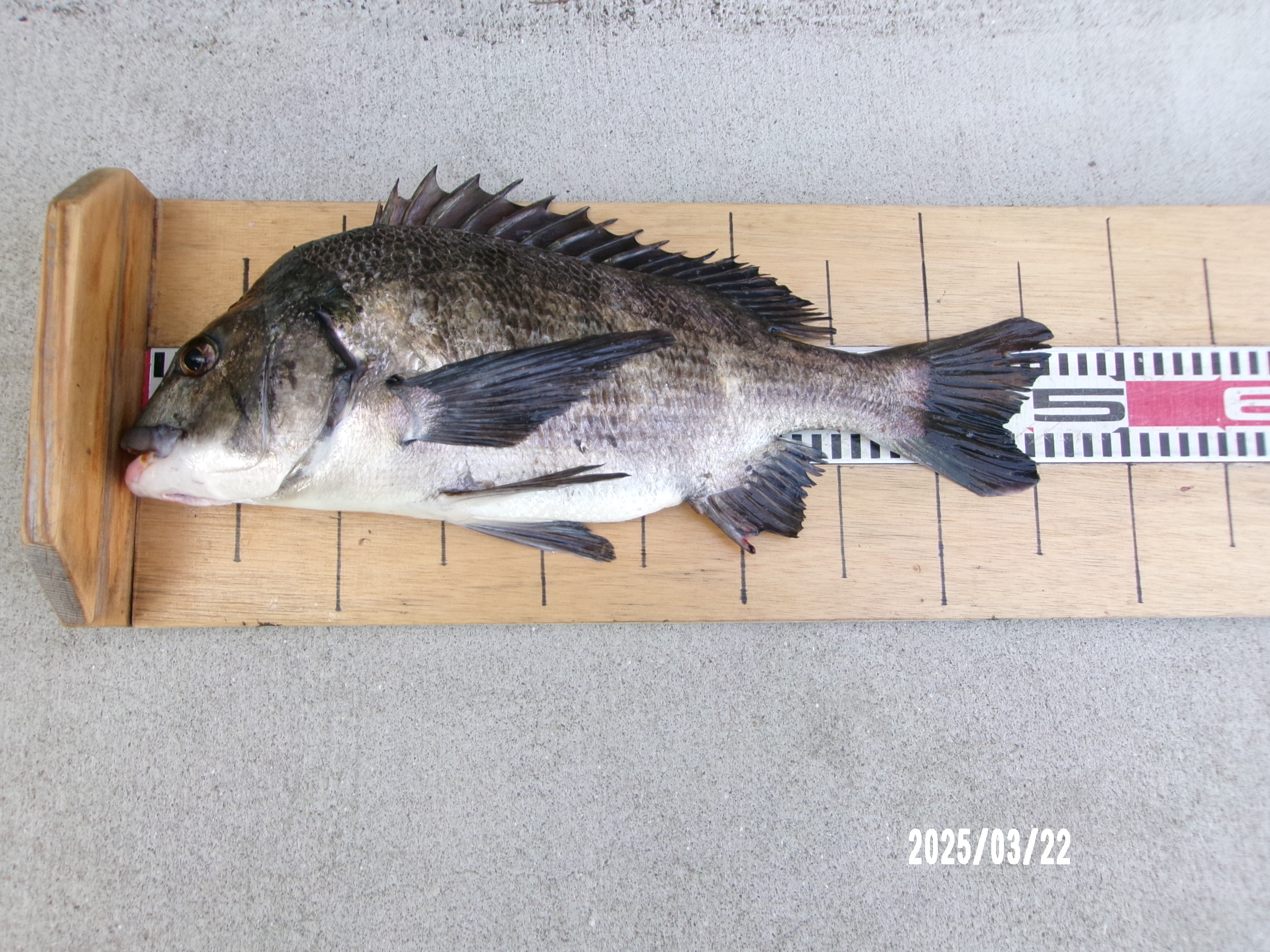 午後3時20分、シラサでチヌ45cmあがりました。お腹パンパンでした。また昼過ぎに東端でチヌ44cm餌オキアミを釣ったとの報告を頂きました。 -