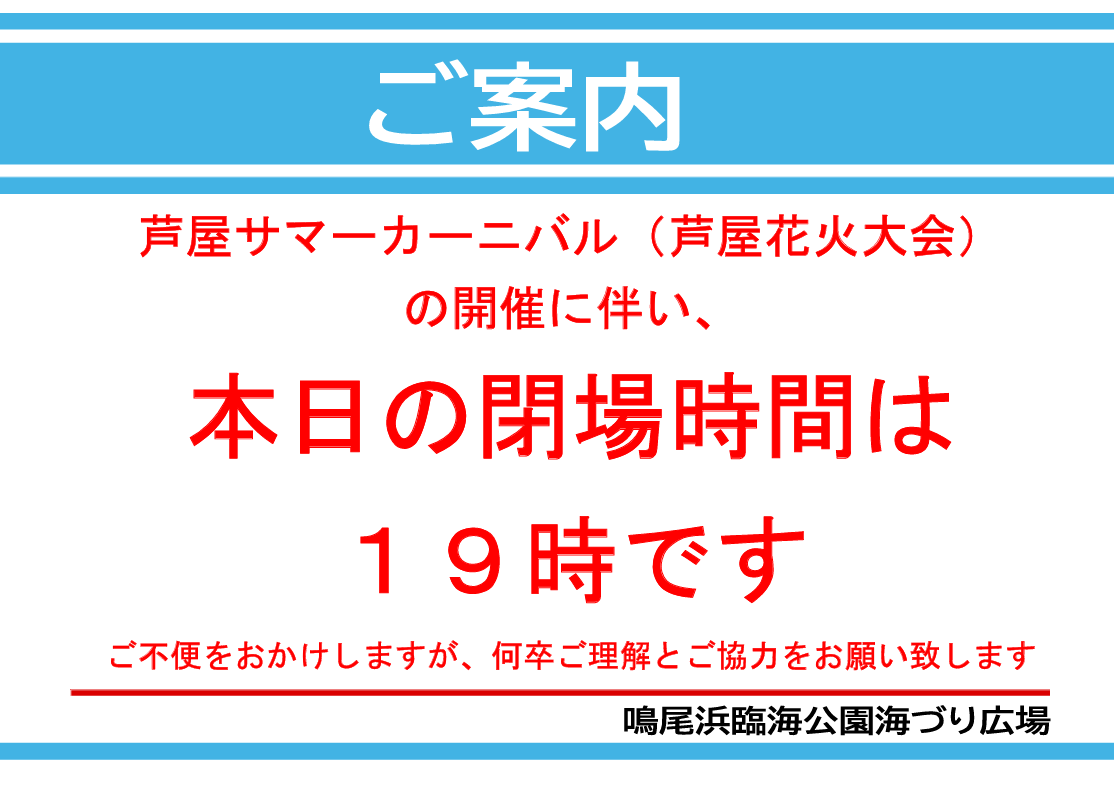 本日7月26日(土)は、「芦屋サマーカーニバル(芦屋花火大会)」の開催に伴い、閉場時間を通常の20時から、19時に繰り上げさせていただきます。