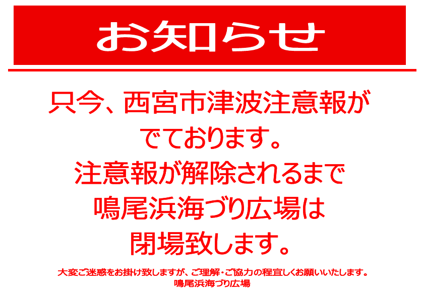 津波注意報が解除されたので、鳴尾浜海づり広場は11時より開場致します。