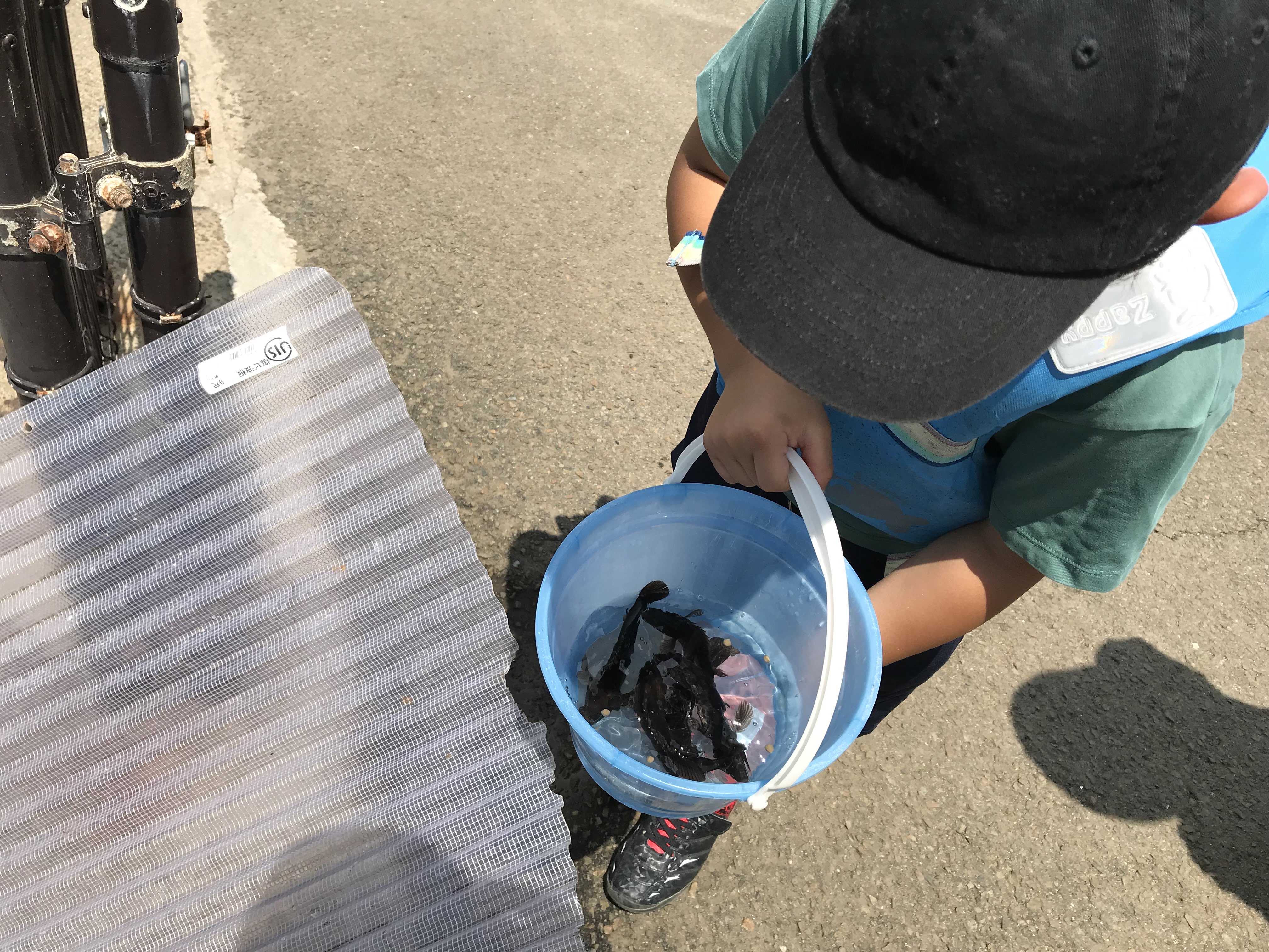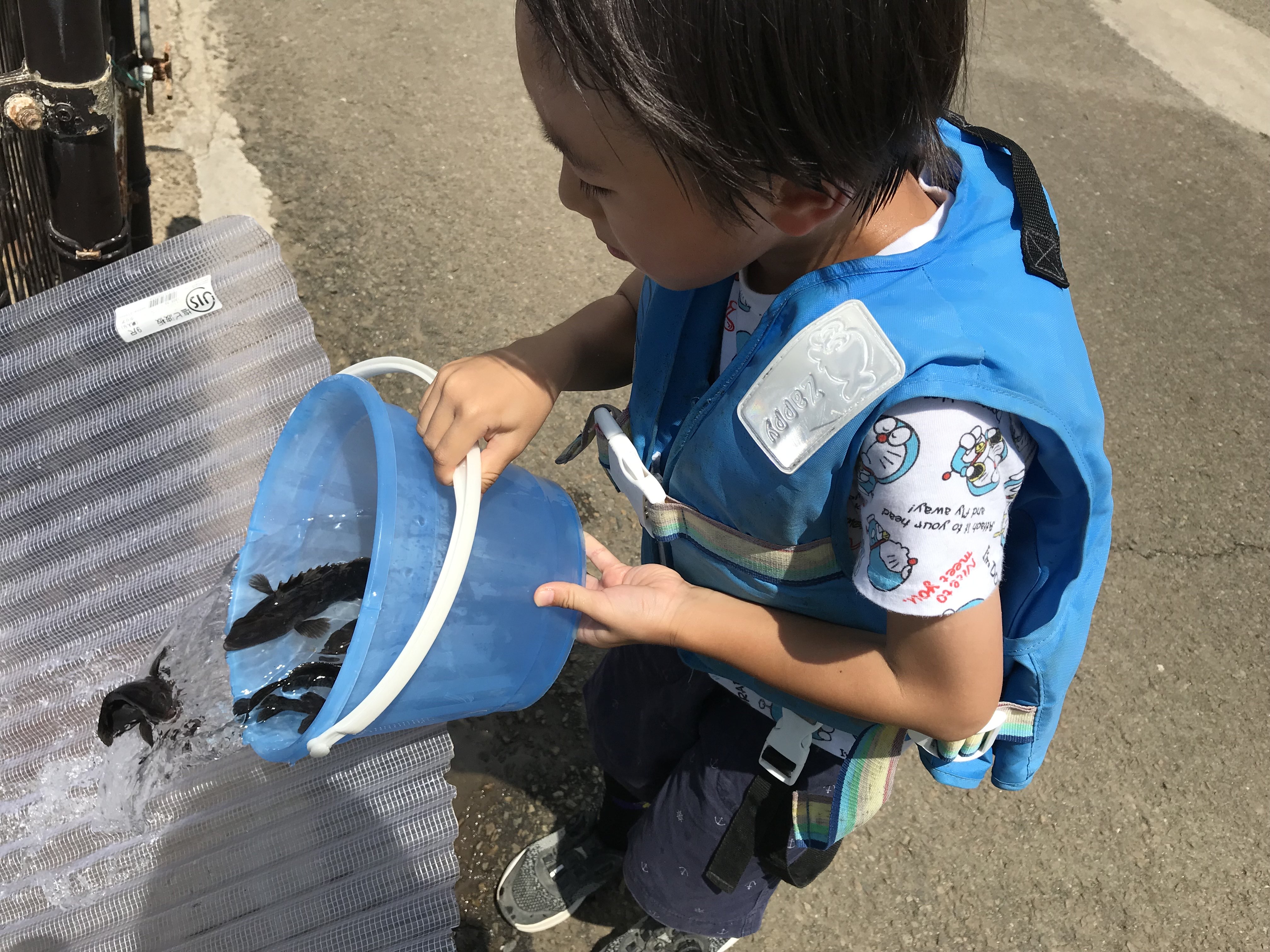 キジハタの生態などの説明を聞いた後、バケツにキジハタをすくい放流しました。