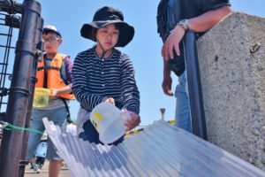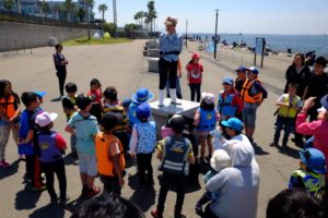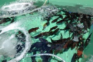 子供さん達はヒラメとカレイの違いや、キジハタ(アコウ)の成長過程等の説明を聞いたあと、各自バケツに稚魚をすくい大きくなって釣れる事を願い放流開始、たくさんの稚魚達は大阪湾へと消えて行きました。