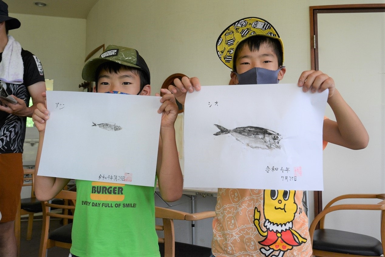 初めての魚拓で皆さん戸惑いつつ頑張っていました、うまくとれたかな?