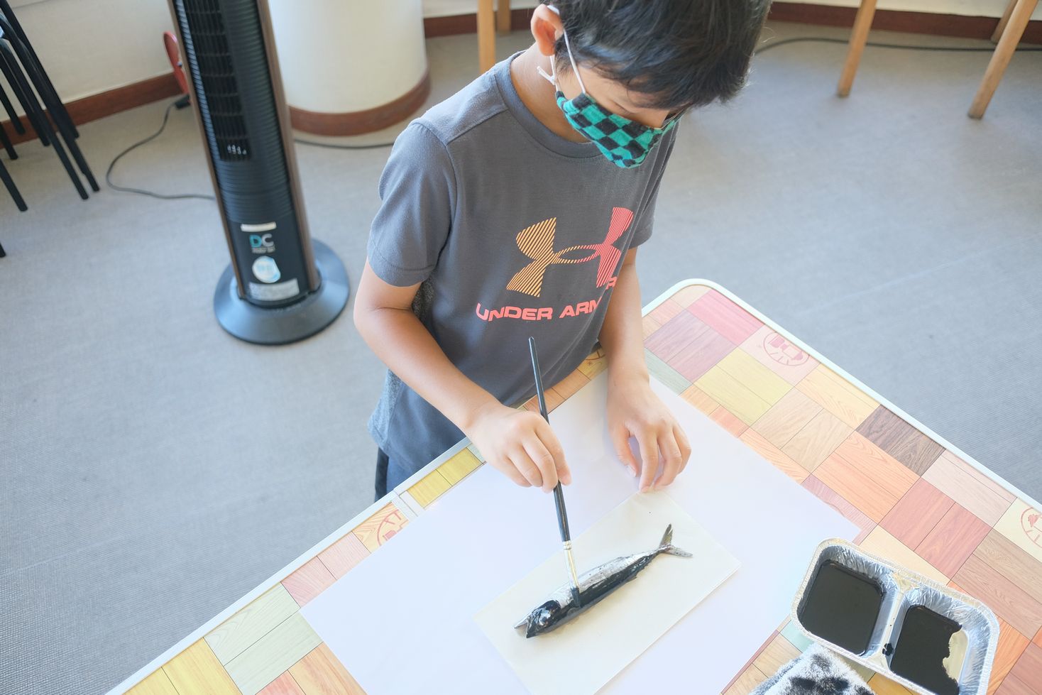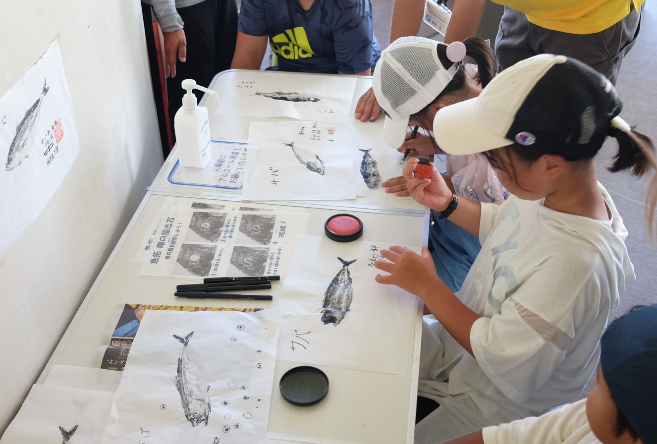 魚の背中とお腹の色の違いを表現する為に、「濃い墨」と「薄い墨」の二種類の墨を使い分ける事や、目には墨を塗らず、後で目を描く理由、半紙に転写する時の力加減などを学び、指導員付き添いのもと実践。魚名、日付、名前、そして落款(判子)を捺し完成!