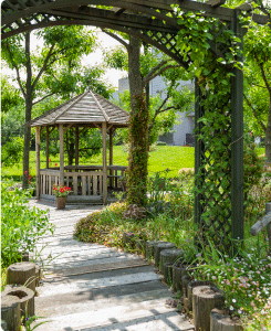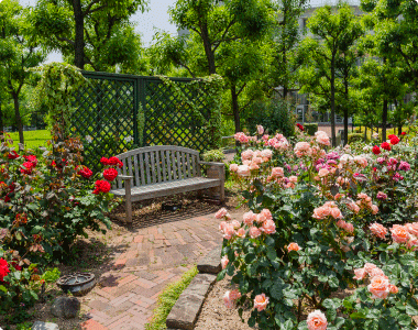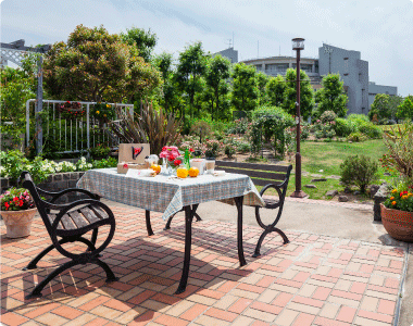 あずま屋やテラスガーデン、ベンチを設置しているので、ゆっくりと美しい花を観賞しながらくつろげます。お花のスケッチやバードウォッチングにも最適です。