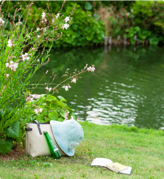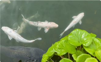 コイが泳ぐ小川と季節の花々が咲き誇るフラワーガーデン。