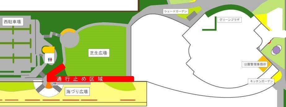 それに伴い、下記地図の赤色区域が通行止めとなっております。