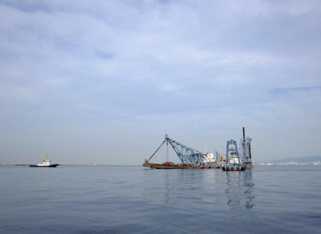 鳴尾浜の隣に5月15日から停泊していたポンプ式浚渫船が8時に離岸、移動した後の停泊場所にベイトが多く居たようで、いっせいに鵜が集まり、クチバシにはイワシやイナコを咥えていました。昼には60~70cmはあろう大きなウナギもしくはアナゴを咥え、呑み込むのに四苦八苦していました。