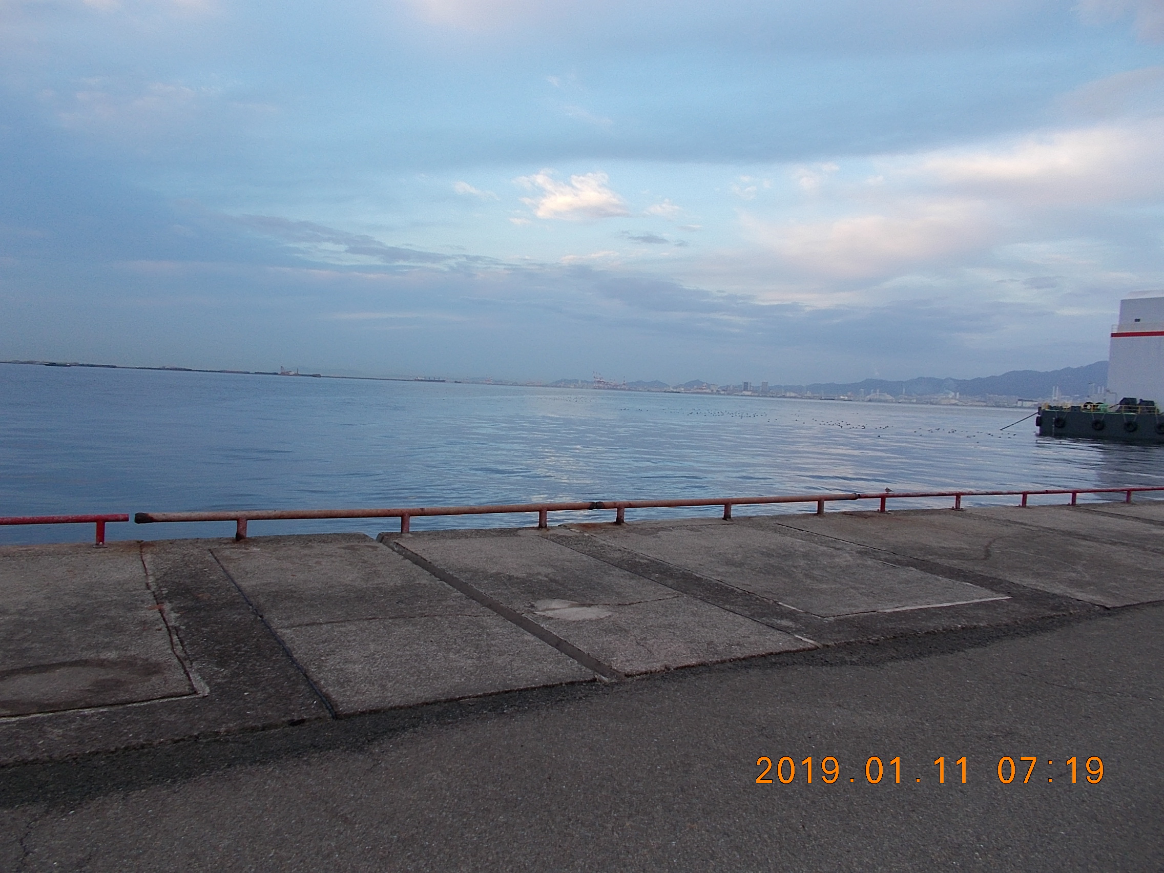 朝一、風なく海面おだやか。予報では12℃くらいまで気温が上がるとのこと。