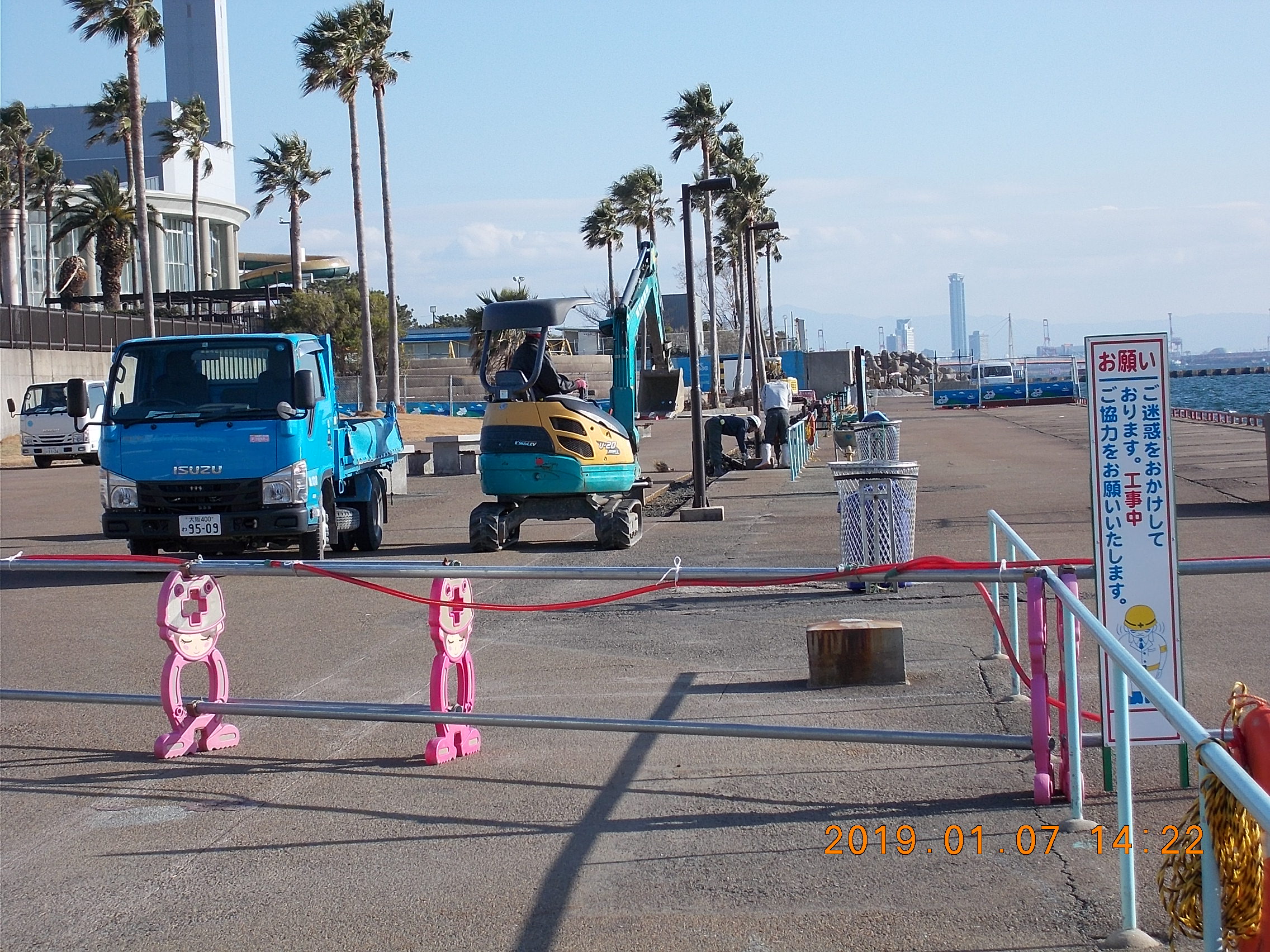 8時30分現在、波も風もなく広場はぽかぽかと日がさしてコンディション的には良いのですが、広場工事の為お客さまの姿がほとんどなく開園時から一名の方がズボ釣りを楽しんでおられますが今のところ釣果はないようです。