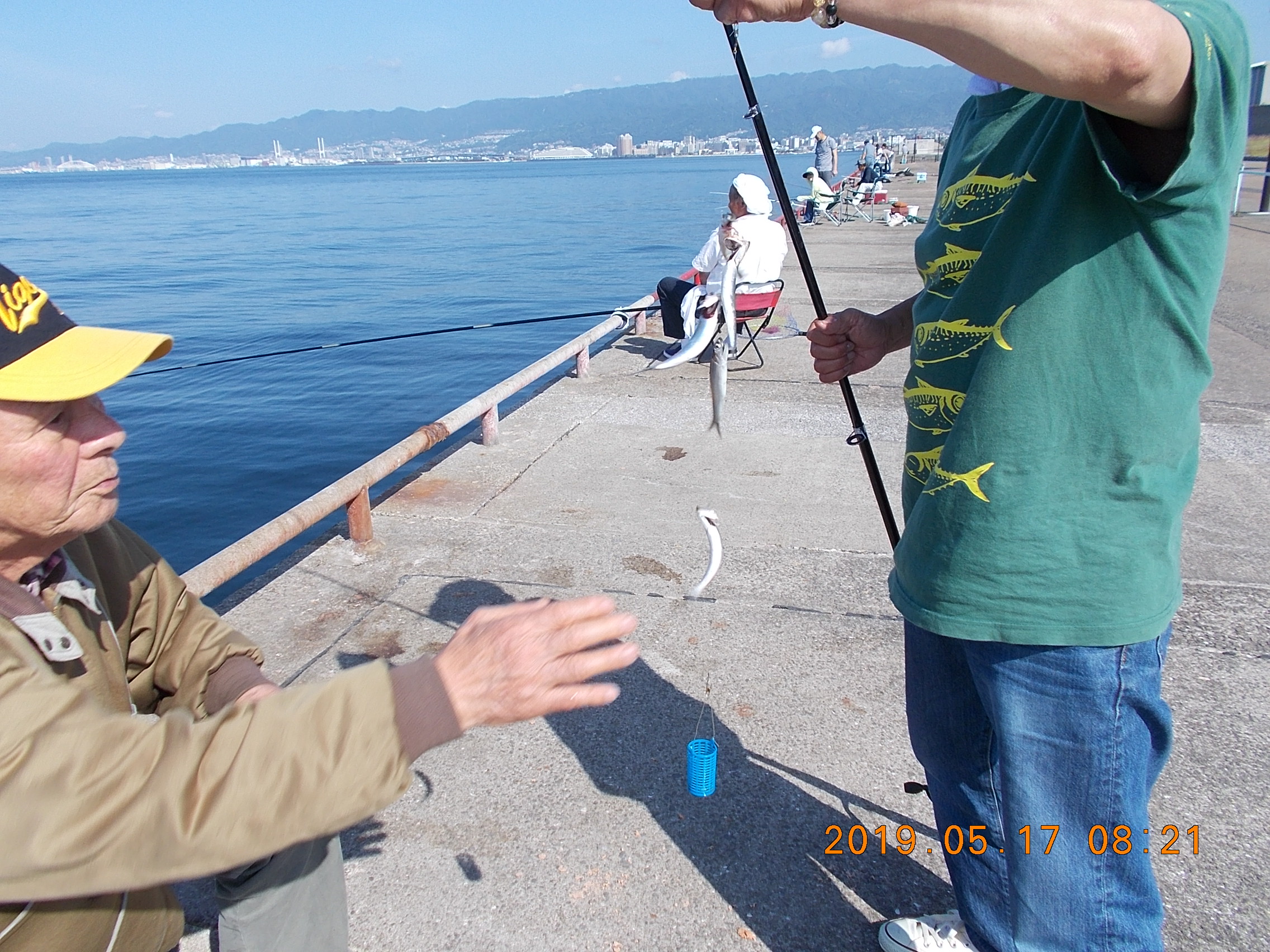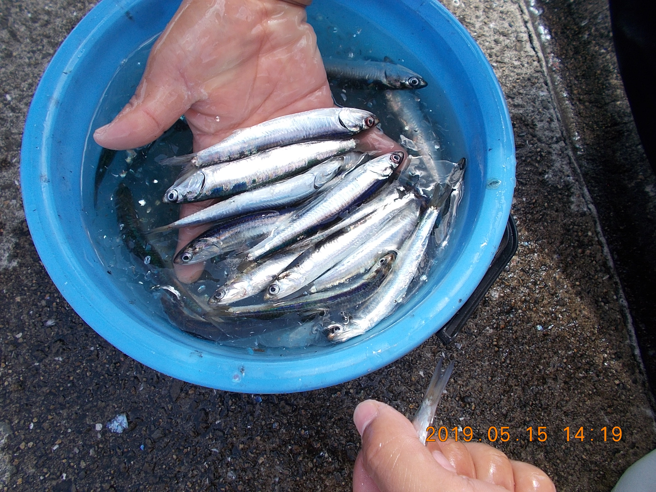 午後2時半、いまにも雨が来そうなどんよりとした曇り空、東寄りの風で海面穏やか。雨の予報で釣り人はほとんどお帰りになりました。いまは数人のみ。カタクチがぱらっと釣れましたが続きません。夕方5時過ぎからカタクチの時合いがあり、多い人で50匹位の釣果となりました。