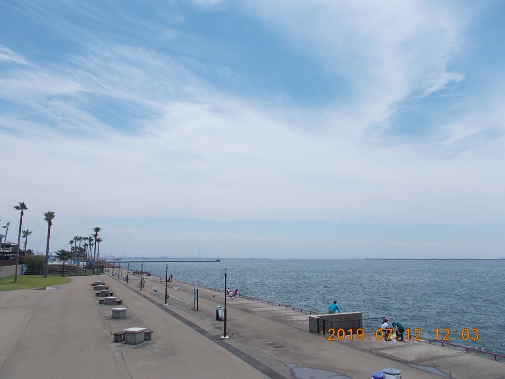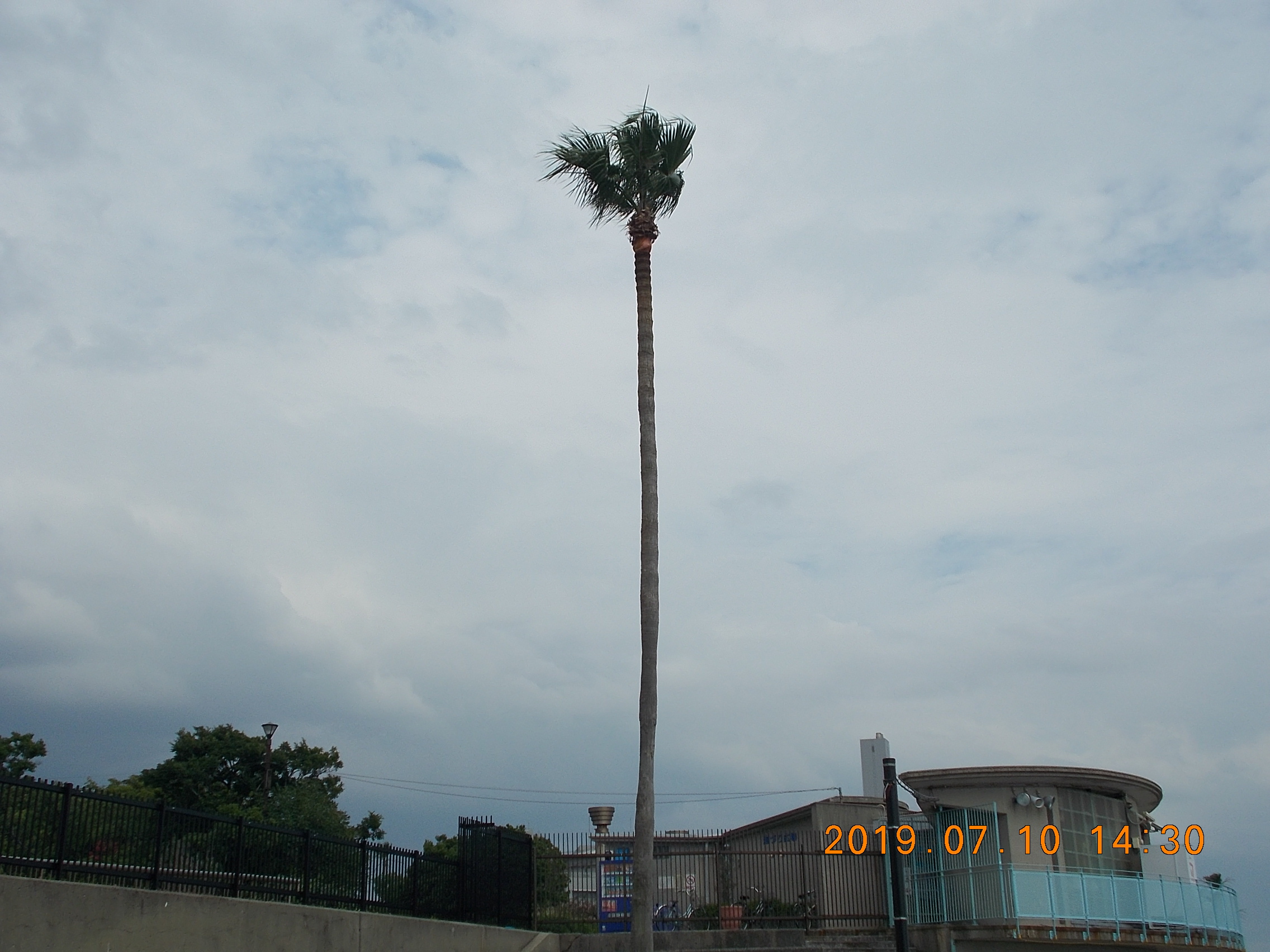 午後2時半現在、風が南にかわり1~2m吹いてきましたので、蒸し暑さがいくぶん和らぎました。サビキその他とも一時小休止状態。剪定してすっきりしたヤシの木(写真)。