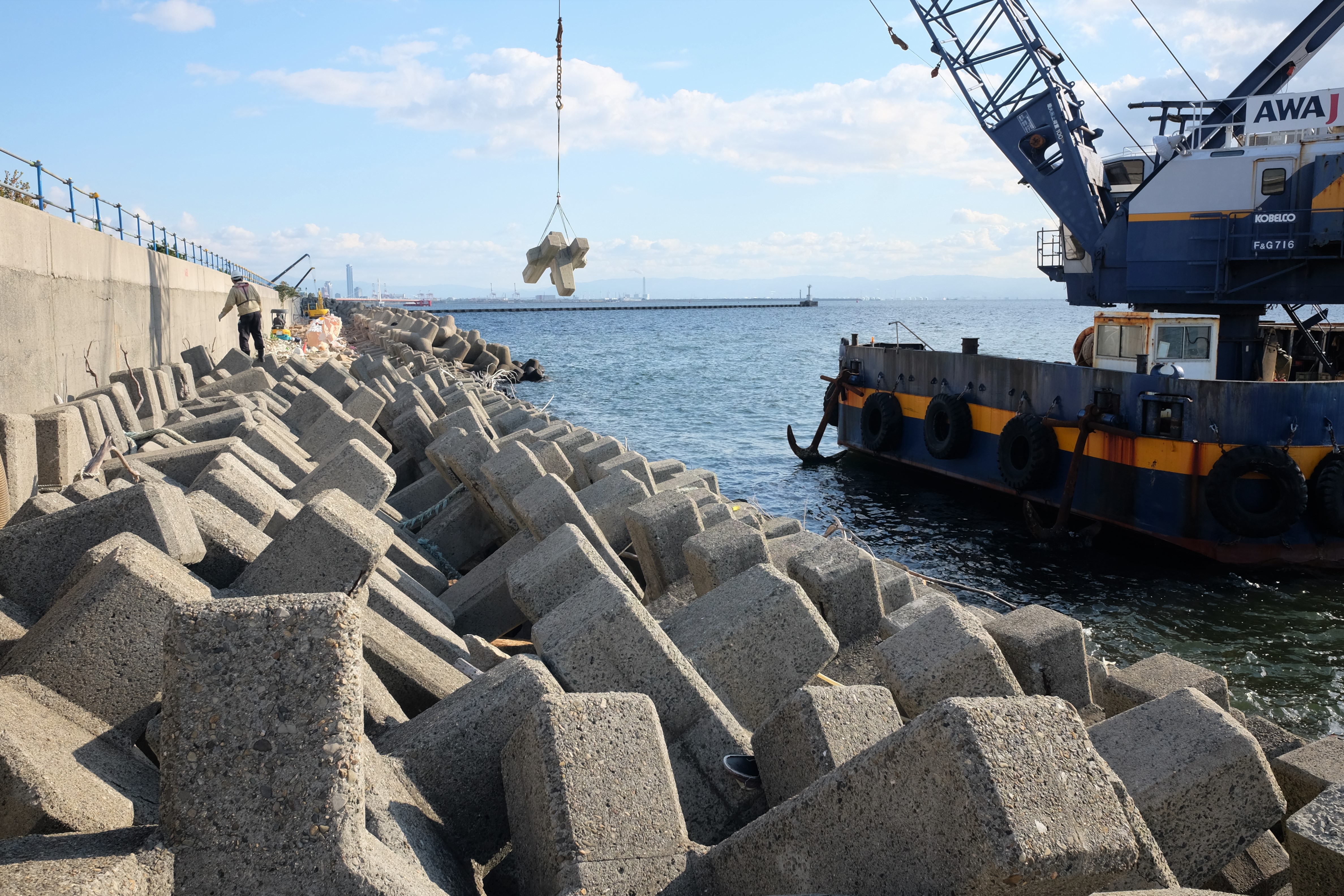 大変急ではありますが、11月12日(木曜日)からクレーン台船での東側のブロック(3t合掌ブロック)を撤去するにあたり、安全確保のためテトラ(ブロック)帯に近い釣り場20mにフェンスを設置し、立ち入り禁止となります。