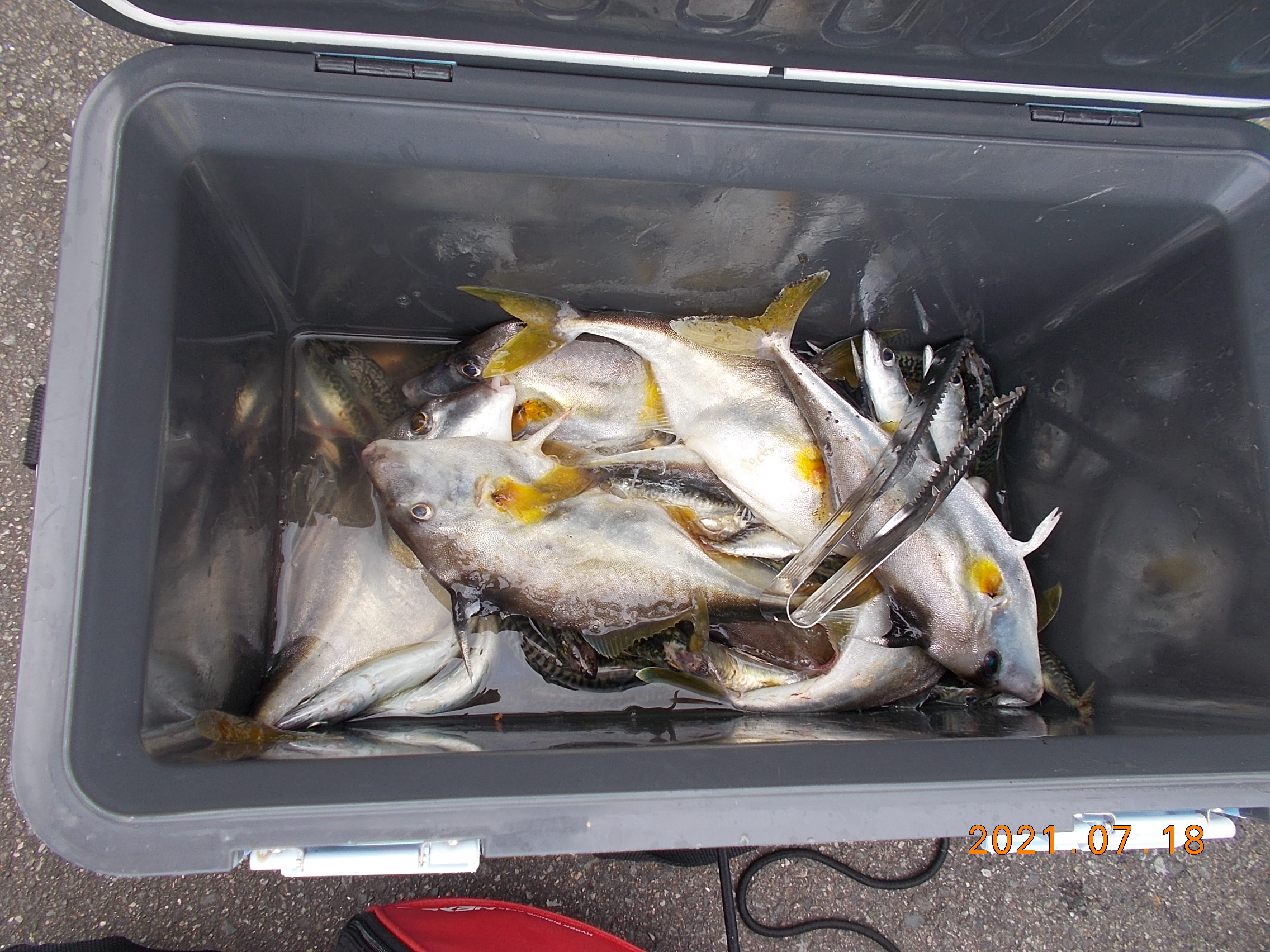 午後3時現在、南西の風2-3m、晴れ、気温31℃。蒸し暑いながら風があるので何とかしのぐことができます。落とし込みの方々はお帰りになり残るはサビキのお客様がほとんどです。先程、東端でゴカイでチヌとギマが釣れました。