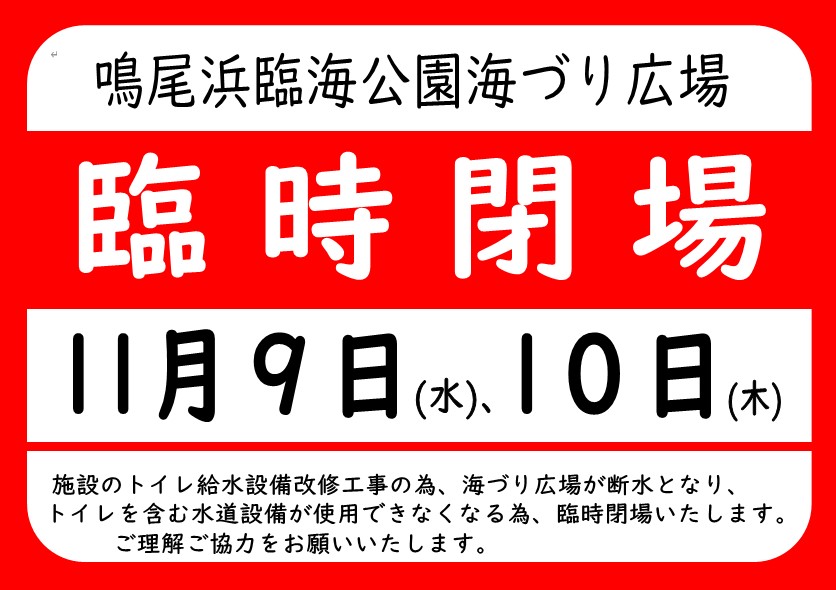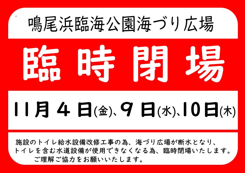 ※11月9日・10日の全面断水を挟み、翌11月11日から海づり広場内の男性和式便器が使用できなくなります。使用不可期間は不明。